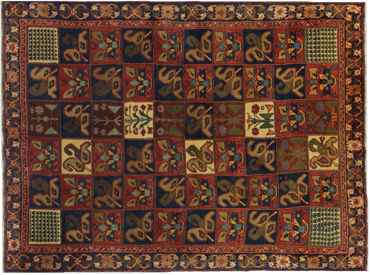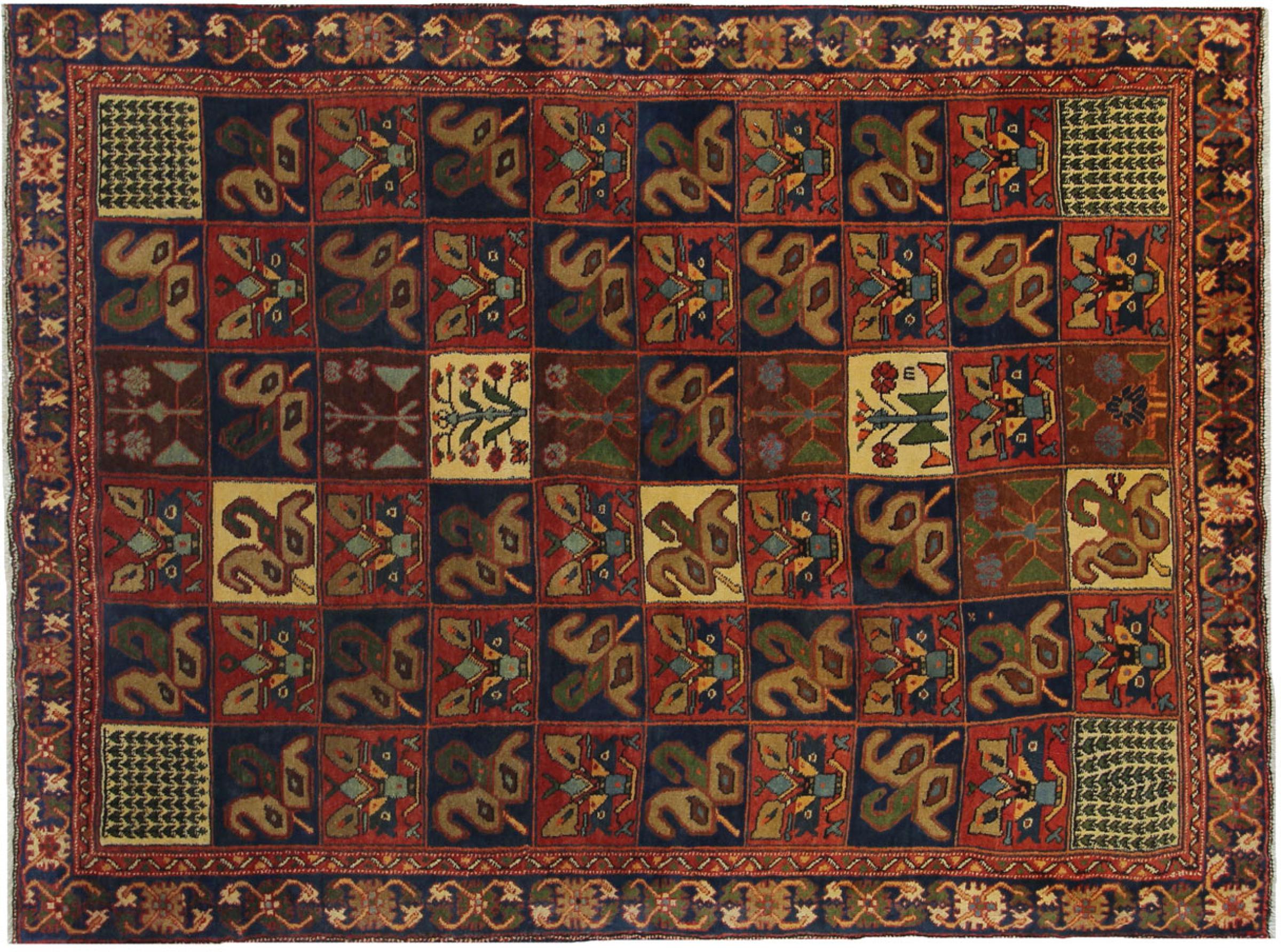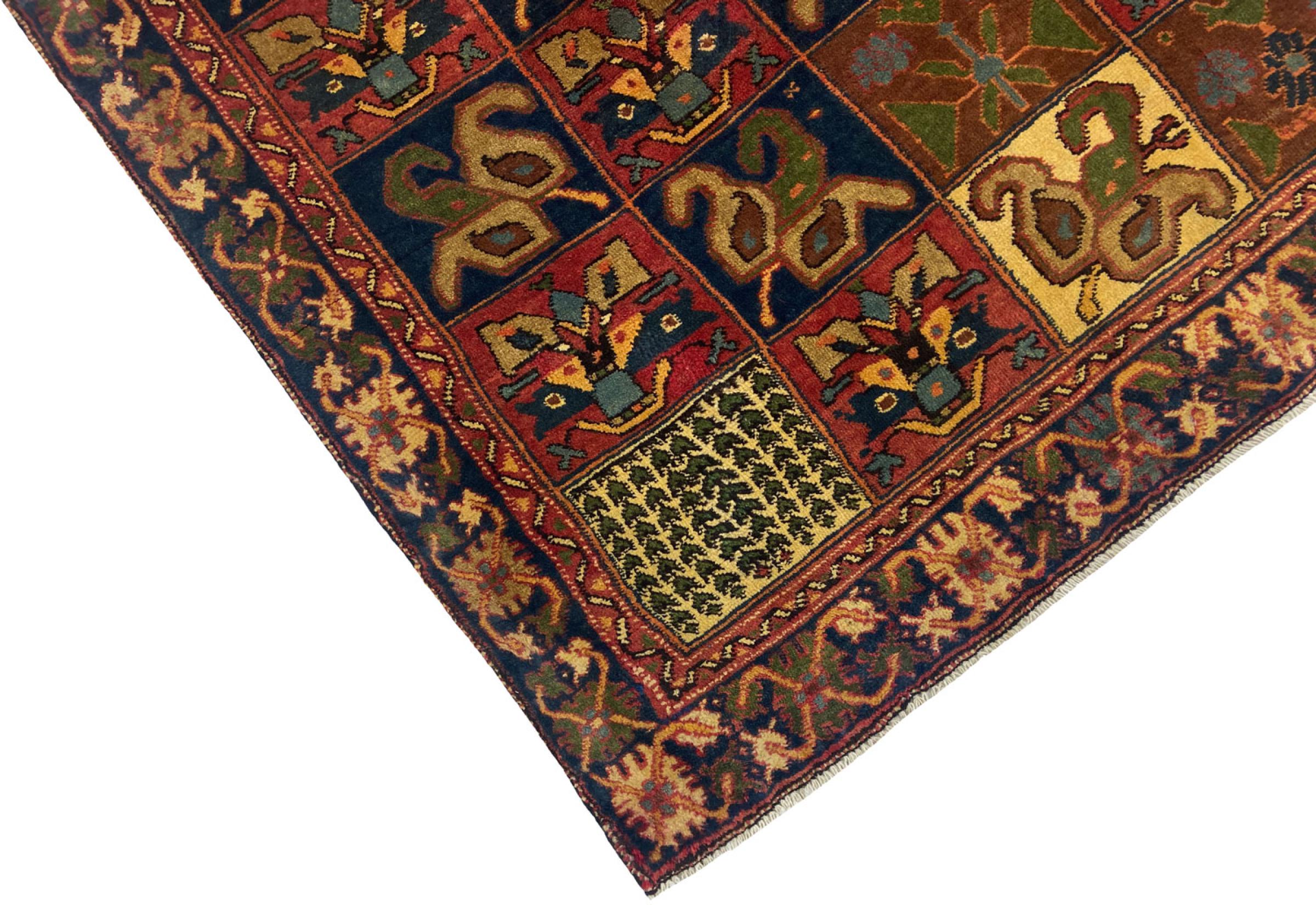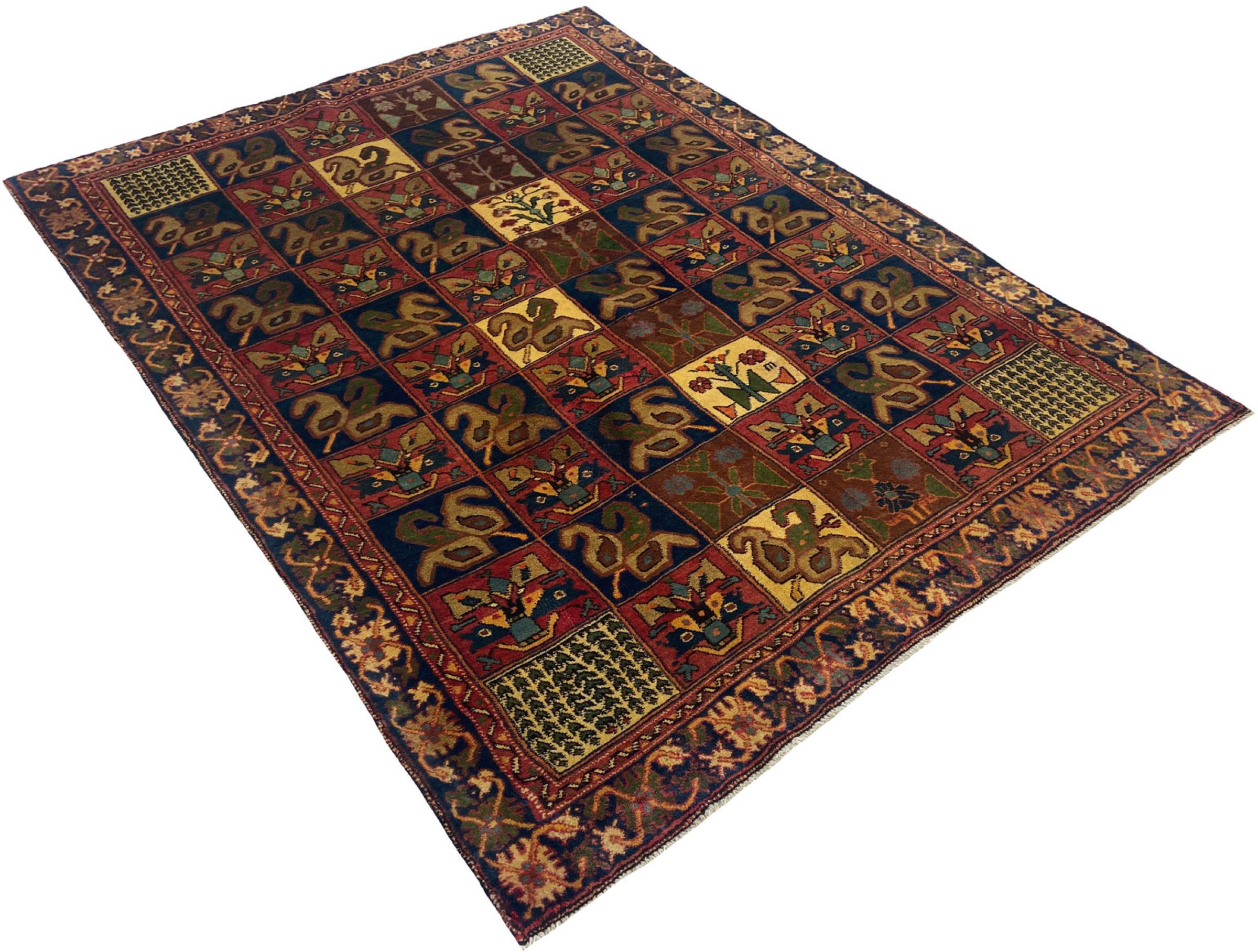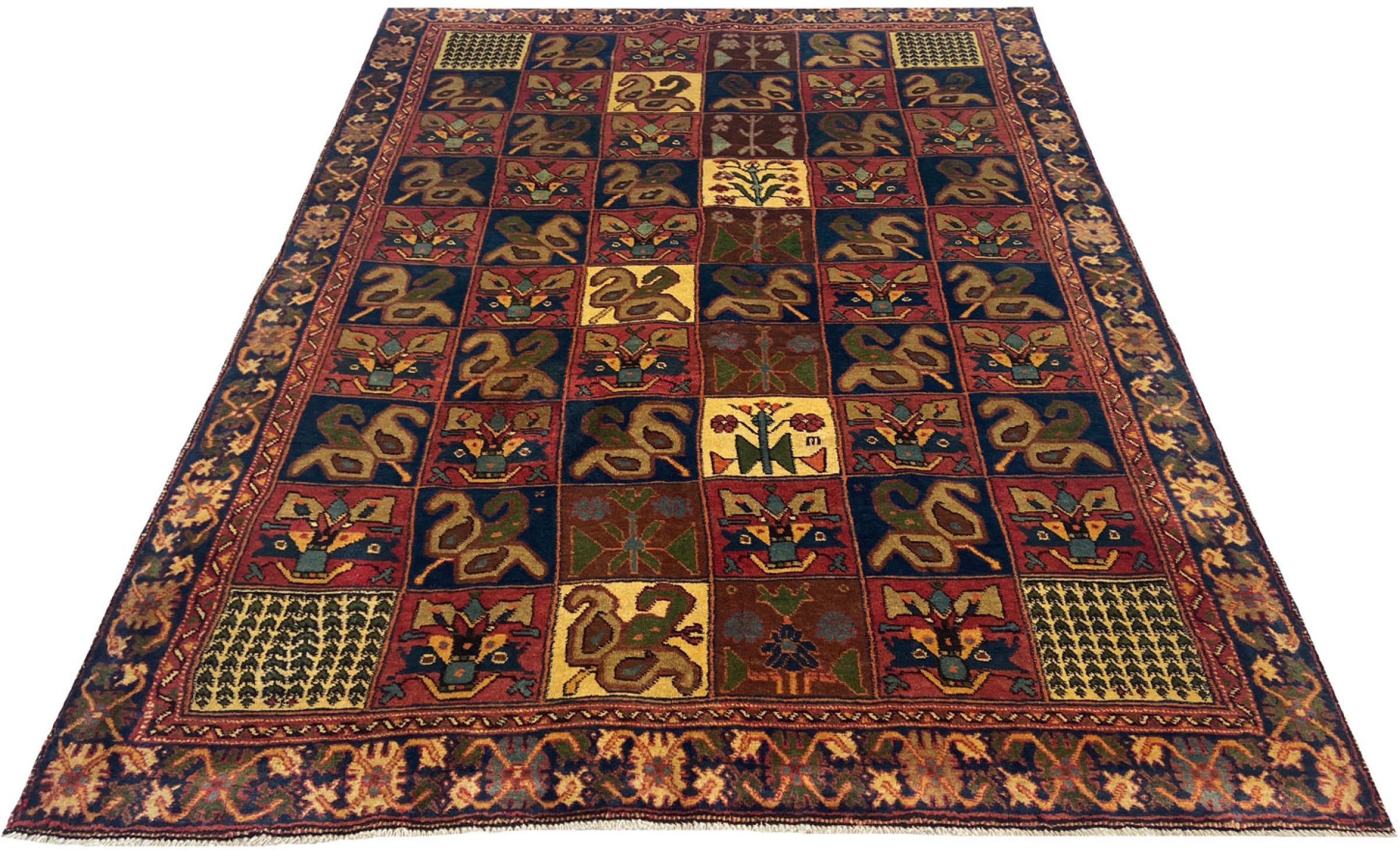 Denne persiske Bakhtiar ble håndknyttet av nomader fra Bakhtiari-stammen. Dette persiske teppet leker med fargene på Orienten i vakre mønstre. Utformingen av ornamentene er inspirert av persiske hager. Den såkalte tradisjonelle hagedesignen har blitt veldig populær i den vestlige verden gjennom årene. Den høye knutetettheten, i kombinasjon med det sterke garnet, lover langvarig glede av persisk teppekunst.