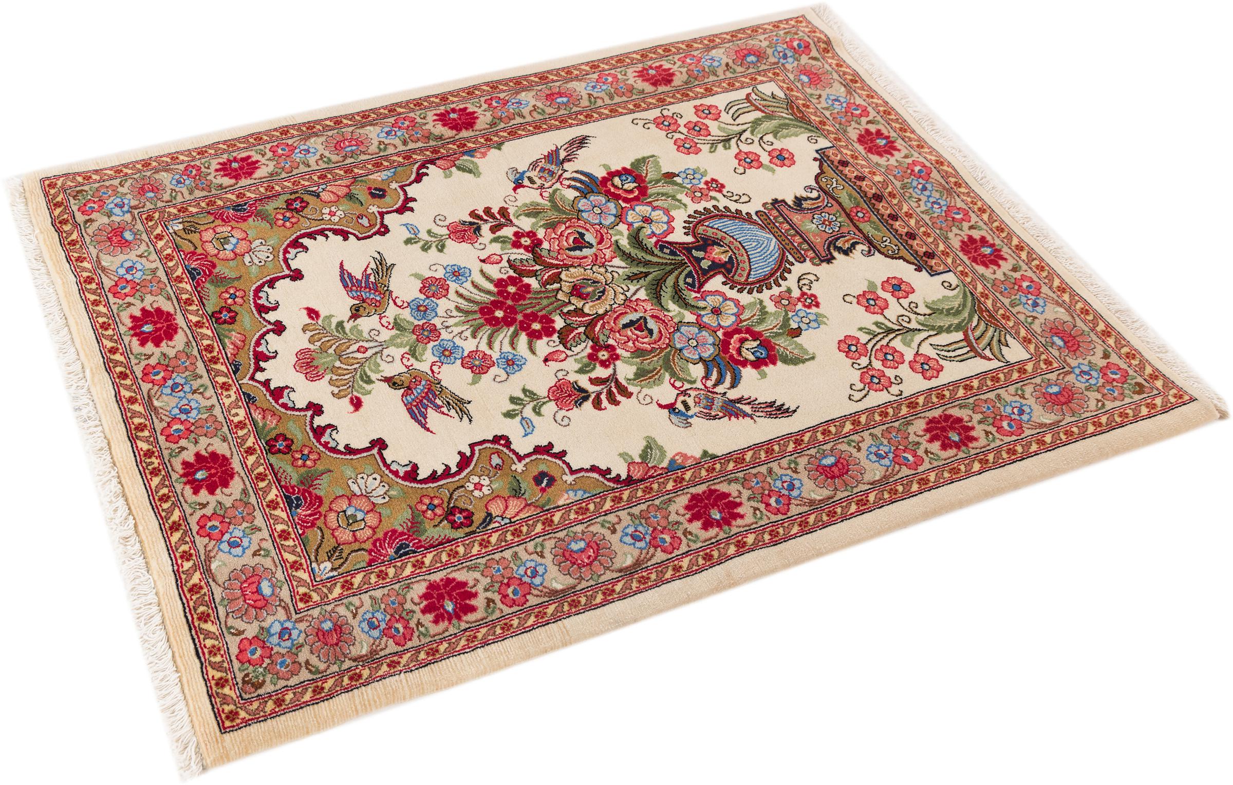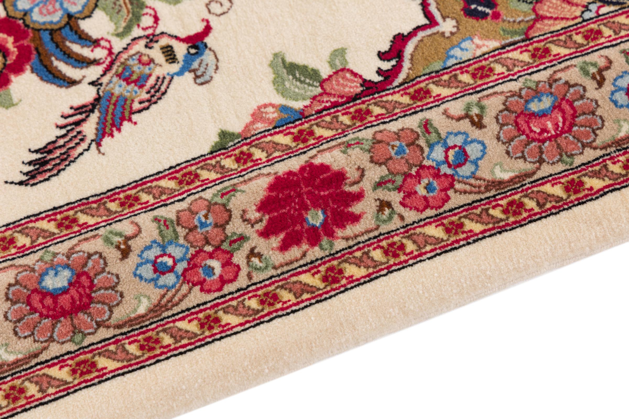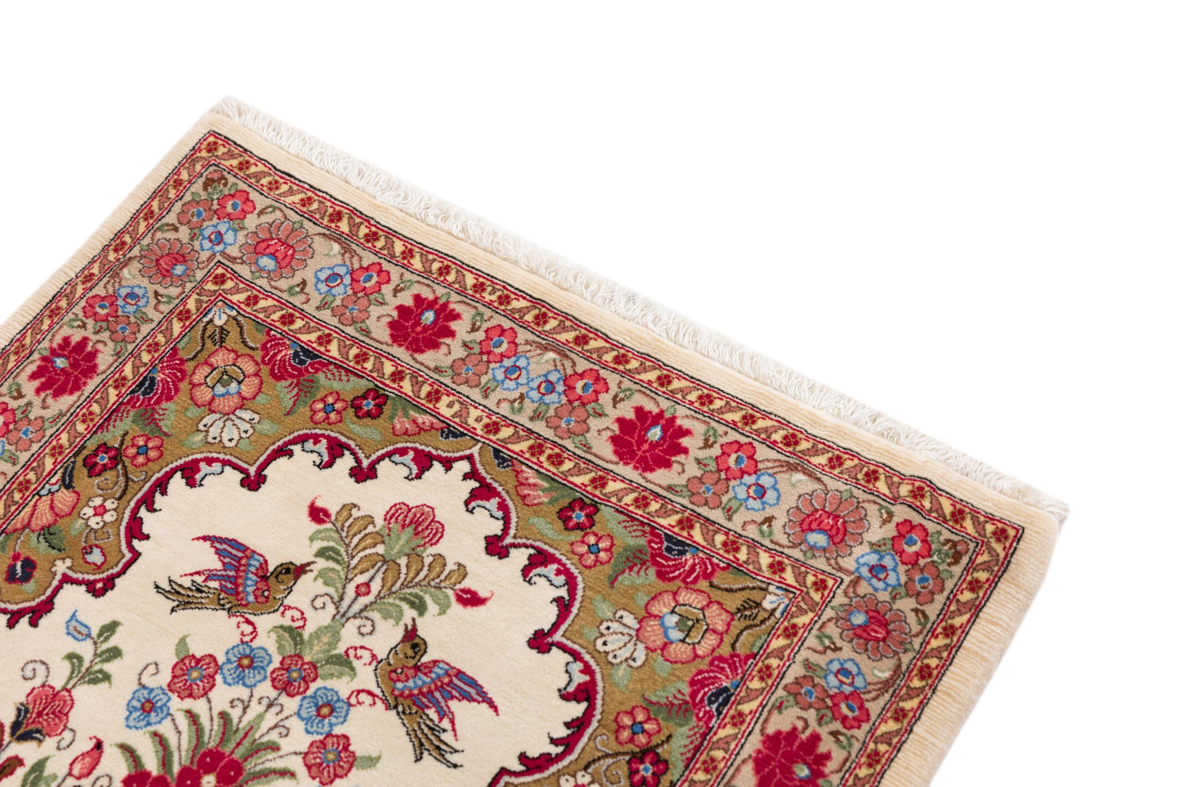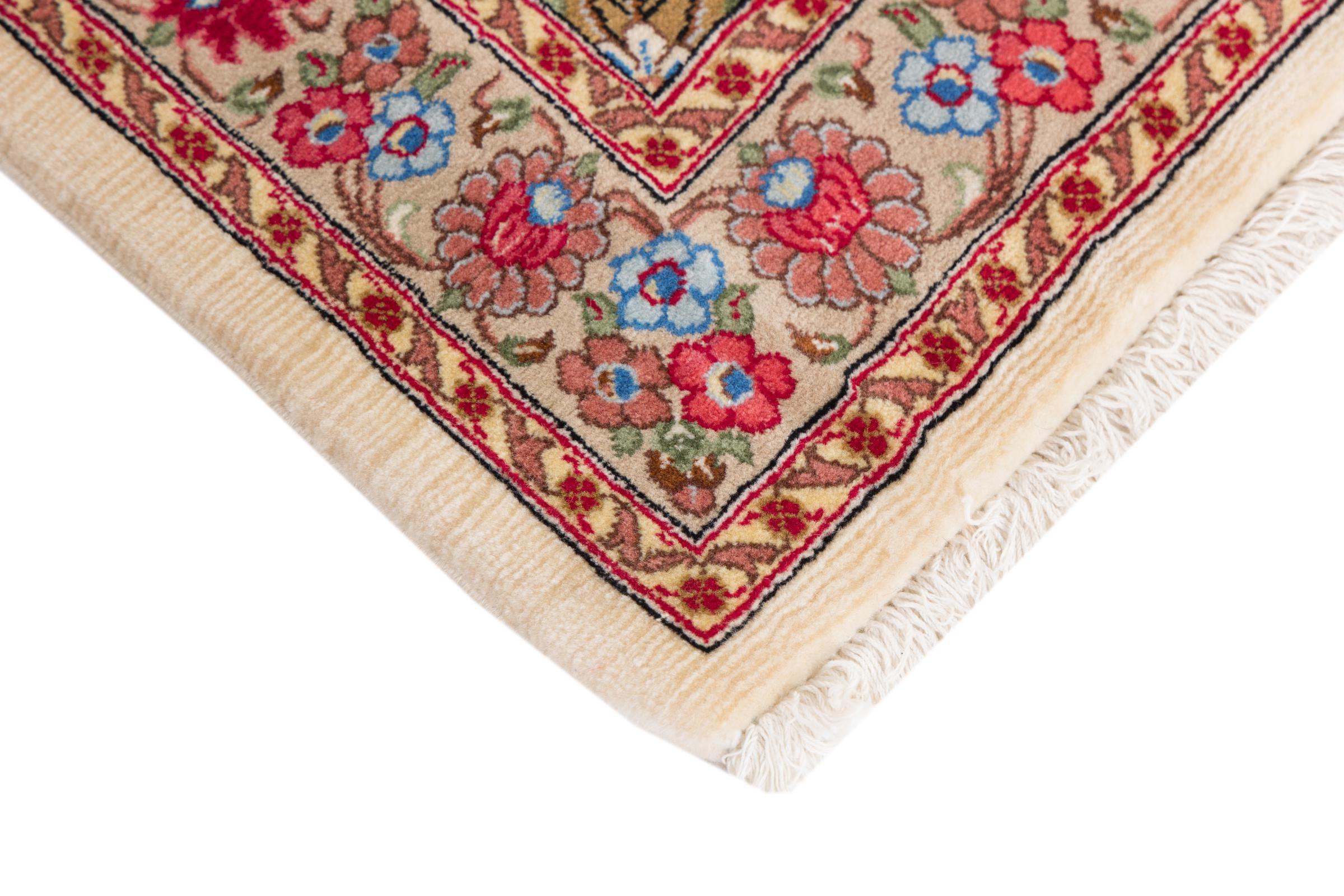 Dette Ghom kork teppet er ekte håndtverkskunst. Flooren og kjedene vil overbevise enhver teppekjenner. Dette persiske teppet ble håndknyttet av fineste korkull. Mønstrene og fargene lar ditt hjerte slå høyere, flottere kann et persisk teppe ikke være.