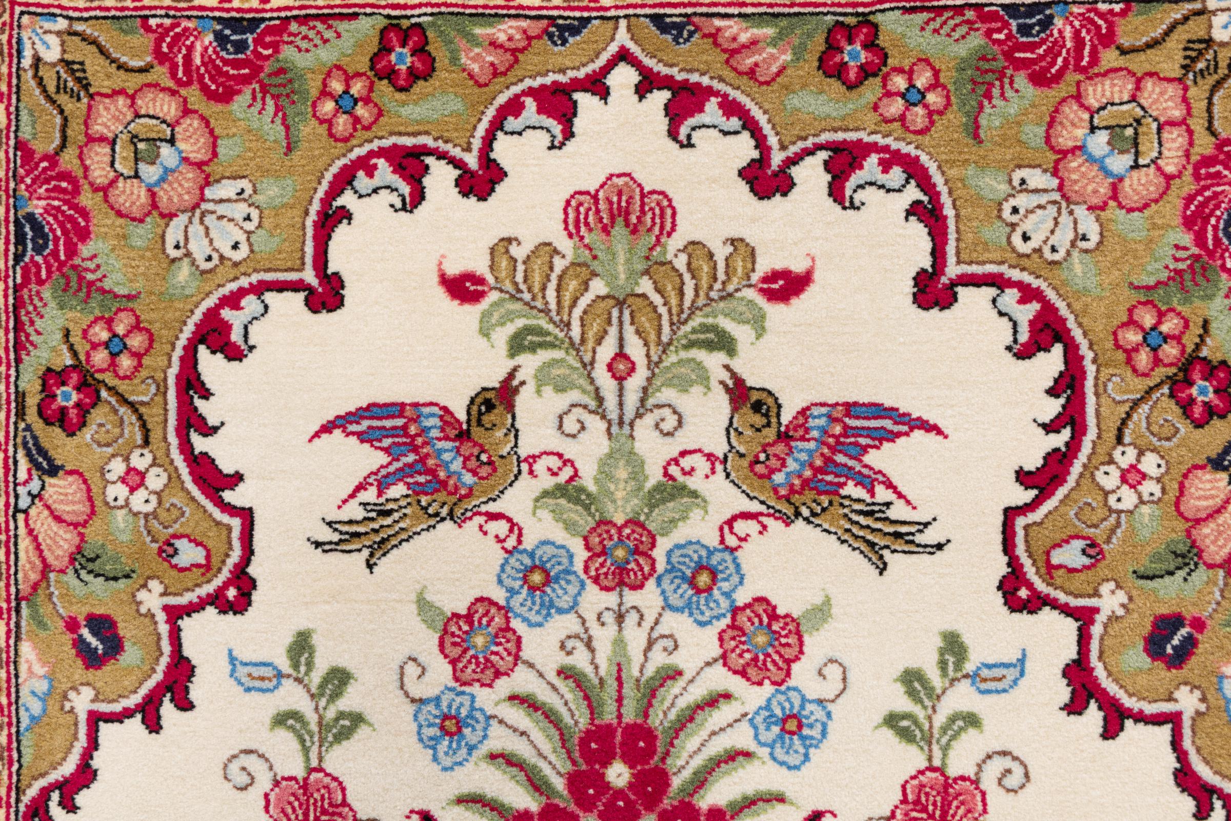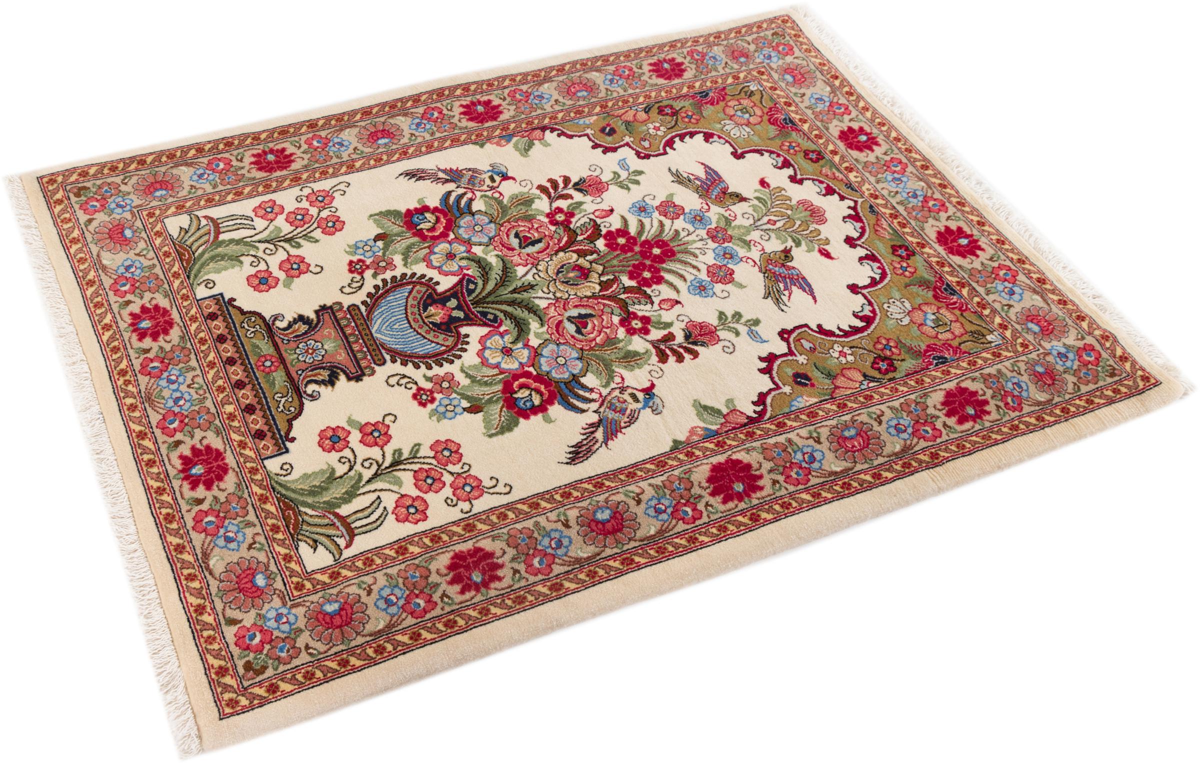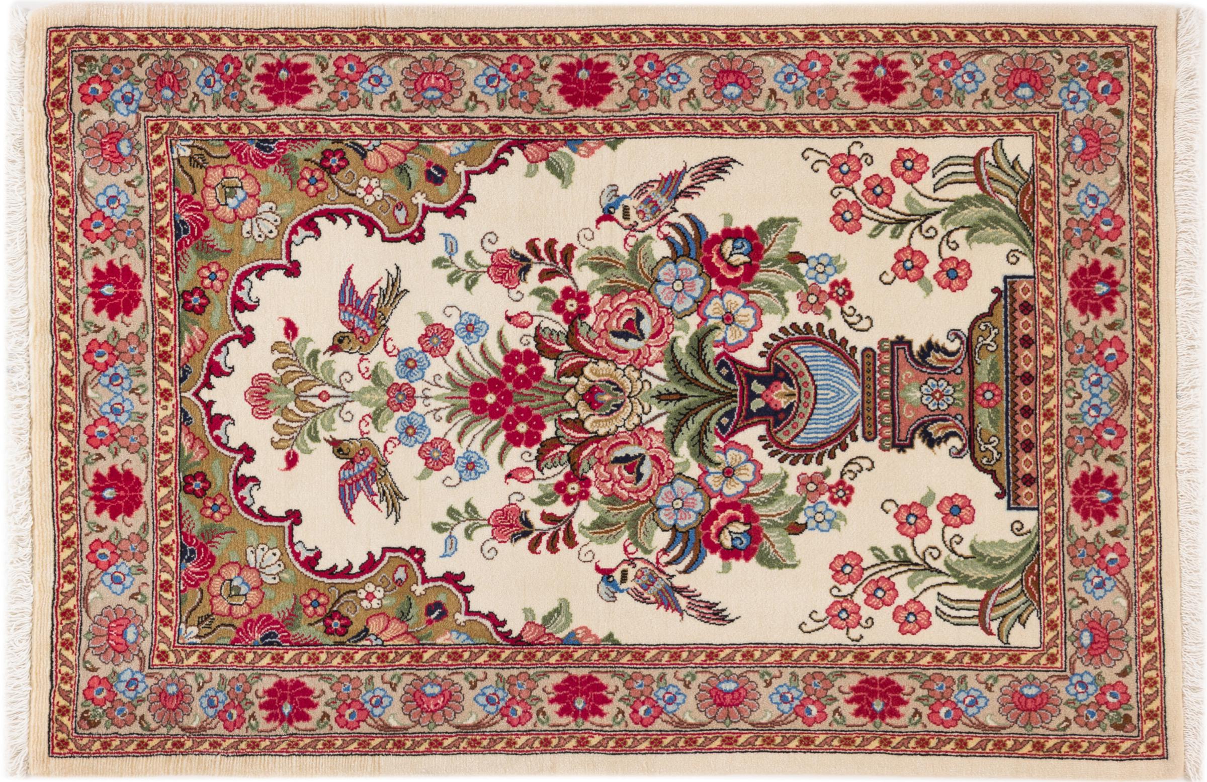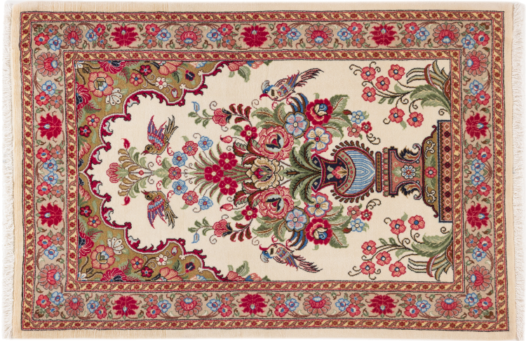 Dette Ghom kork teppet er ekte håndtverkskunst. Flooren og kjedene vil overbevise enhver teppekjenner. Dette persiske teppet ble håndknyttet av fineste korkull. Mønstrene og fargene lar ditt hjerte slå høyere, flottere kann et persisk teppe ikke være.