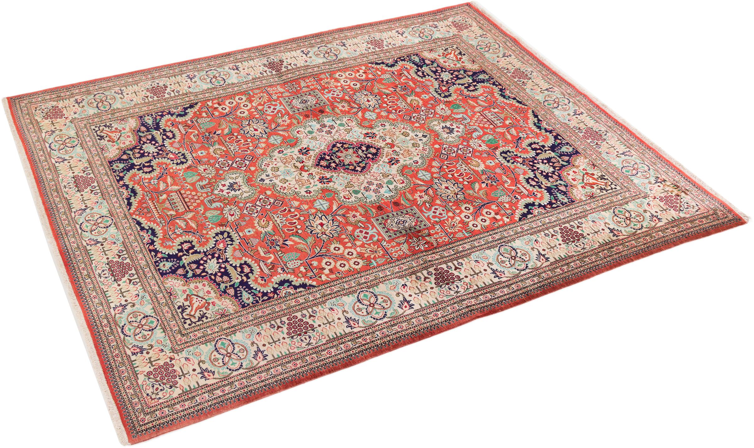Teppenummer: 29804300525 Størrelse: 198x138 cm Tykkelse: ca. 3 mm Knuter: 810 000 / m² Bearbeiding: Knyttet for hånd Søm: Silke Kjede: Silke Opprinnelse: Persia / Iran Alder: Nytt Vekt: ca. 5 kg Antall på lager: Unikt - Kun 1 stk i lager