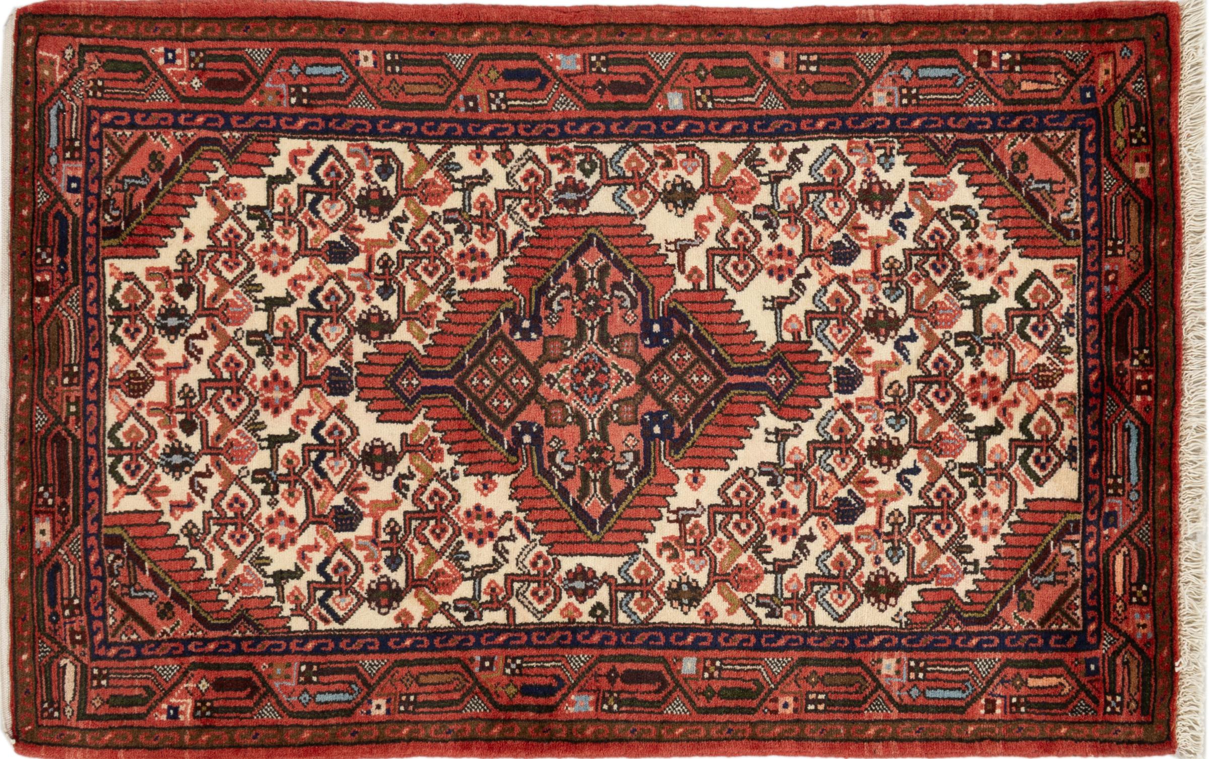 Teppenummer: 297165006180216 Størrelse: 127x79 cm Tykkelse: ca. 8 mm Knuter: 128 000 - 160 000 / m² Bearbeiding: Knyttet for hånd Søm: Ull Kjede: Bomull Opprinnelse: Persia / Iran Alder: Nytt Vekt: ca. 4 kg Også kjent som Huseinabad Antall på lager: Unikt - Kun 1 stk i lager