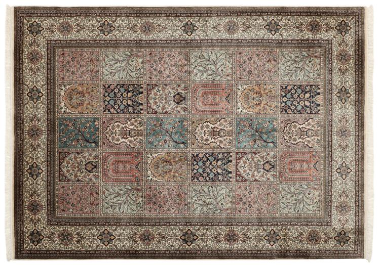 Dette håndknyttede silketeppet fra Kaschmir gjenspeiler ferdighetene til teppeknytteren. De beste matrialiene og flotteste mønstrene blir brukt til å lage et stykke indisk luksus til deg.