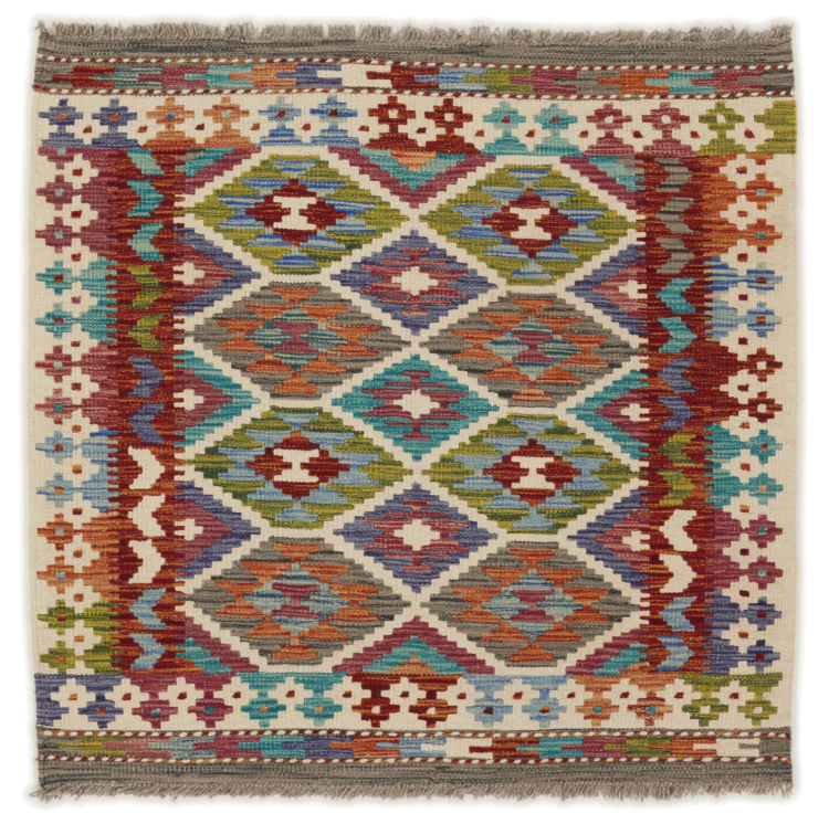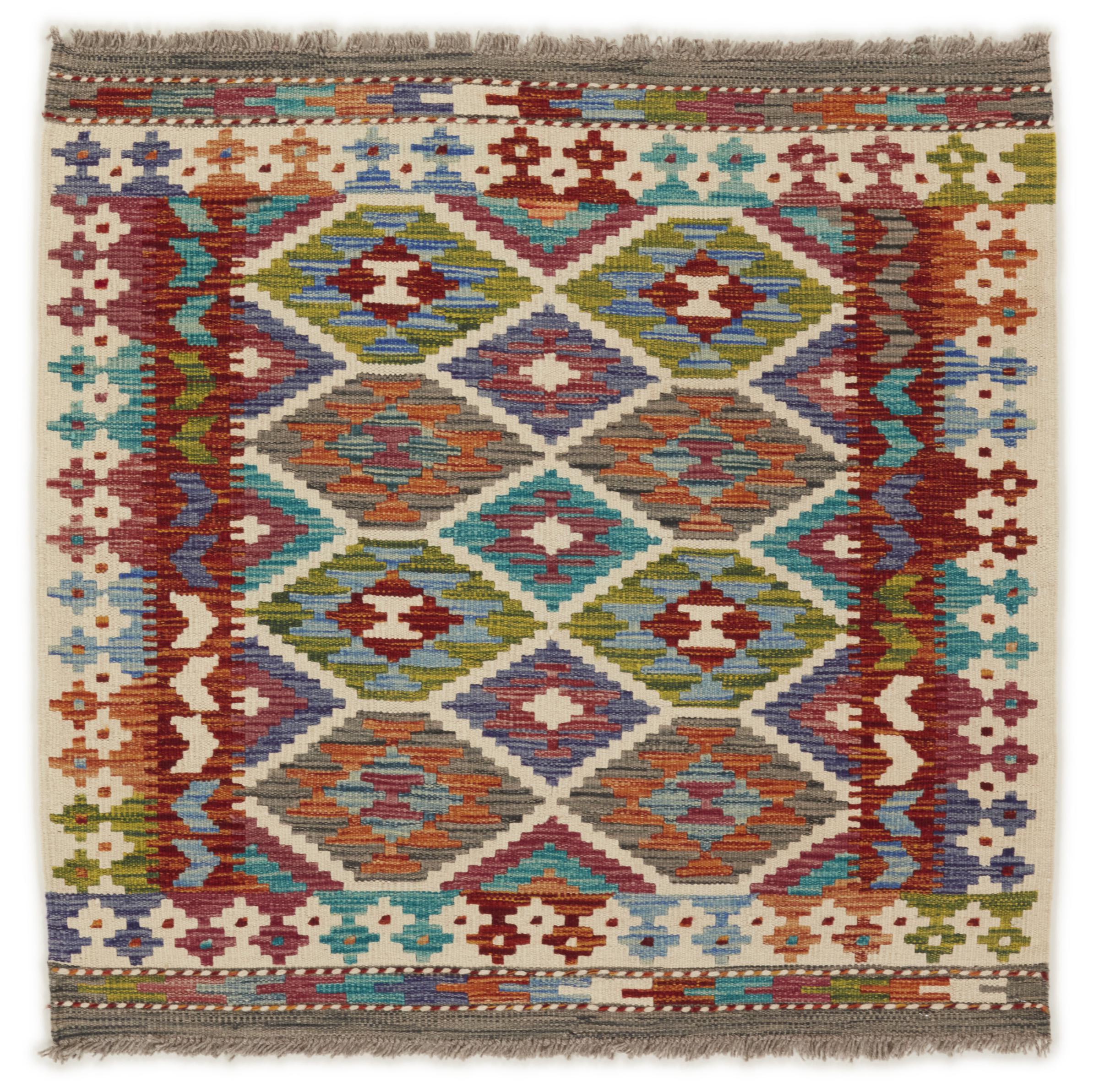 Teppenummer: 291964001348500 Størrelse: 99x102 cm Tykkelse: ca. 3 mm Bearbeiding: Handwoven Søm: Håndspunnet Ull Kjede: Ull Opprinnelse: Afghanistan Alder: Nytt Vekt: ca. 2 kg Antall på lager: Unikt - Kun 1 stk i lager