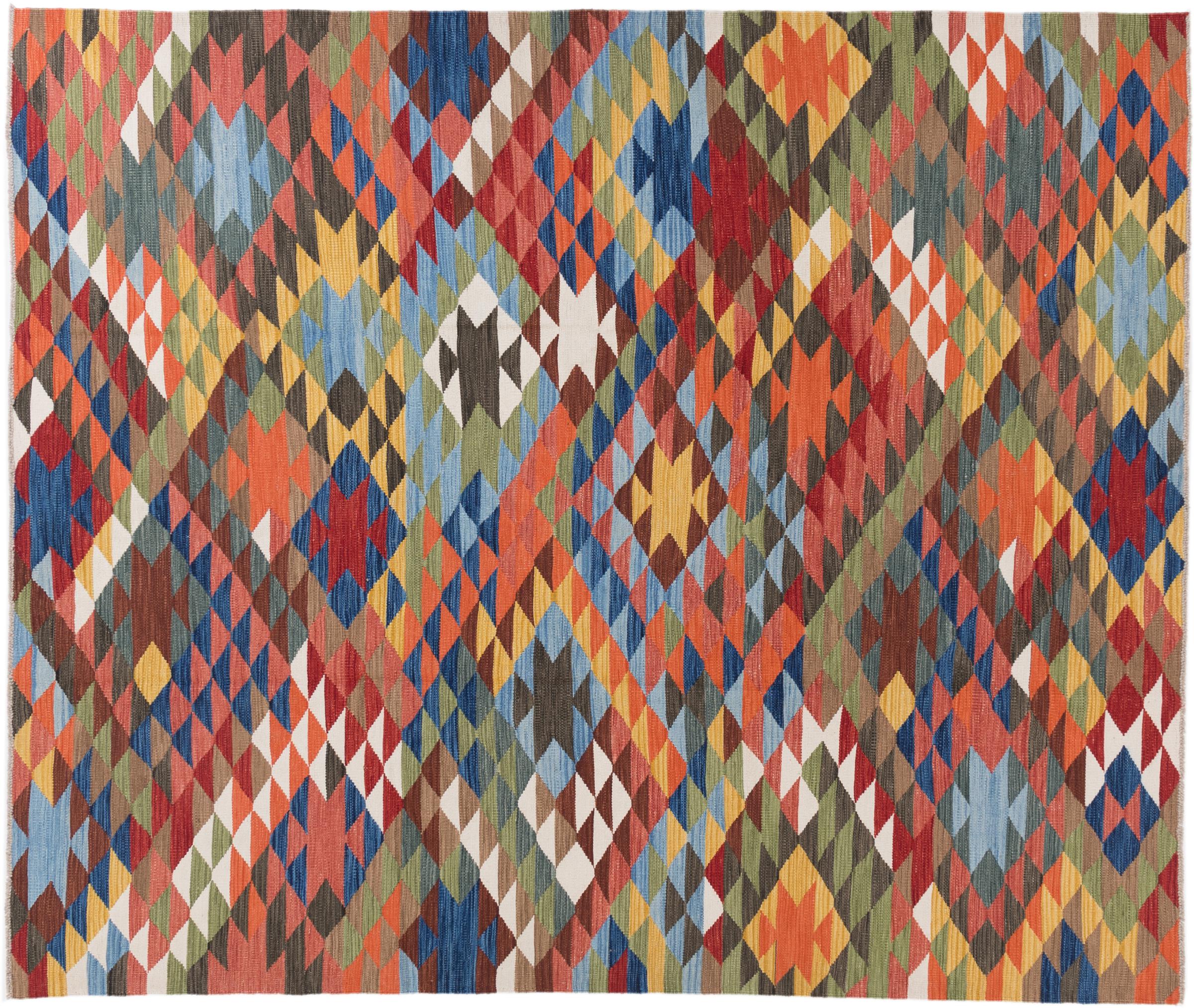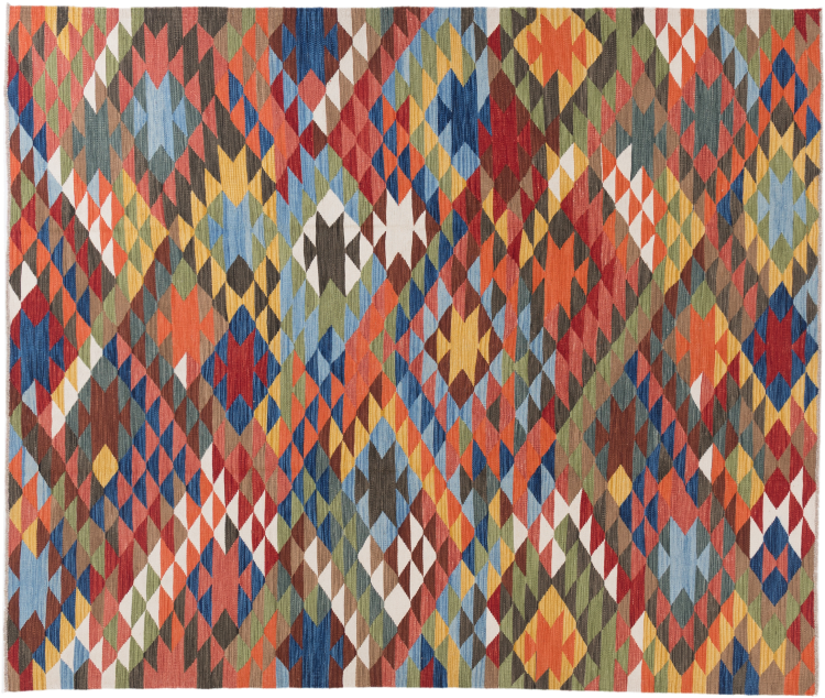 Teppenummer: 2942040046857 Størrelse: 297x251 cm Tykkelse: ca. 3 mm Bearbeiding: Handwoven Søm: Håndspunnet Ull Kjede: Ull Opprinnelse: Afghanistan Alder: Nytt Vekt: ca. 11 kg Også kjent som Kilim, Qilim, Chilim, Afgan, Afghán Antall på lager: Unikt - Kun 1 stk i lager
