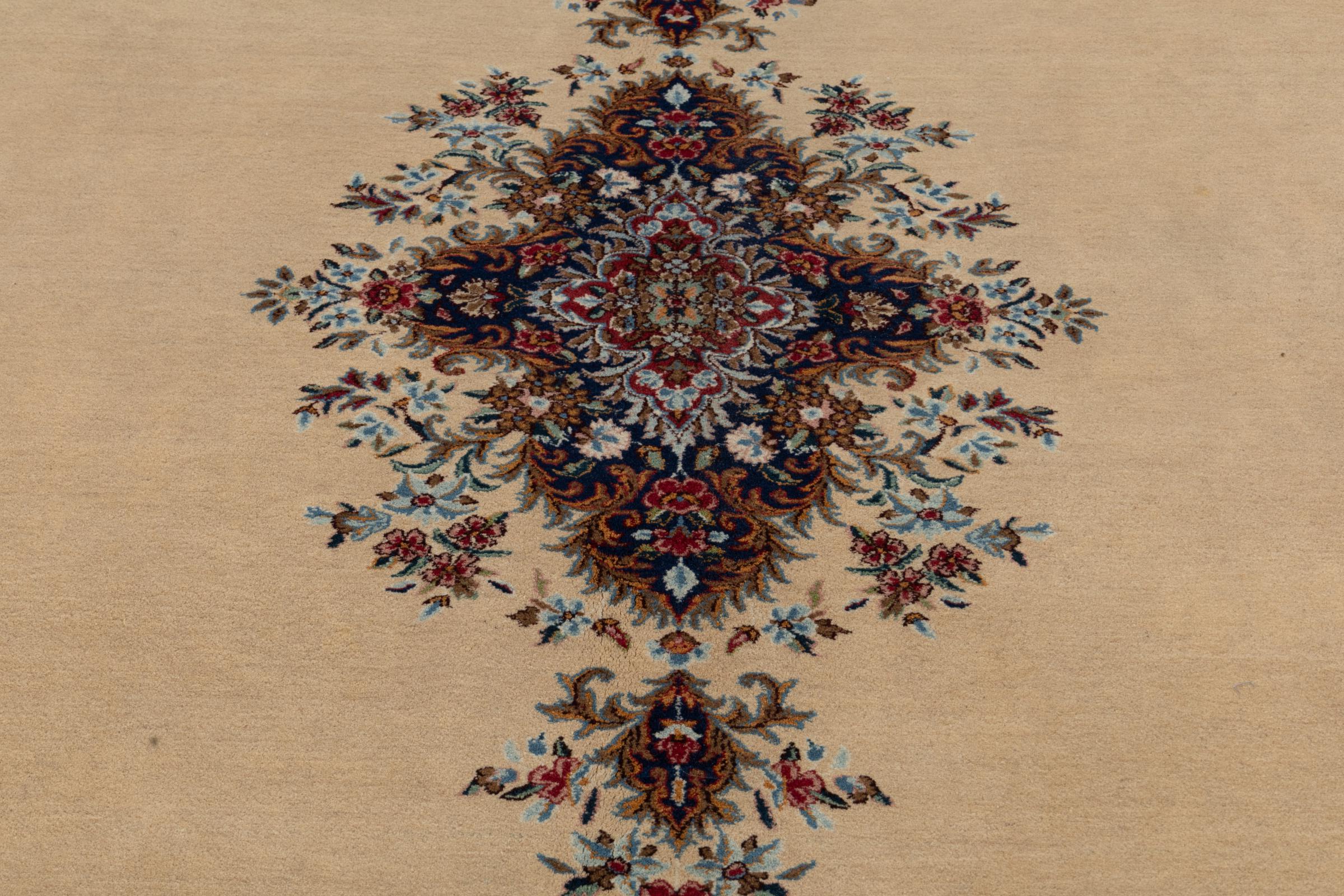 Dette Kerman teppet overbeviser : Kvalitet og design stemmer. Det ble fremstilt av ull i høy kvalitet i byen Kerman, en oase i ørkenen langt borte fra Theran. Overbevis deg selv. La ditt hjem lyse opp gjennom dette persiske teppet.