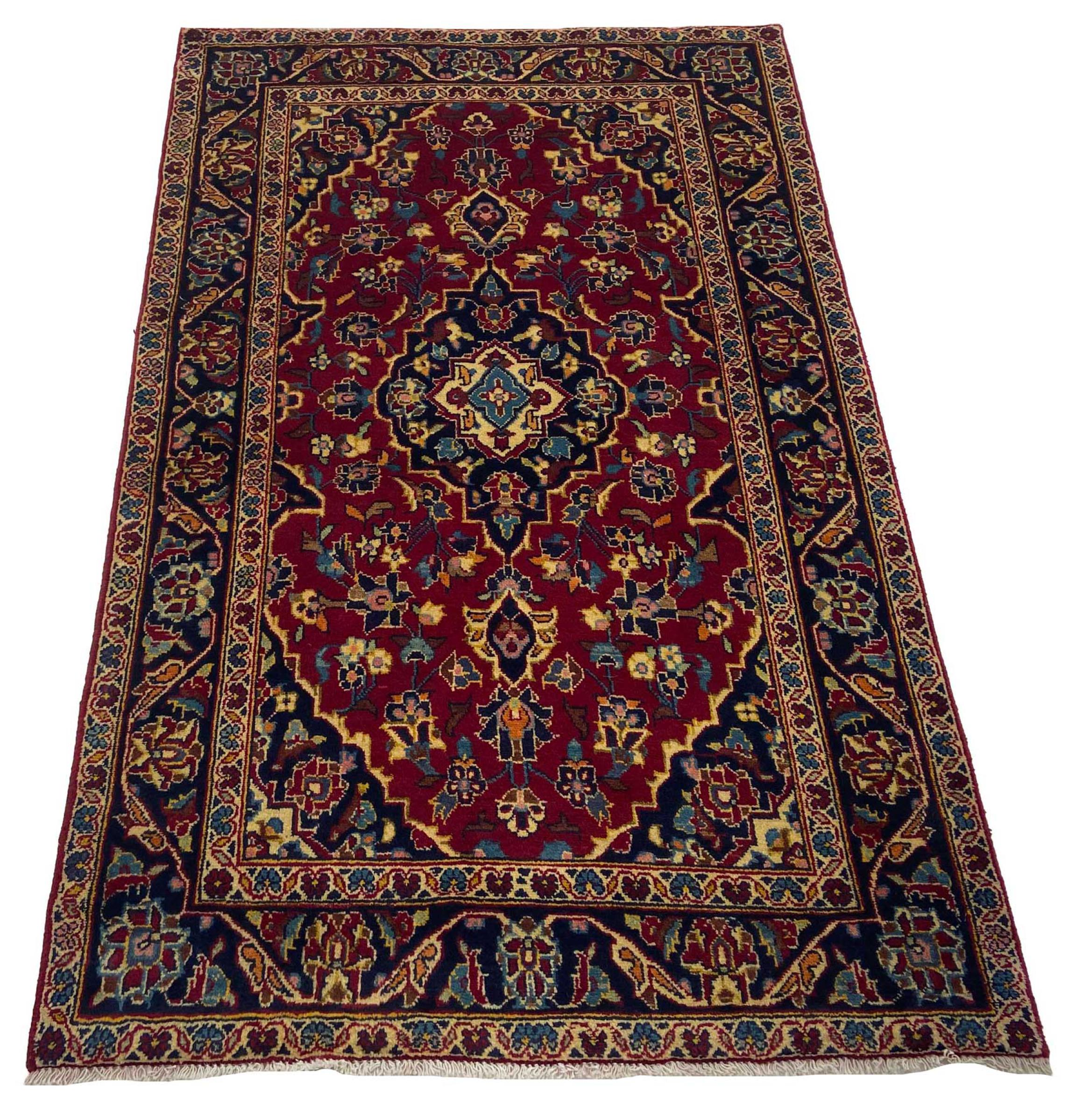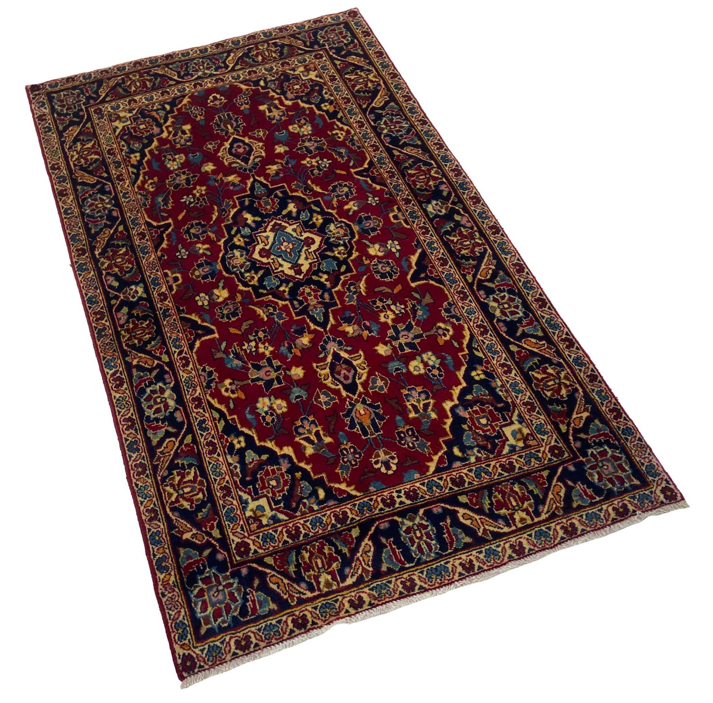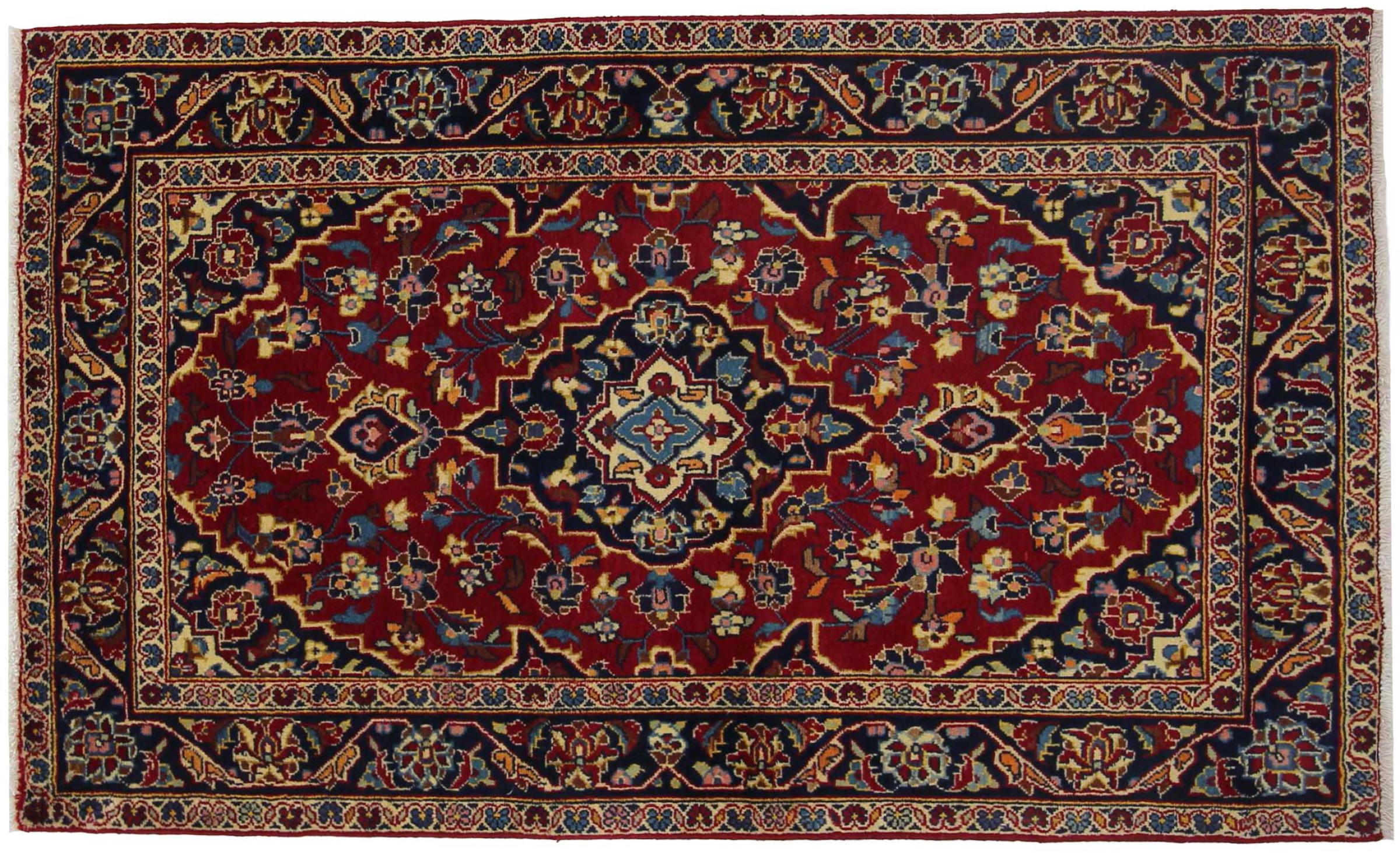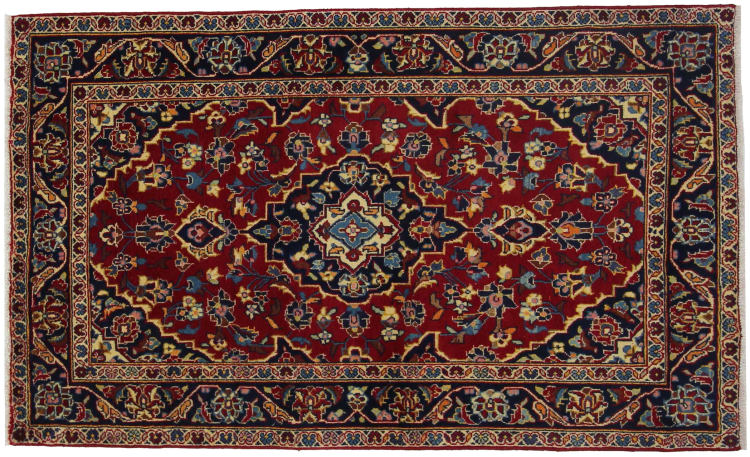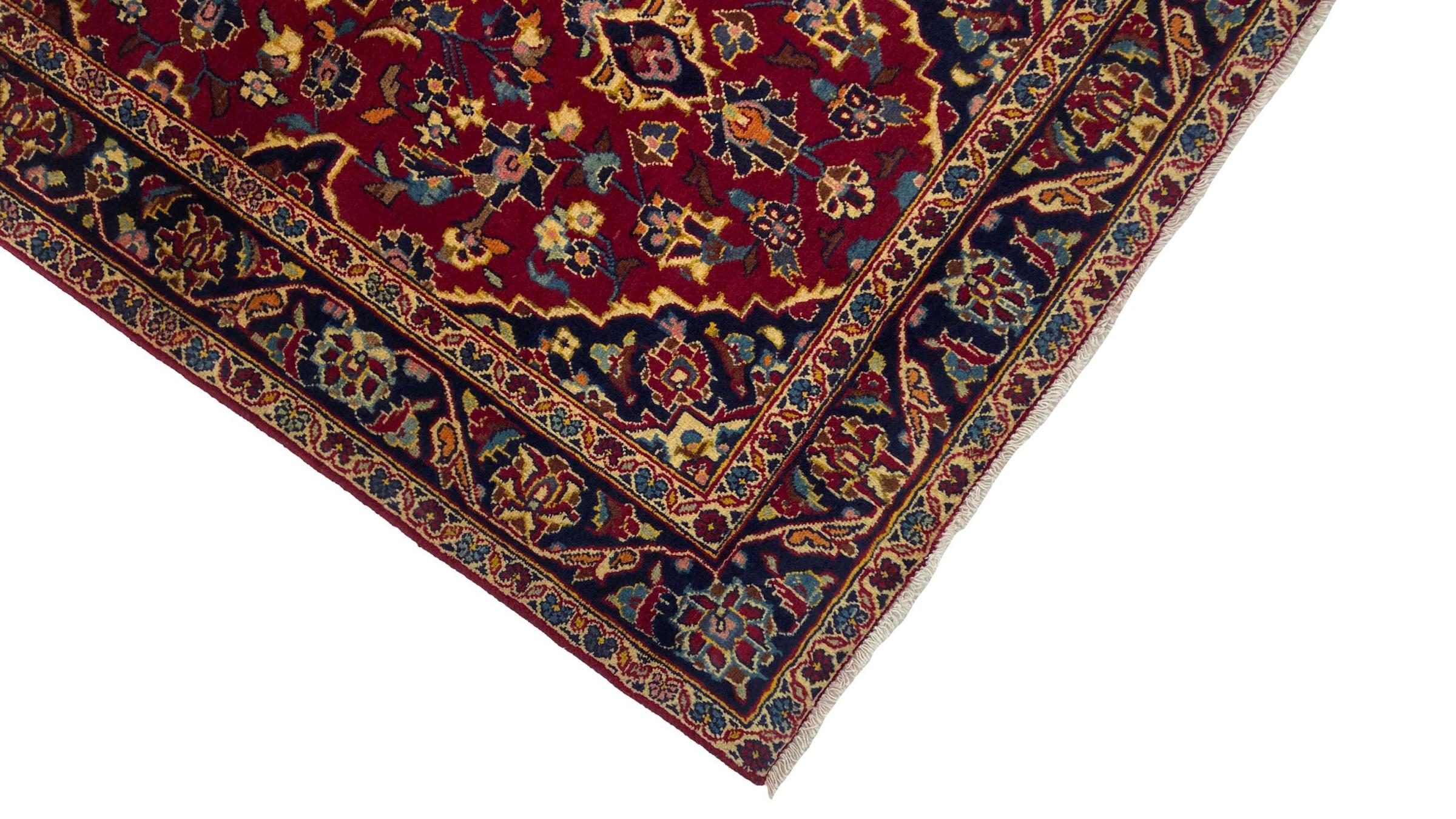 Dette teppet fra Kashan (Keshan) er holdt i sitt svært tradisjonelle og typiske persiske design med vakre ornamenter. Kashan-tepper er svært populære på grunn av deres eksepsjonelt elegante design. Disse teppene stammer fra Kashan, en by på den gamle Silkeveien. Dette teppet er håndknyttet av høykvalitets saueull og kommer til å bli et unikt høydepunkt i hjemmet ditt.