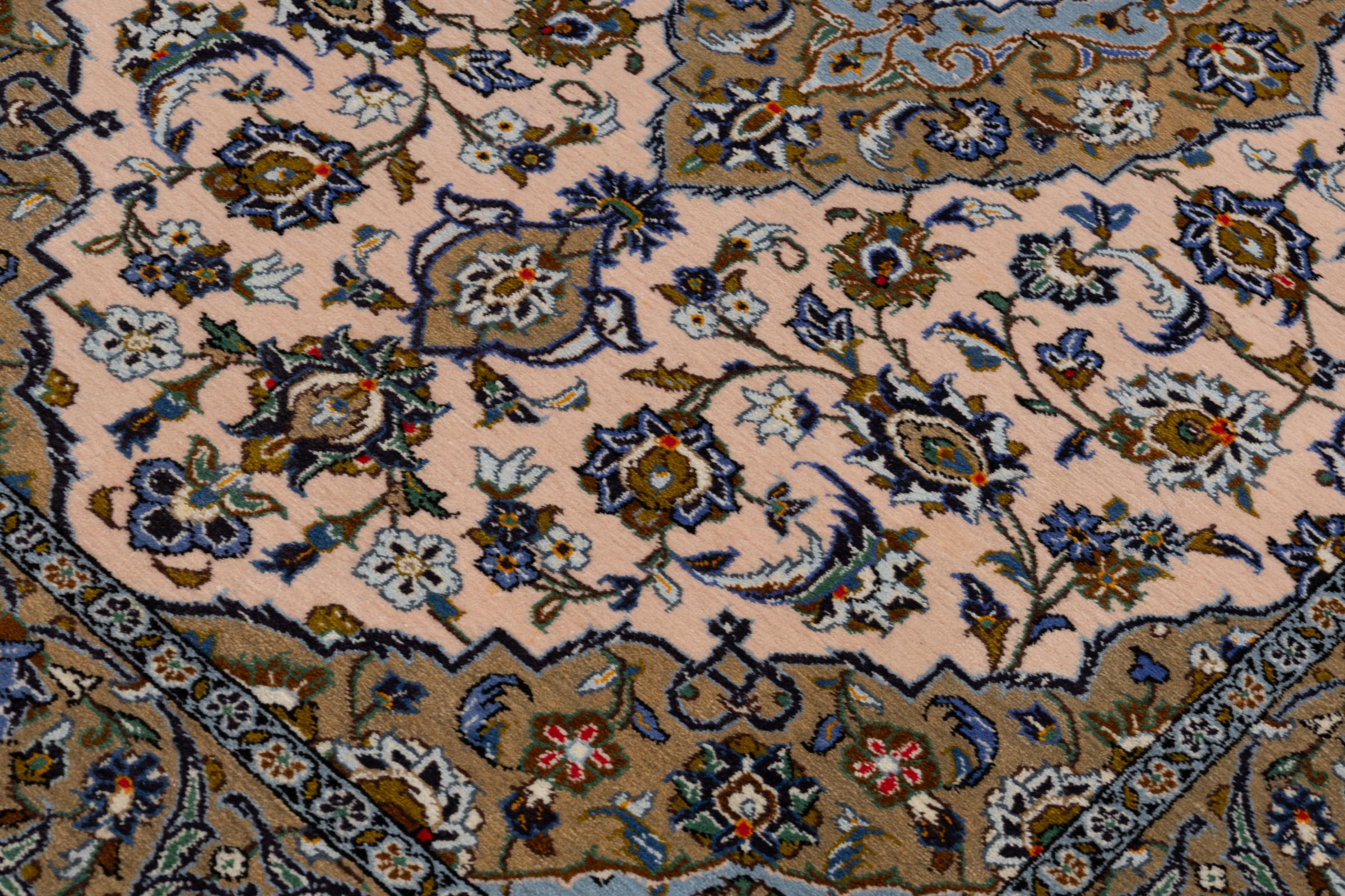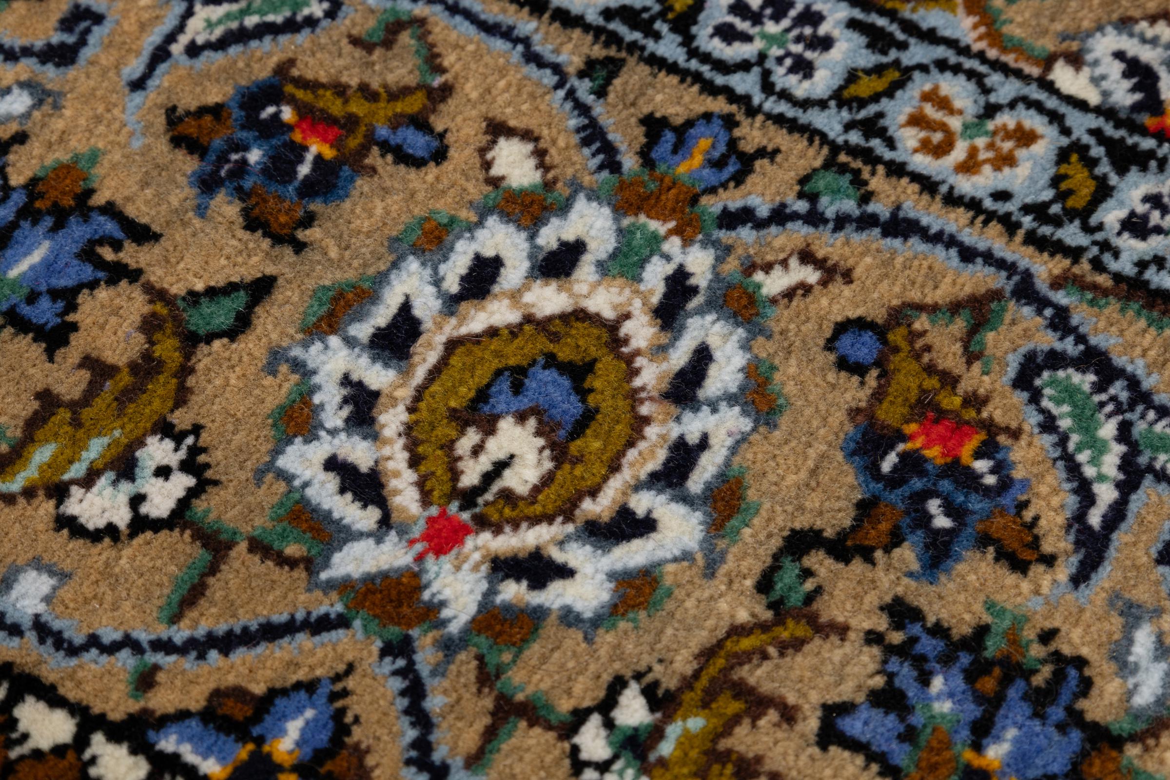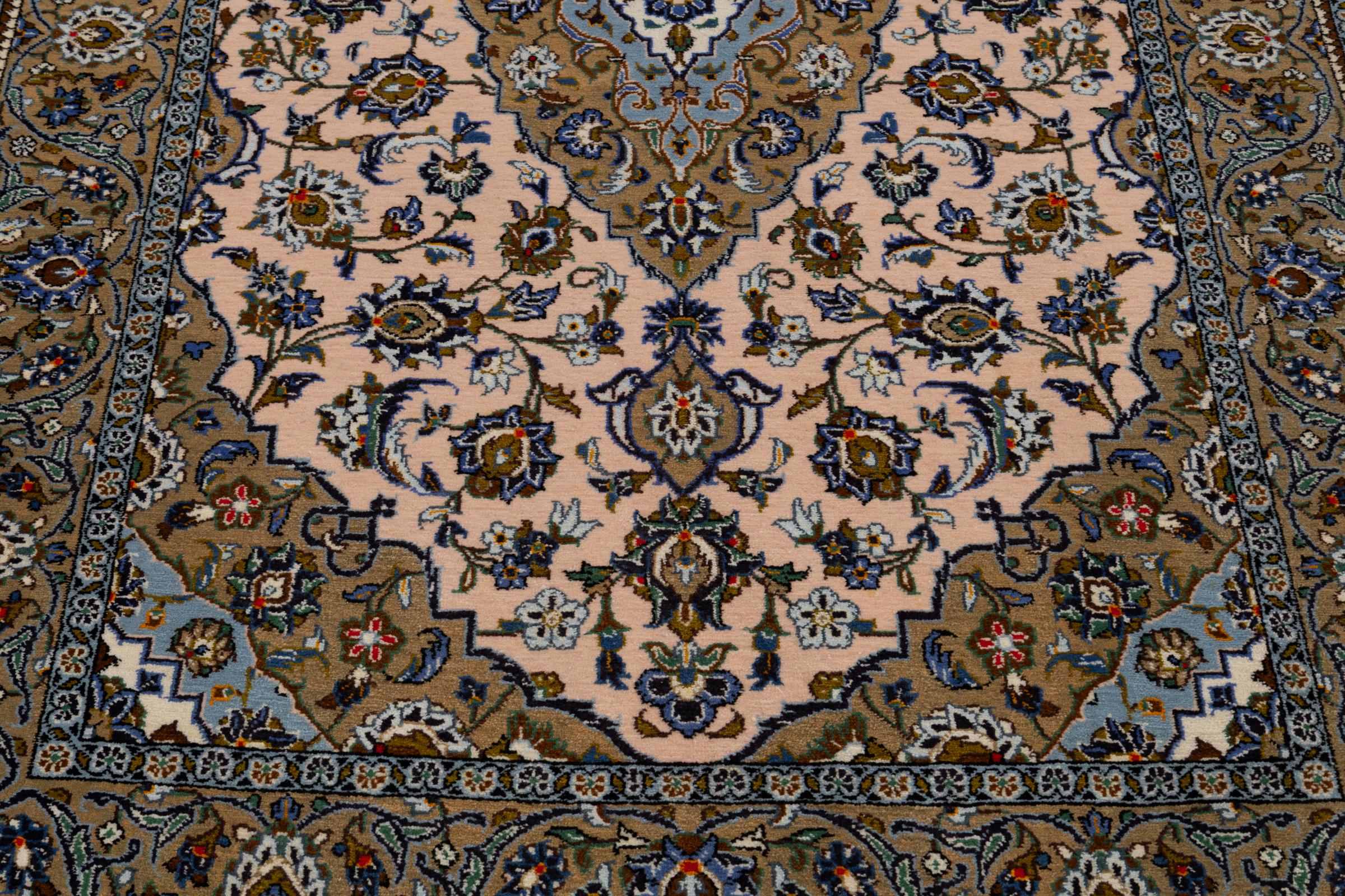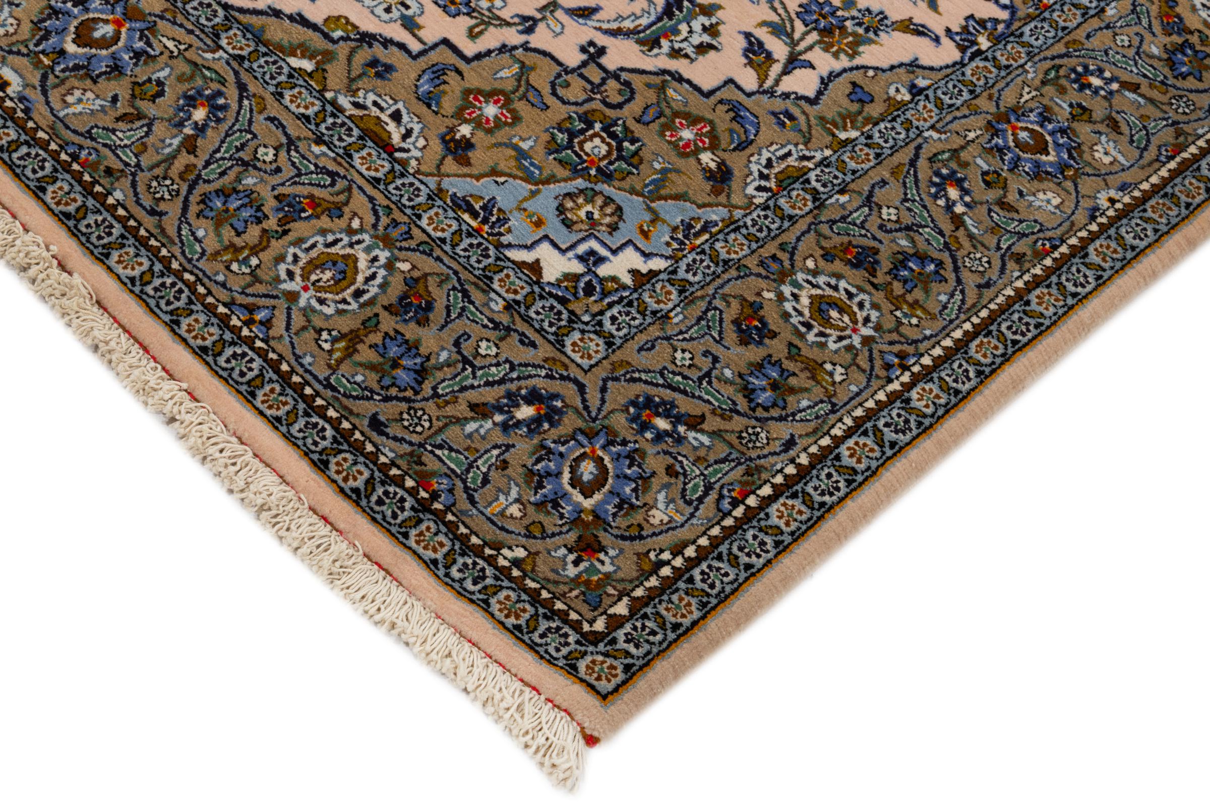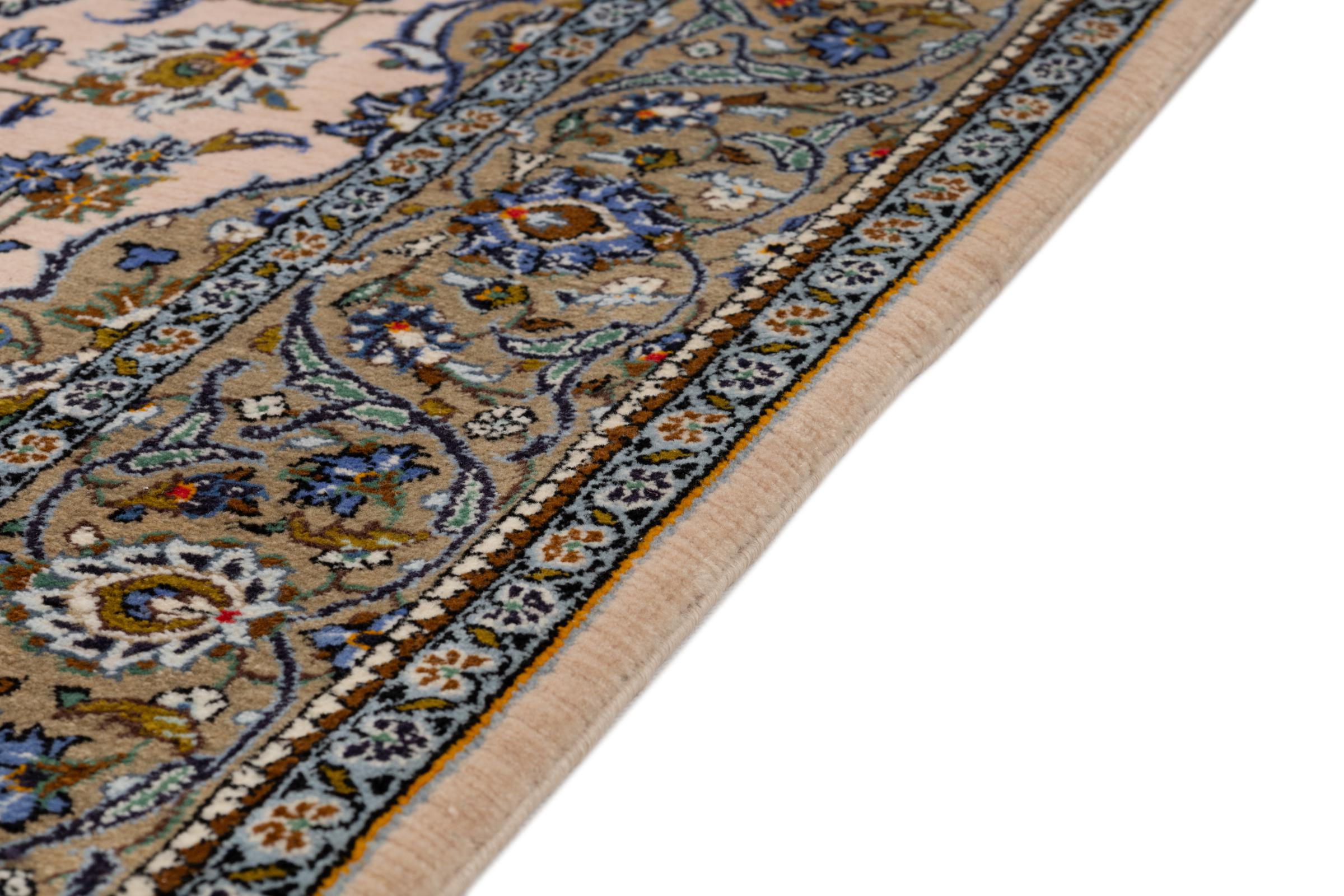 Dette teppet fra Kashan (Keshan) er holdt i sitt svært tradisjonelle og typiske persiske design med vakre ornamenter. Kashan-tepper er svært populære på grunn av deres eksepsjonelt elegante design. Disse teppene stammer fra Kashan, en by på den gamle Silkeveien. Dette teppet er håndknyttet av høykvalitets saueull og kommer til å bli et unikt høydepunkt i hjemmet ditt.