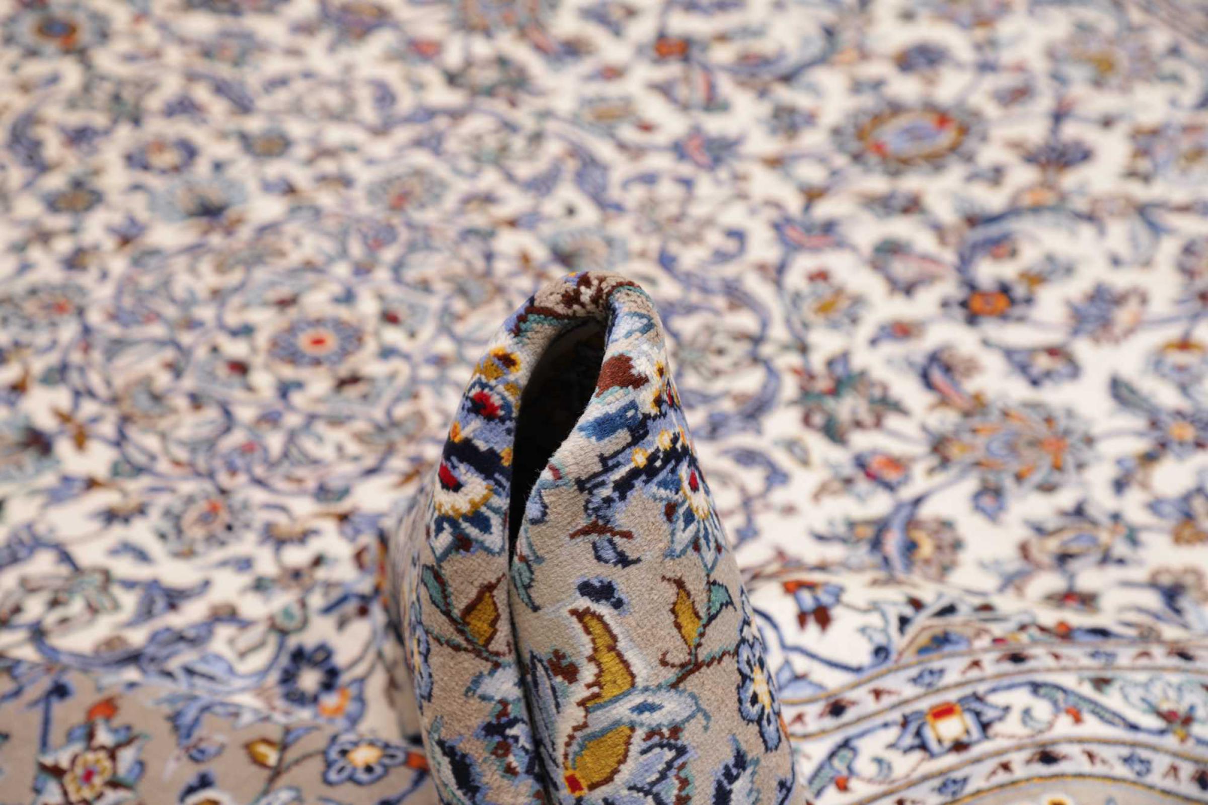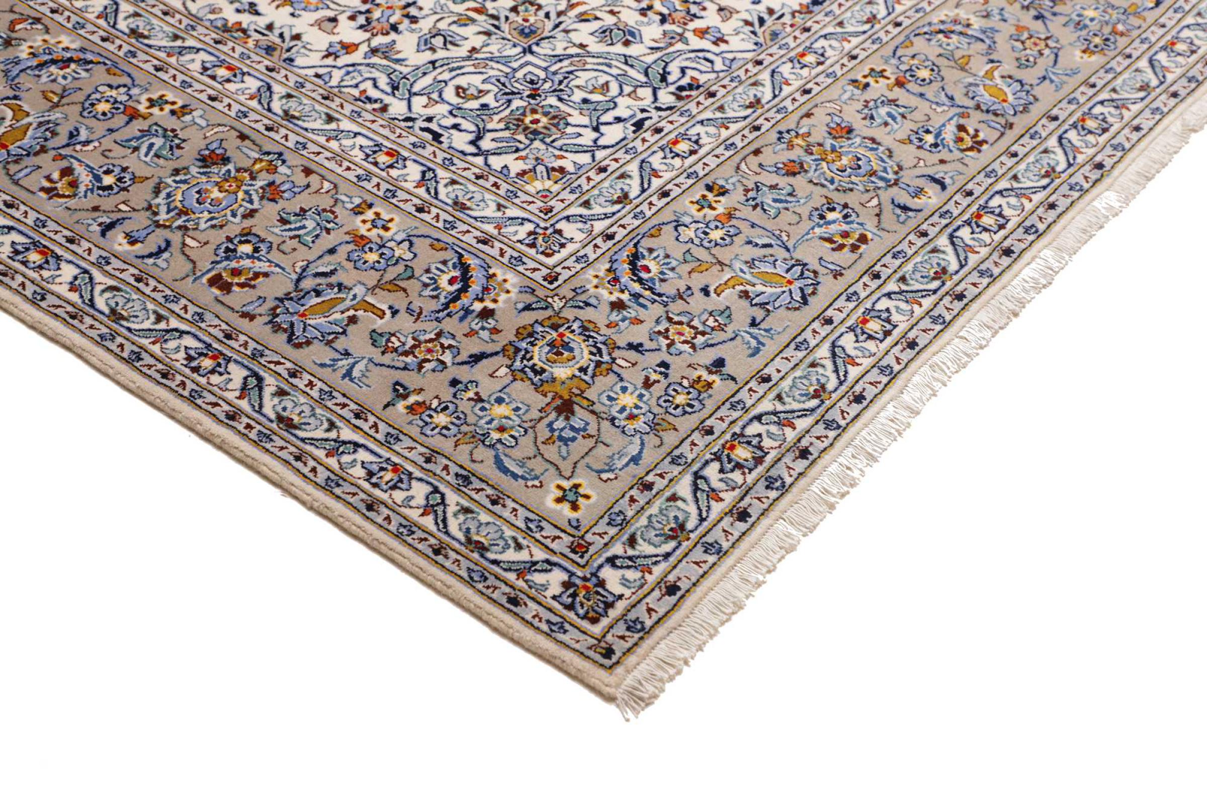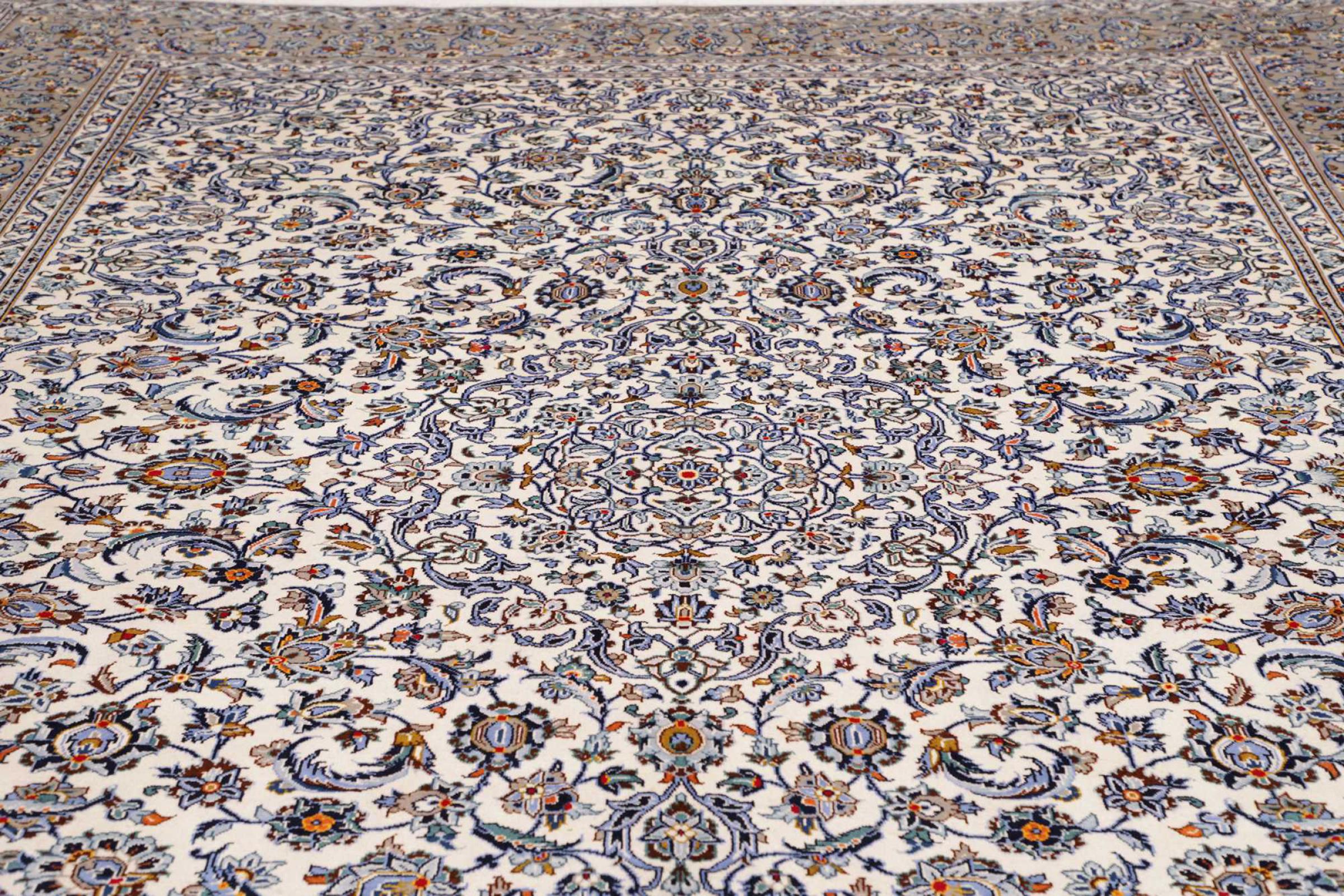 Dette teppet fra Kashan (Keshan) er holdt i sitt svært tradisjonelle og typiske persiske design med vakre ornamenter. Kashan-tepper er svært populære på grunn av deres eksepsjonelt elegante design. Disse teppene stammer fra Kashan, en by på den gamle Silkeveien. Dette teppet er håndknyttet av høykvalitets saueull og kommer til å bli et unikt høydepunkt i hjemmet ditt.