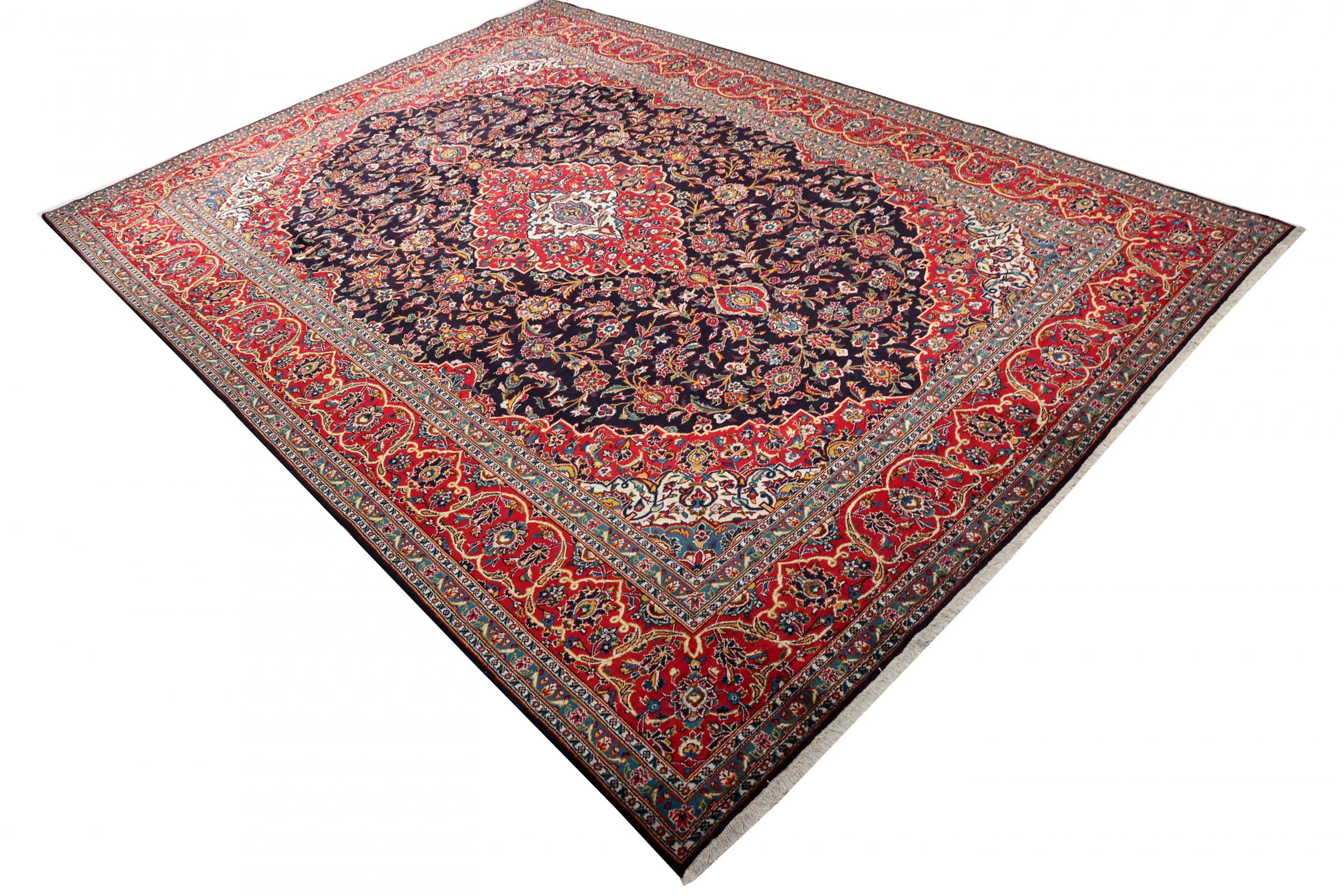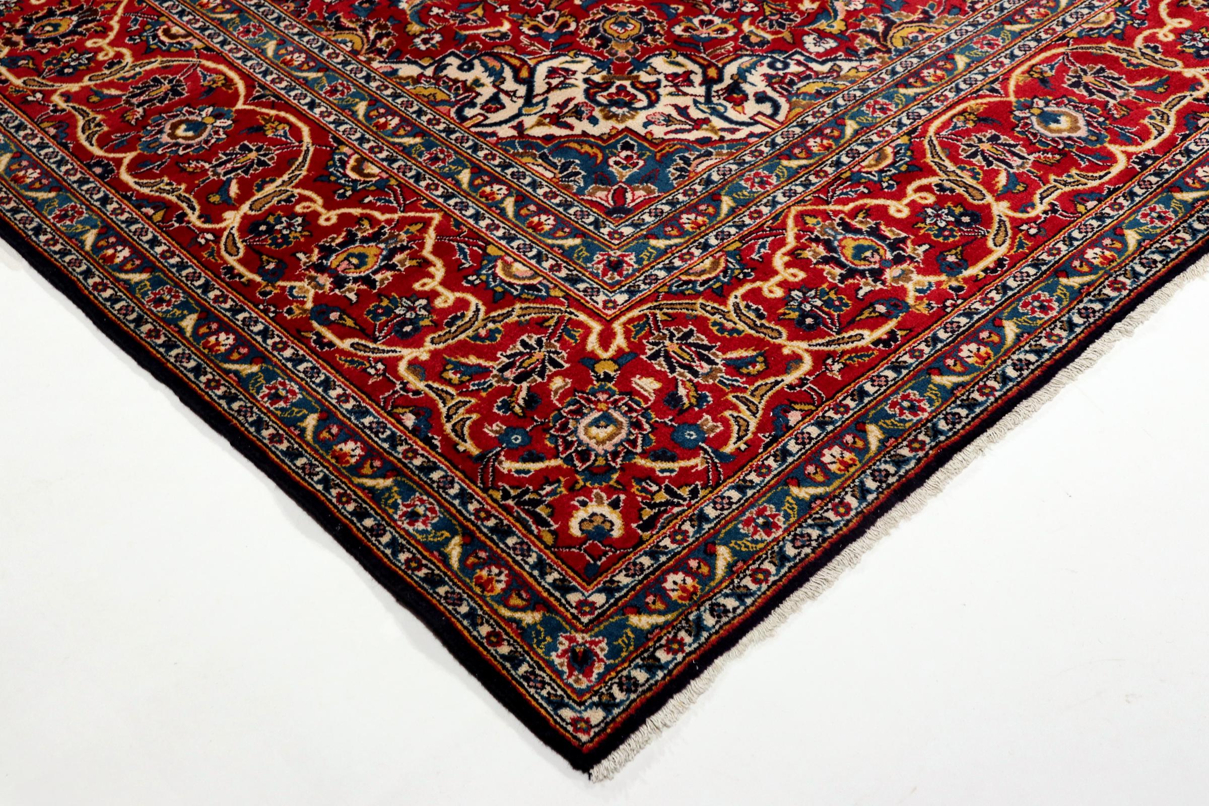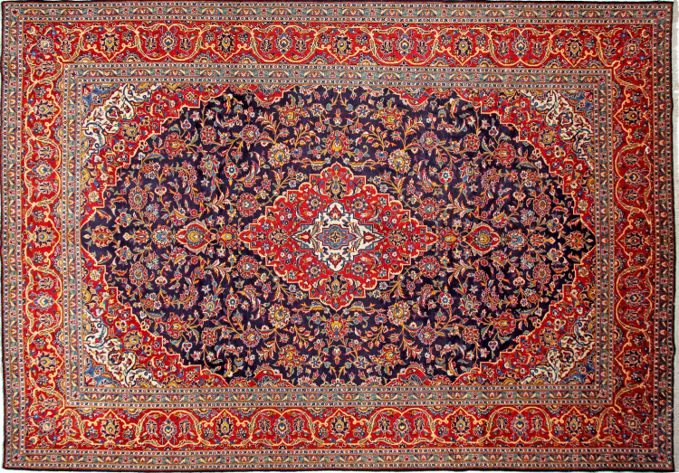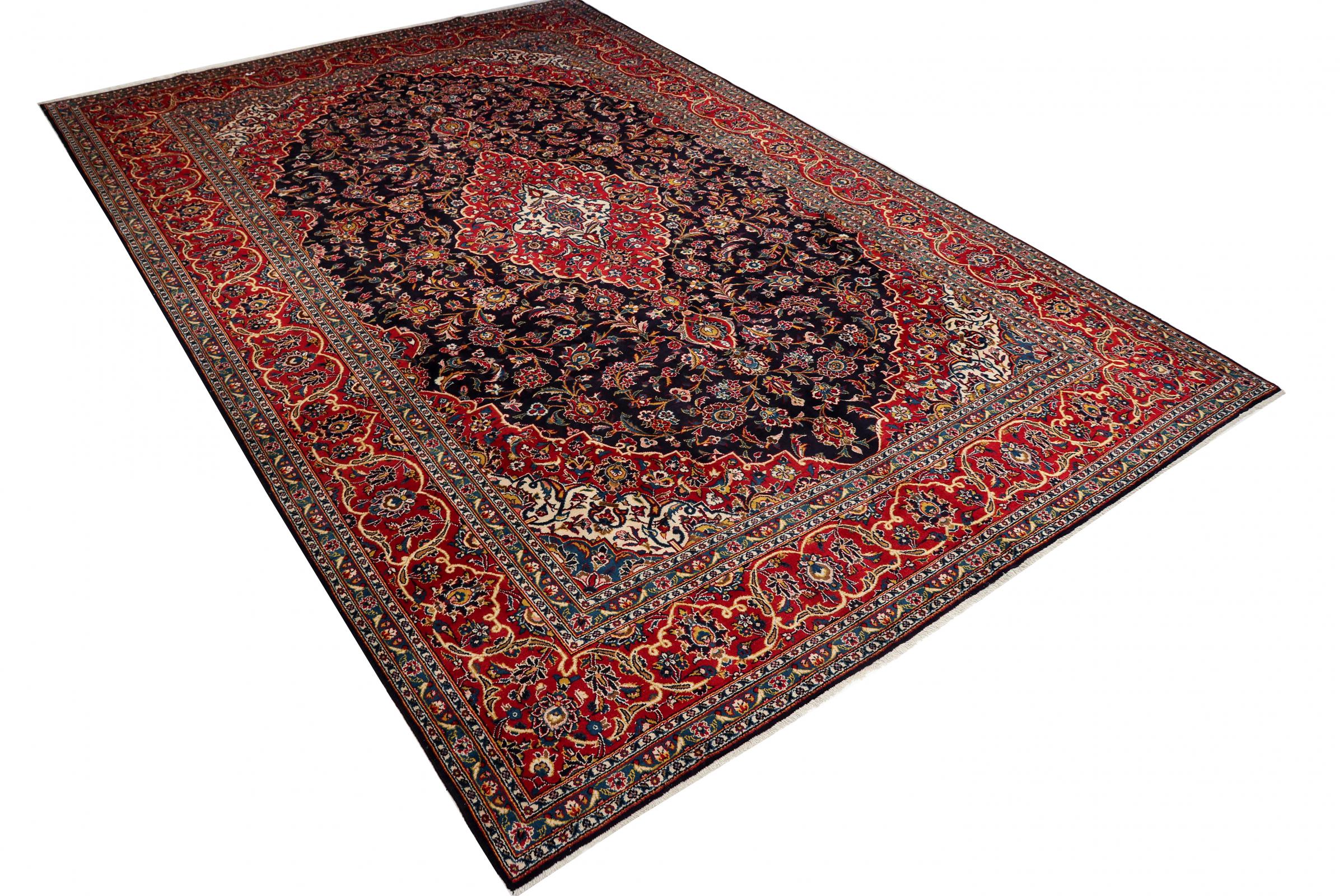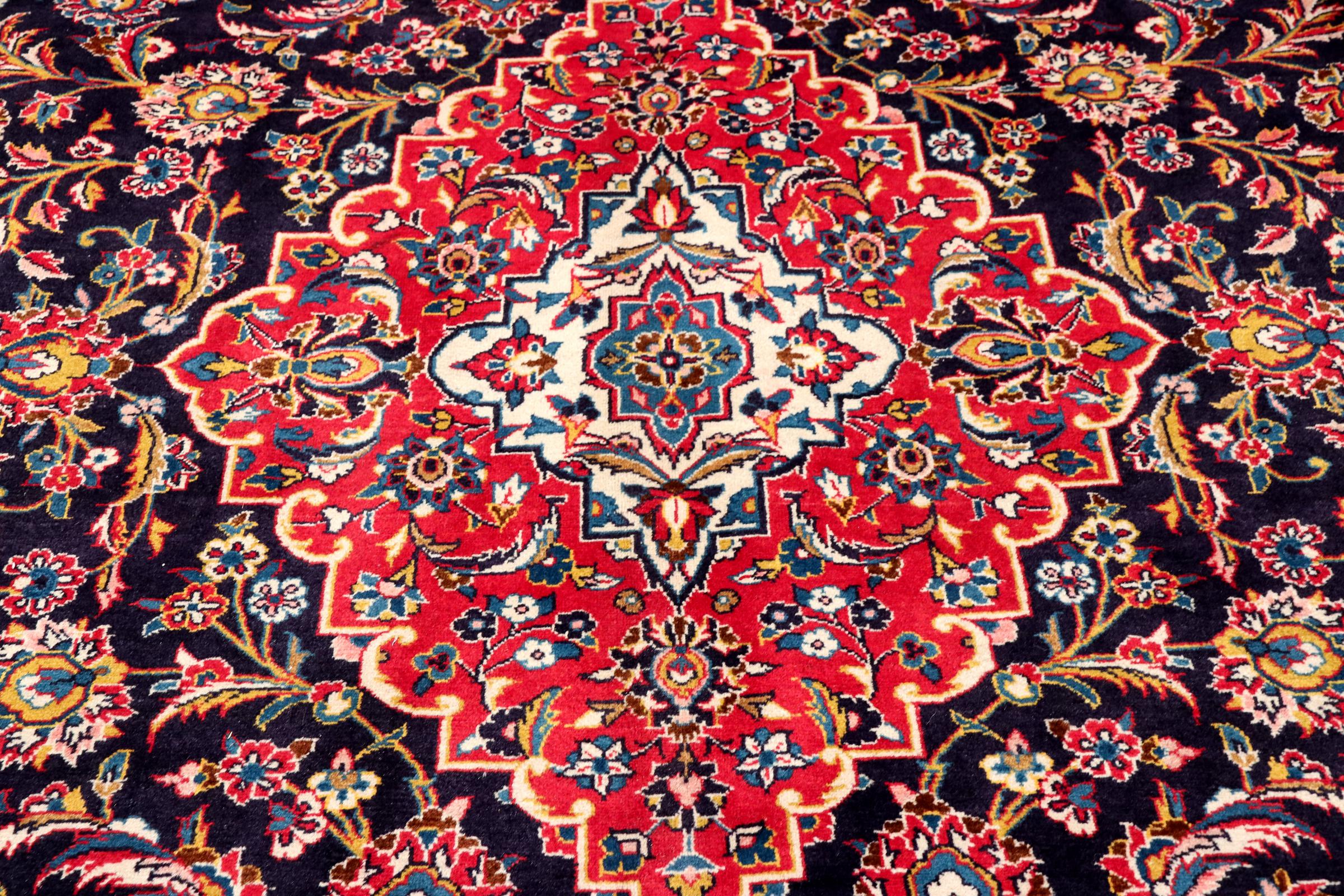 Dette teppet fra Kashan (Keshan) er holdt i sitt svært tradisjonelle og typiske persiske design med vakre ornamenter. Kashan-tepper er svært populære på grunn av deres eksepsjonelt elegante design. Disse teppene stammer fra Kashan, en by på den gamle Silkeveien. Dette teppet er håndknyttet av høykvalitets saueull og kommer til å bli et unikt høydepunkt i hjemmet ditt.