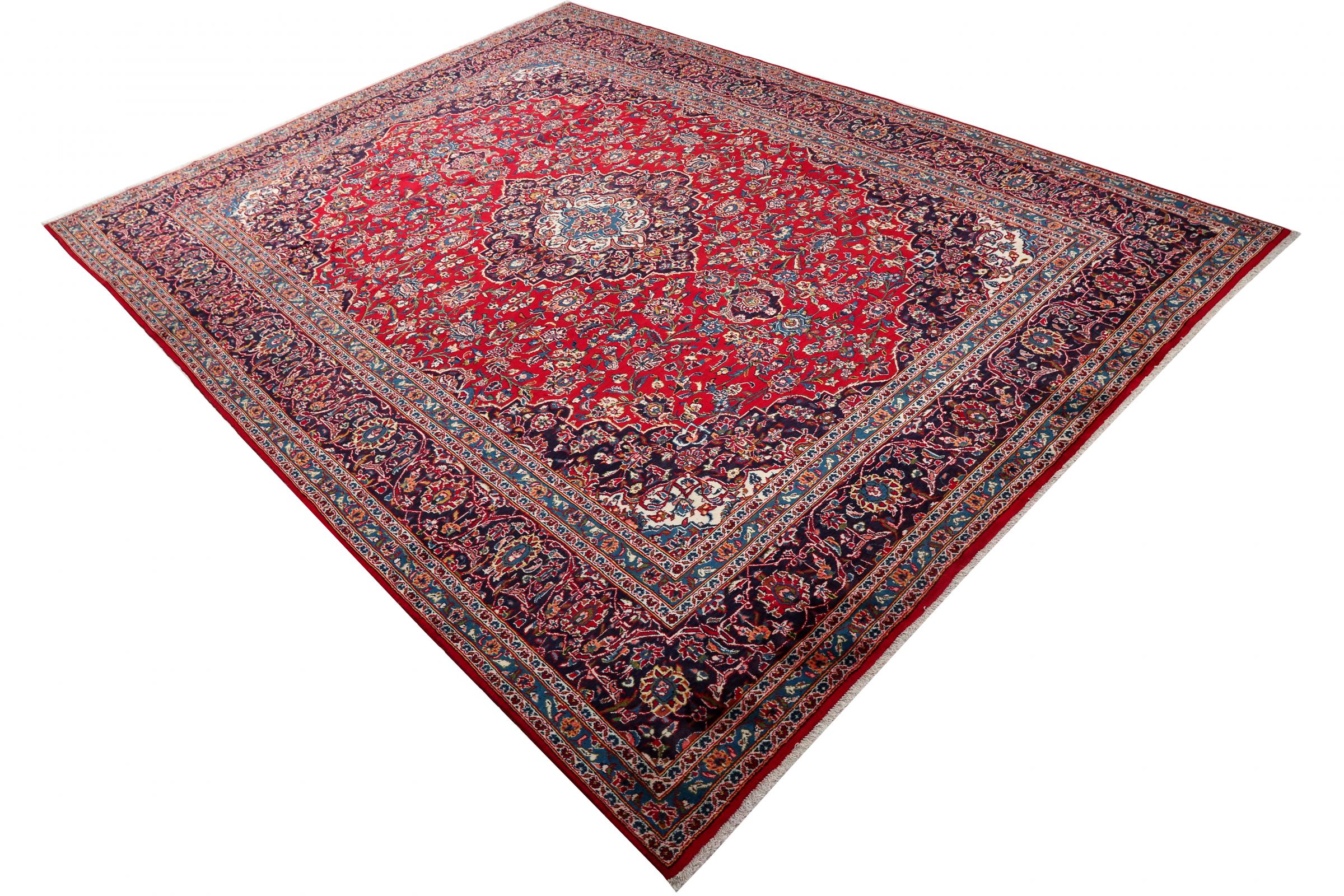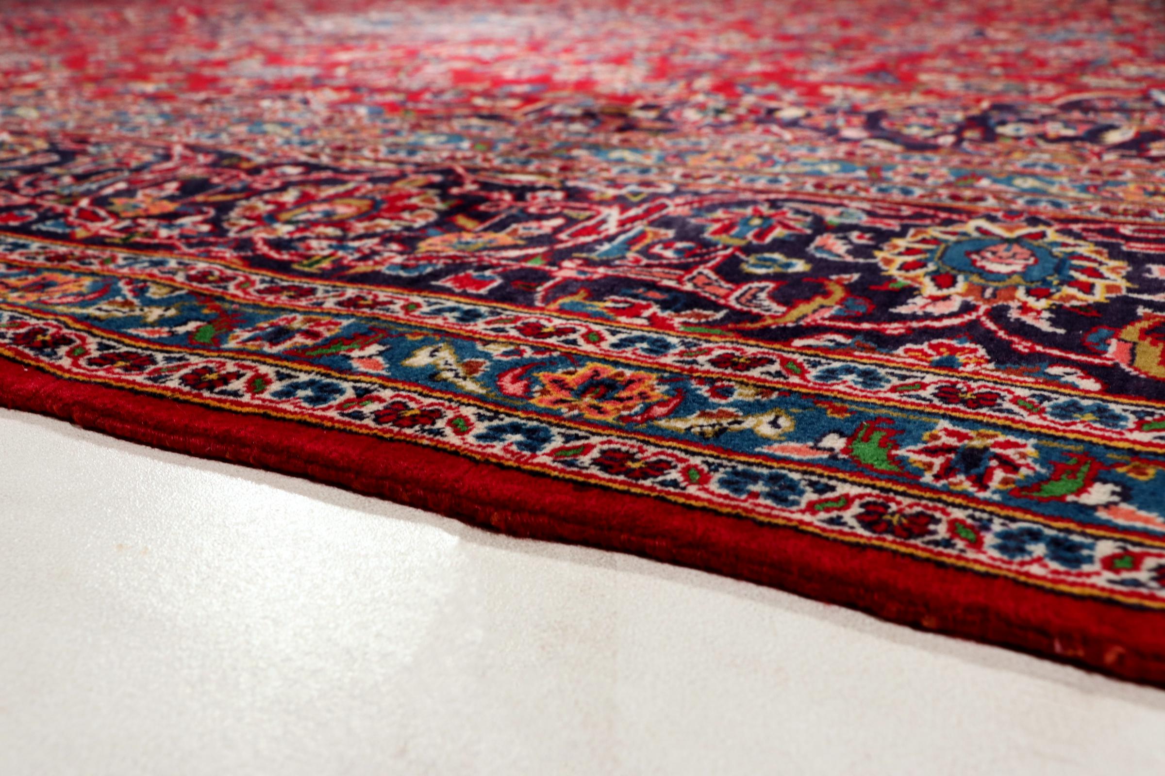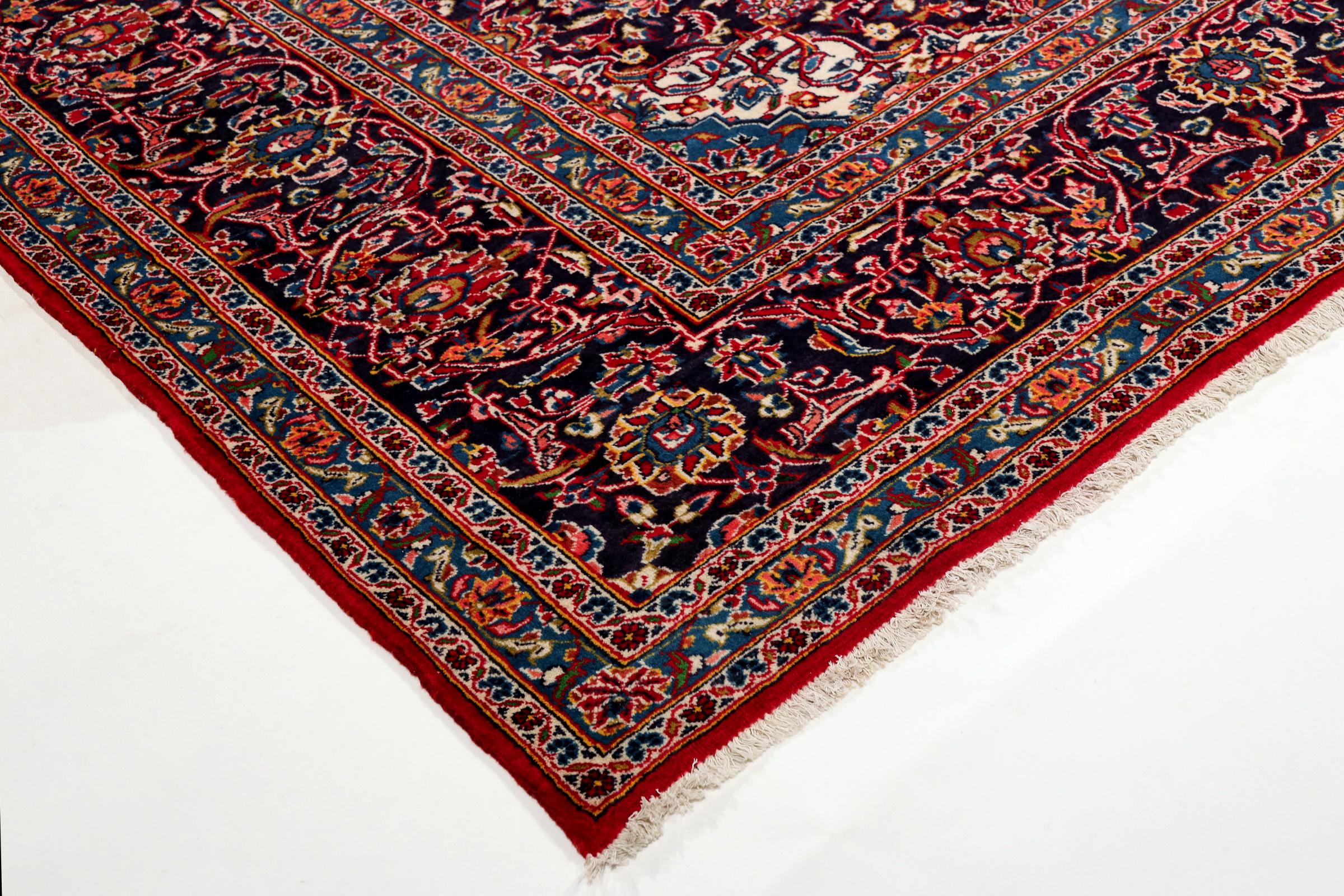 Dette teppet fra Kashan (Keshan) er holdt i sitt svært tradisjonelle og typiske persiske design med vakre ornamenter. Kashan-tepper er svært populære på grunn av deres eksepsjonelt elegante design. Disse teppene stammer fra Kashan, en by på den gamle Silkeveien. Dette teppet er håndknyttet av høykvalitets saueull og kommer til å bli et unikt høydepunkt i hjemmet ditt.