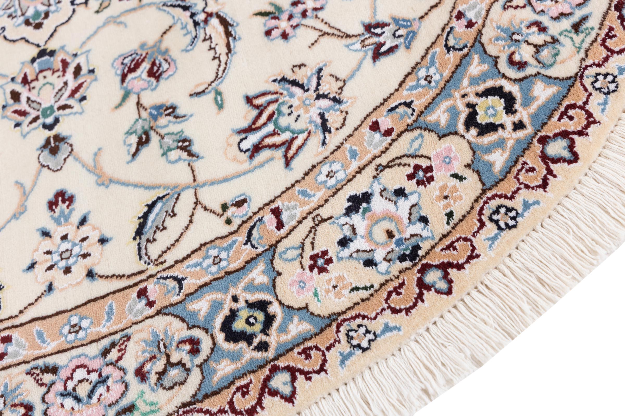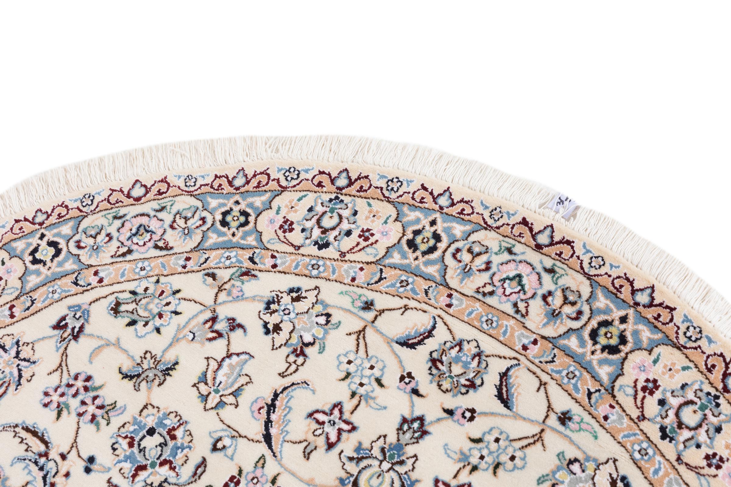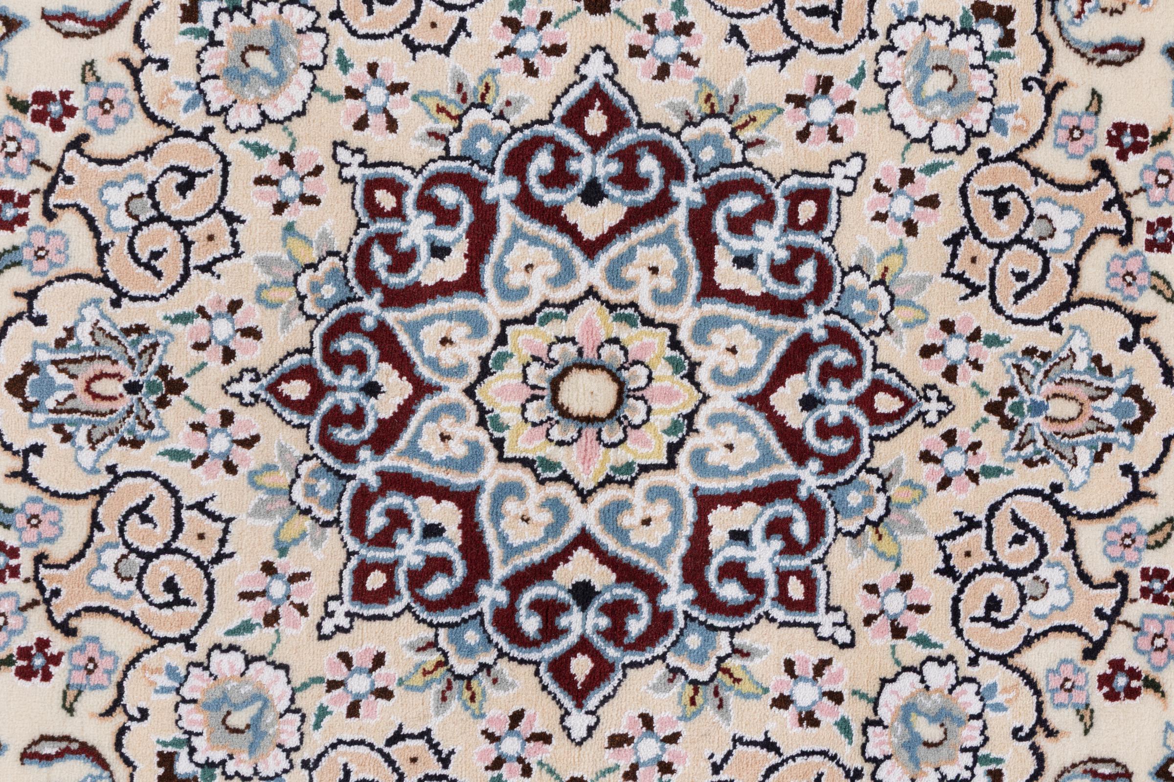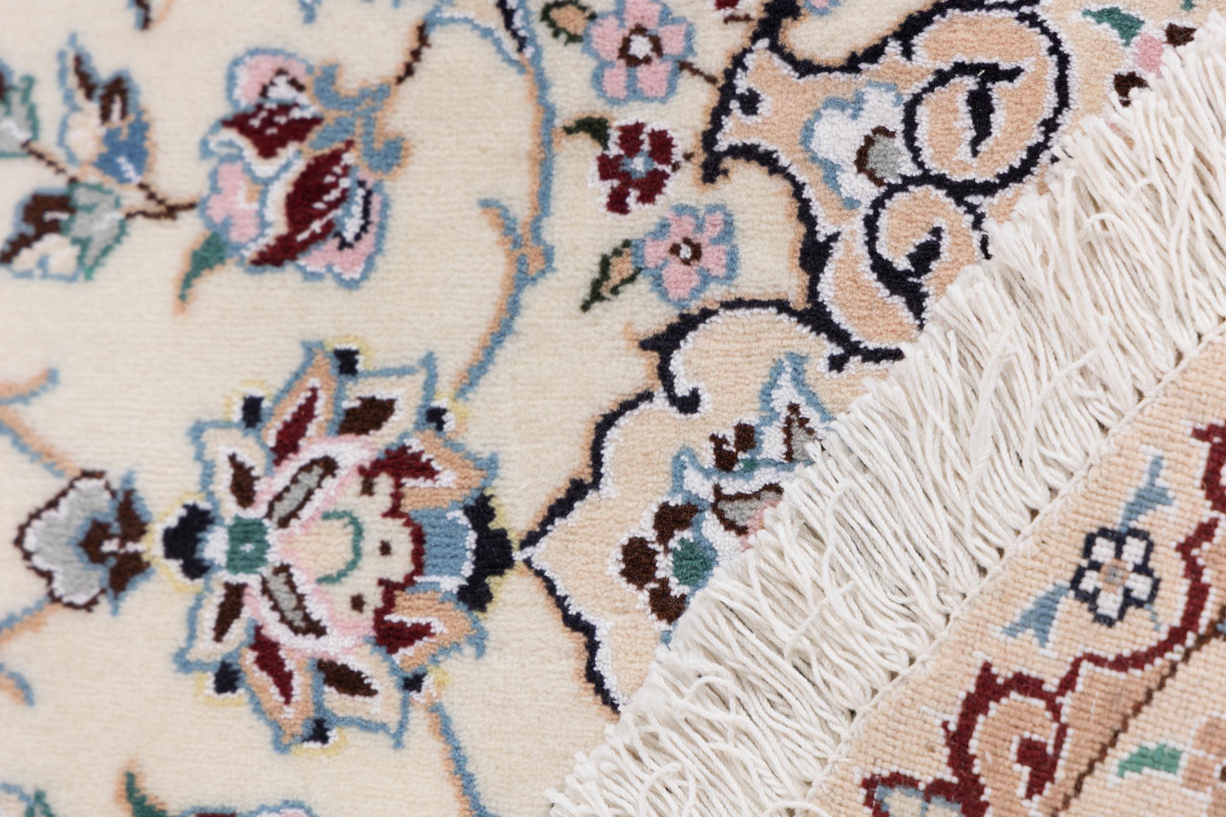 Dette Nain teppet er klassifisert med 9 La. Denne flotte kvaliteten med flott orientalsk design og de kurvlinjære mønstre begeistrer enhver kjøper. Dette persiske teppet ble håndknyttet av ull og silke i byen Nain, på den vestlige grensen av Dascht-e-Kavir ørkenen.
