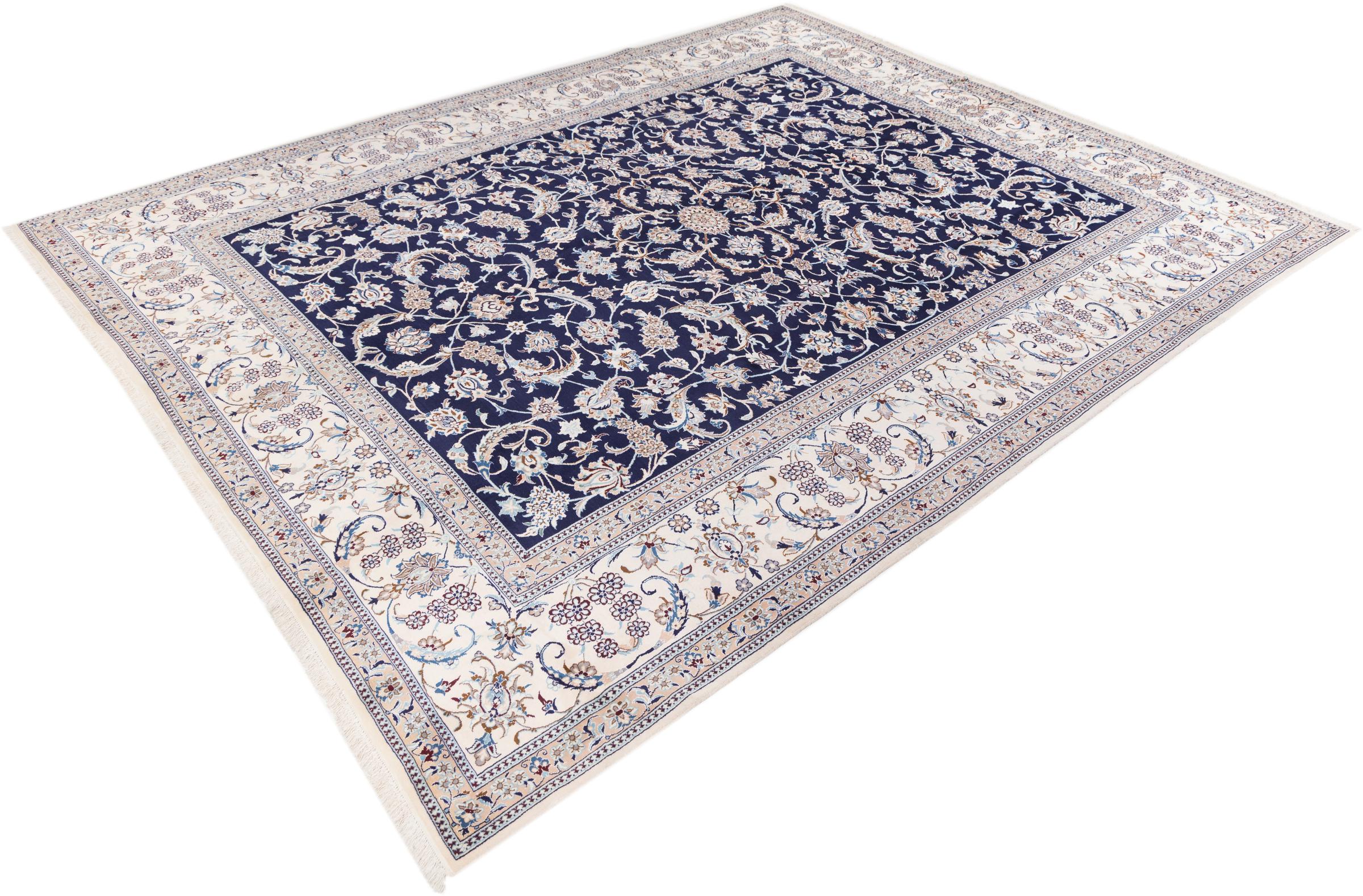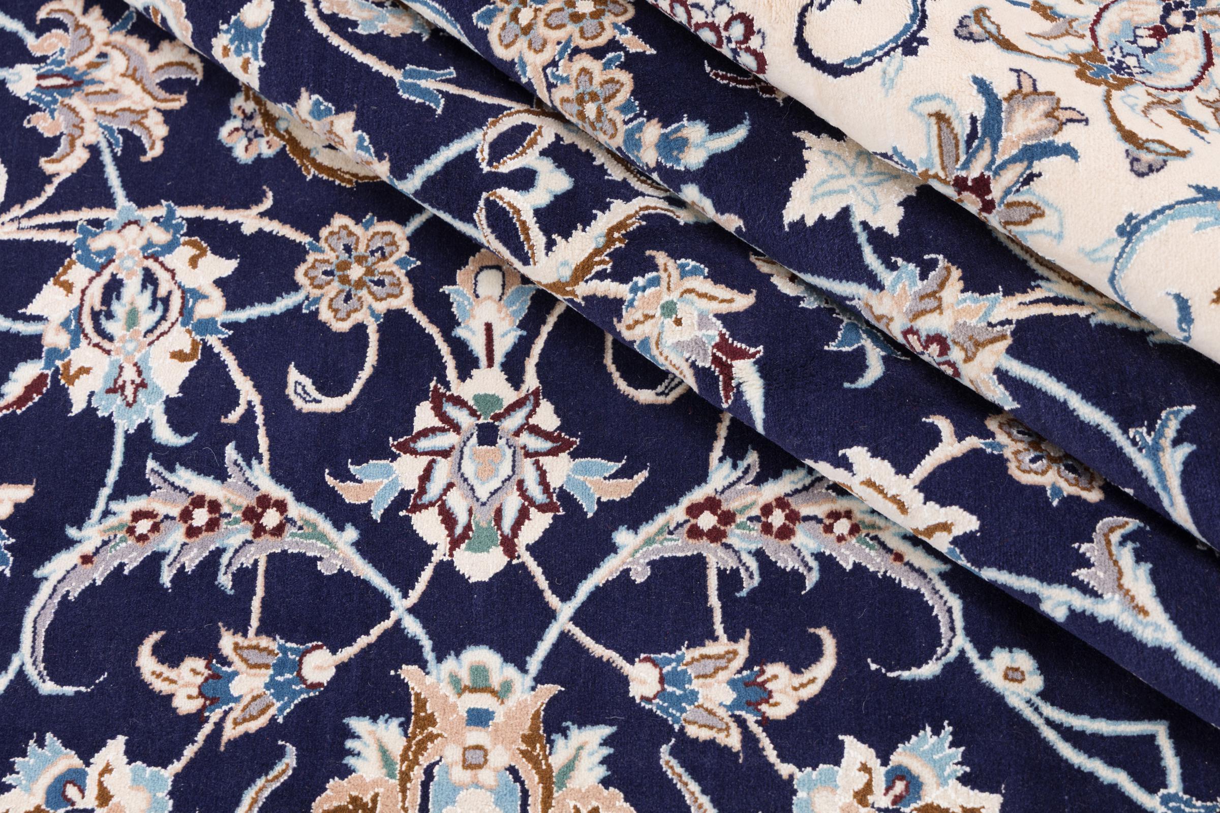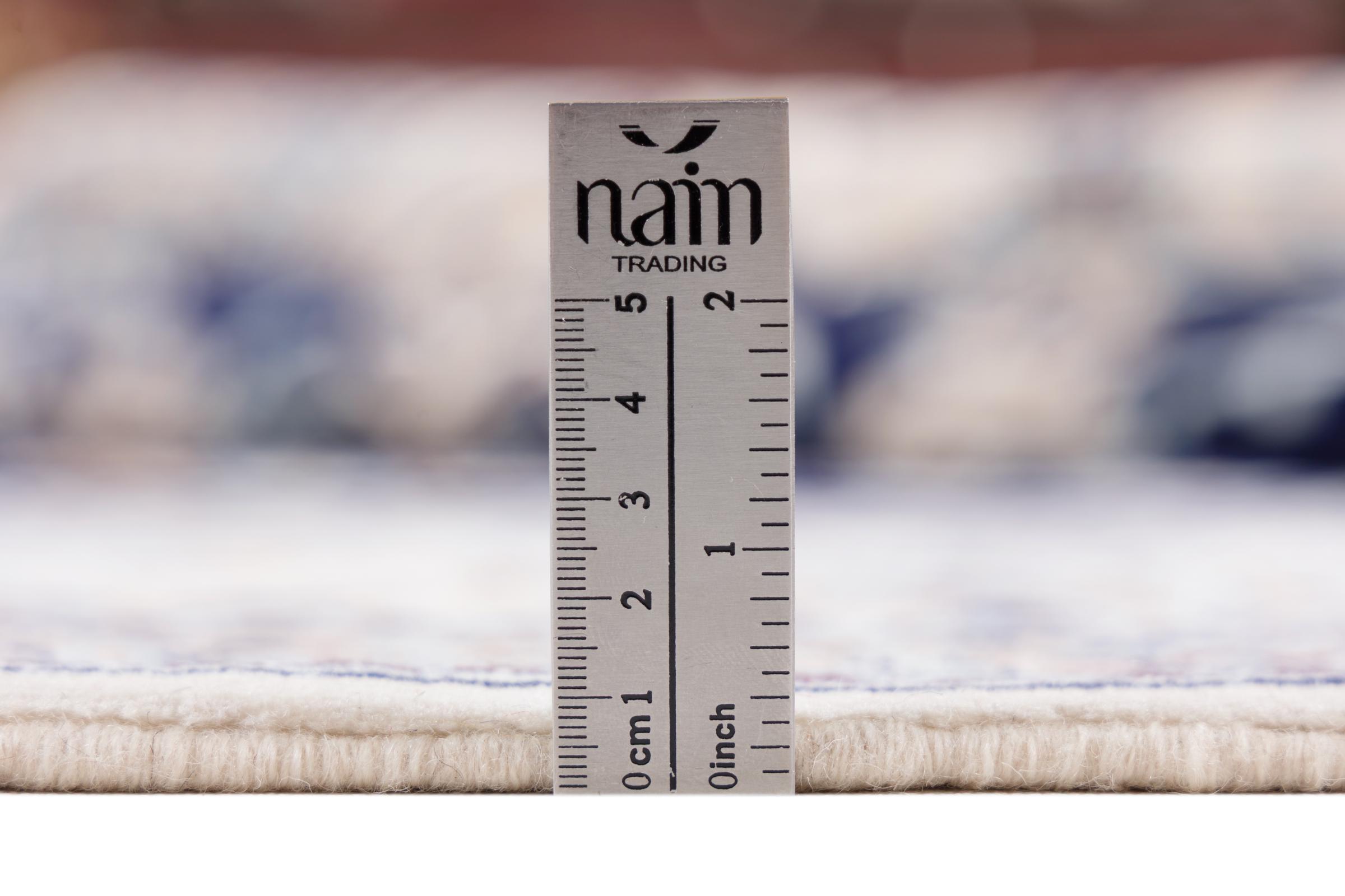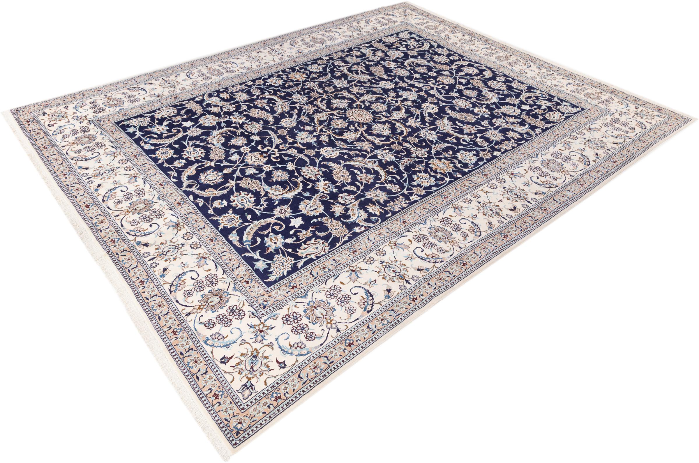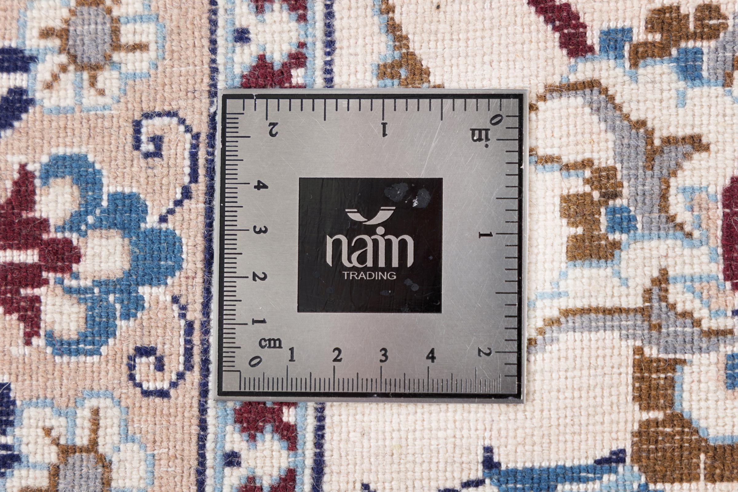 Dette Nain teppet er klassifisert med 9 La. Denne flotte kvaliteten med flott orientalsk design og de kurvlinjære mønstre begeistrer enhver kjøper. Dette persiske teppet ble håndknyttet av ull og silke i byen Nain, på den vestlige grensen av Dascht-e-Kavir ørkenen.