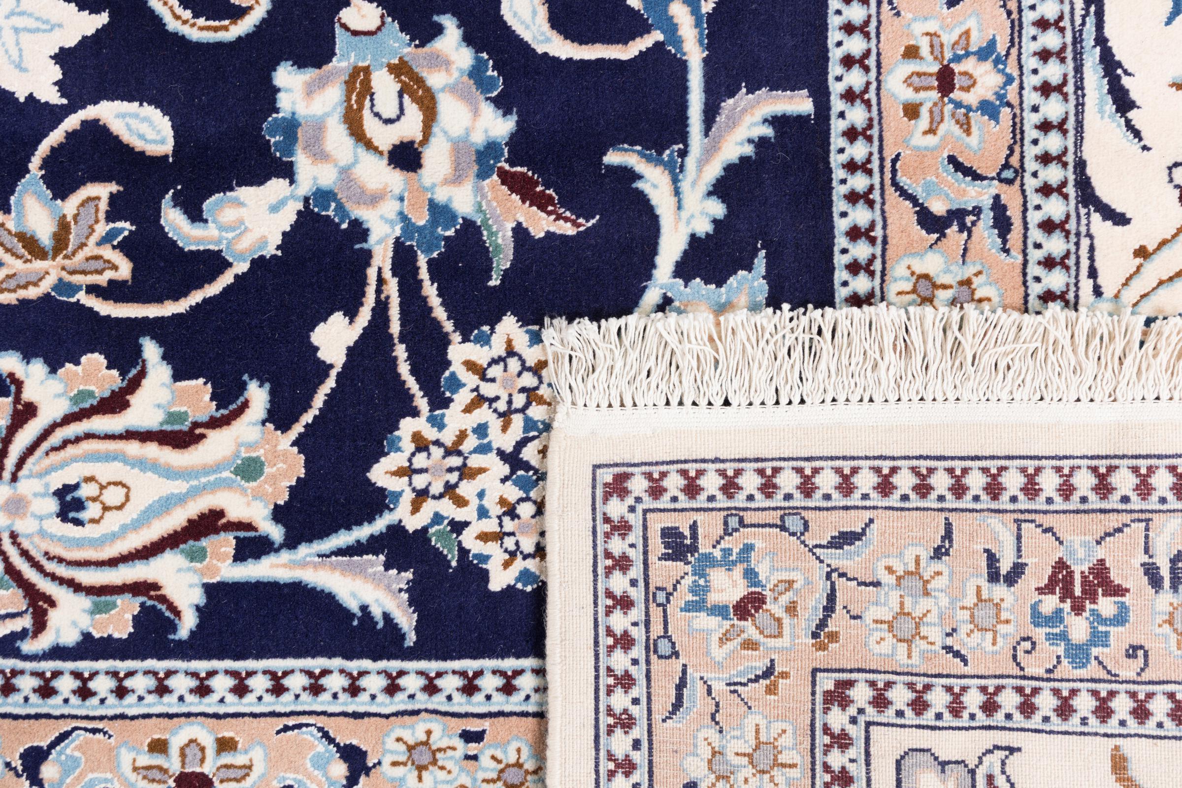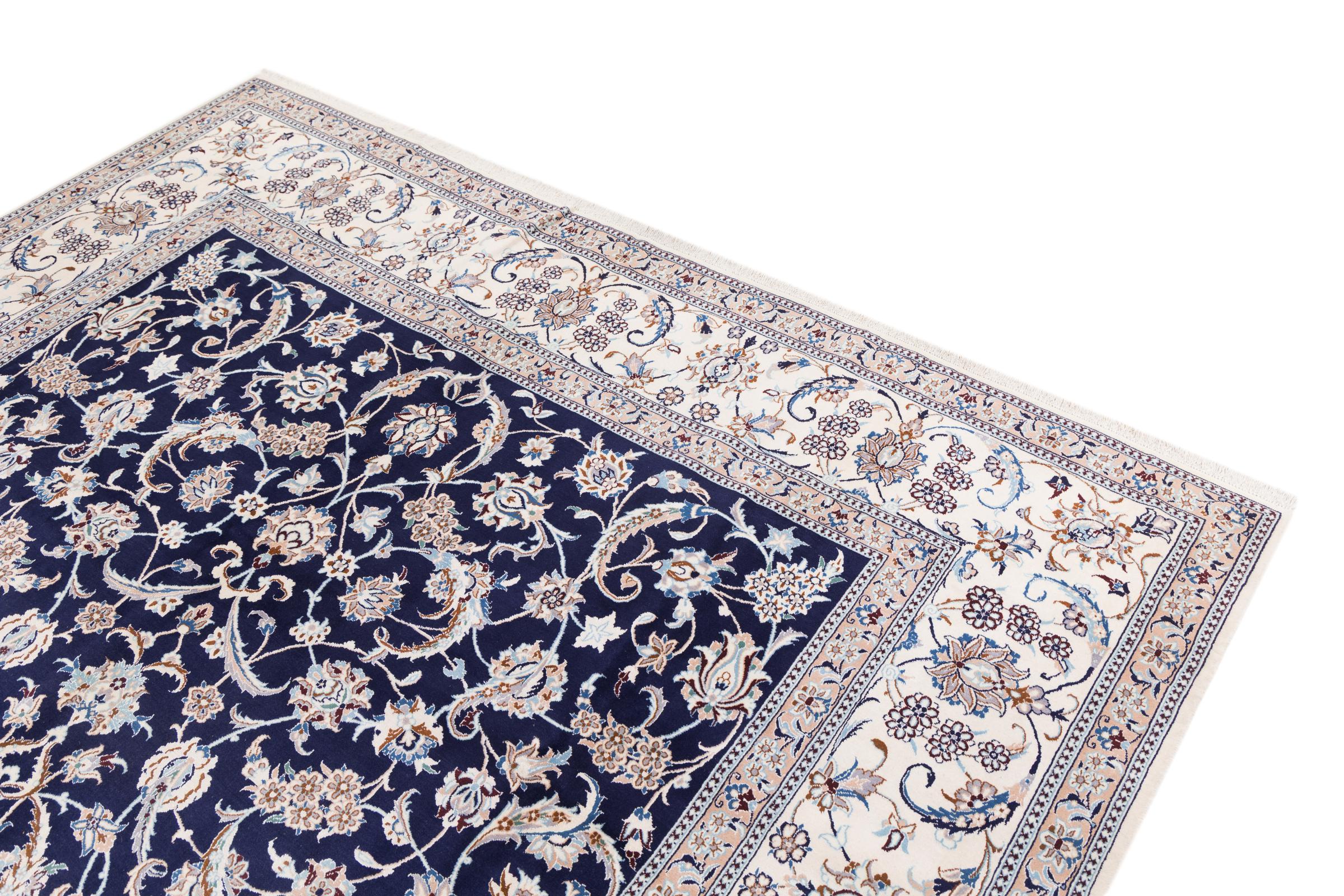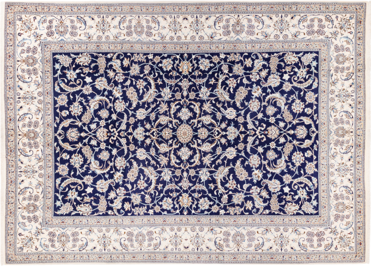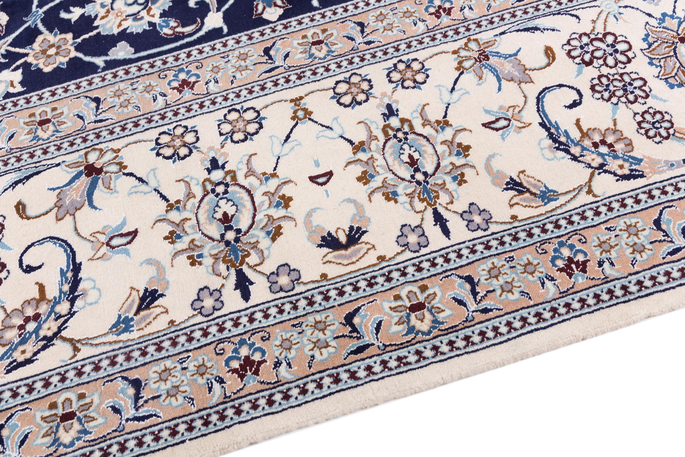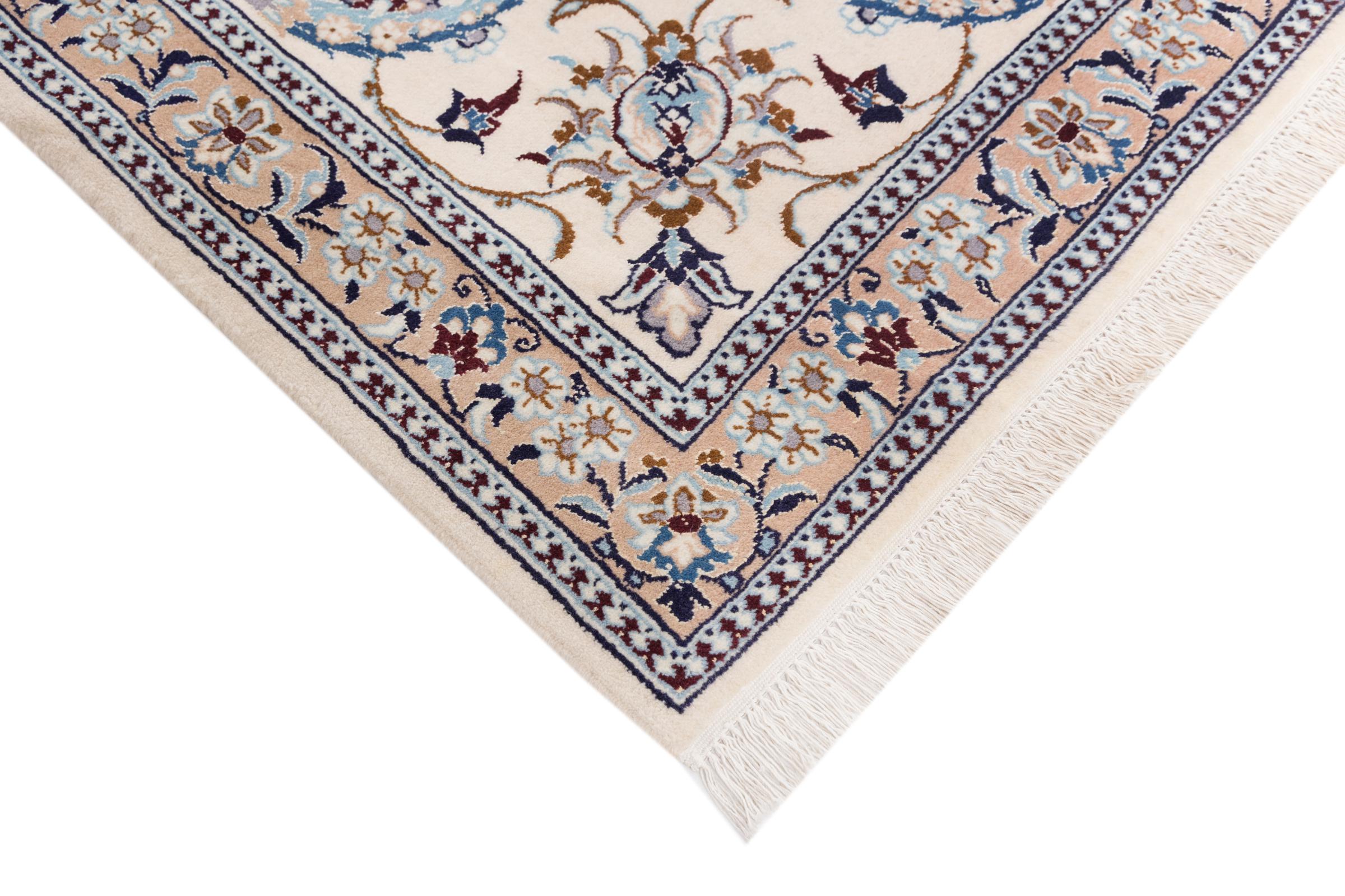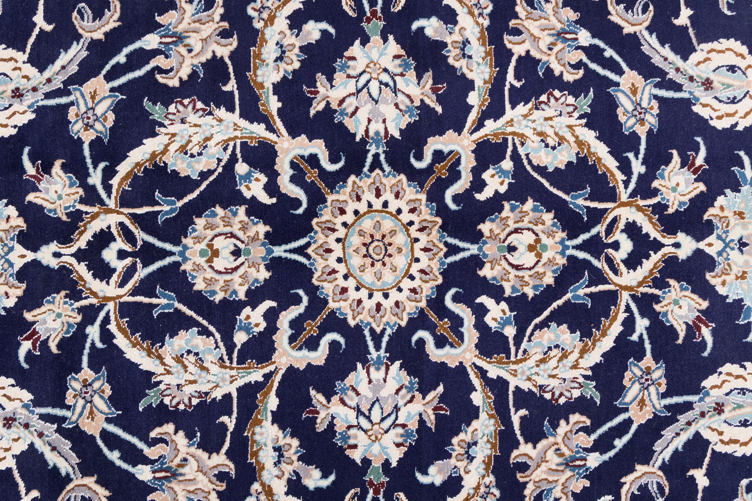 Dette Nain teppet er klassifisert med 9 La. Denne flotte kvaliteten med flott orientalsk design og de kurvlinjære mønstre begeistrer enhver kjøper. Dette persiske teppet ble håndknyttet av ull og silke i byen Nain, på den vestlige grensen av Dascht-e-Kavir ørkenen.