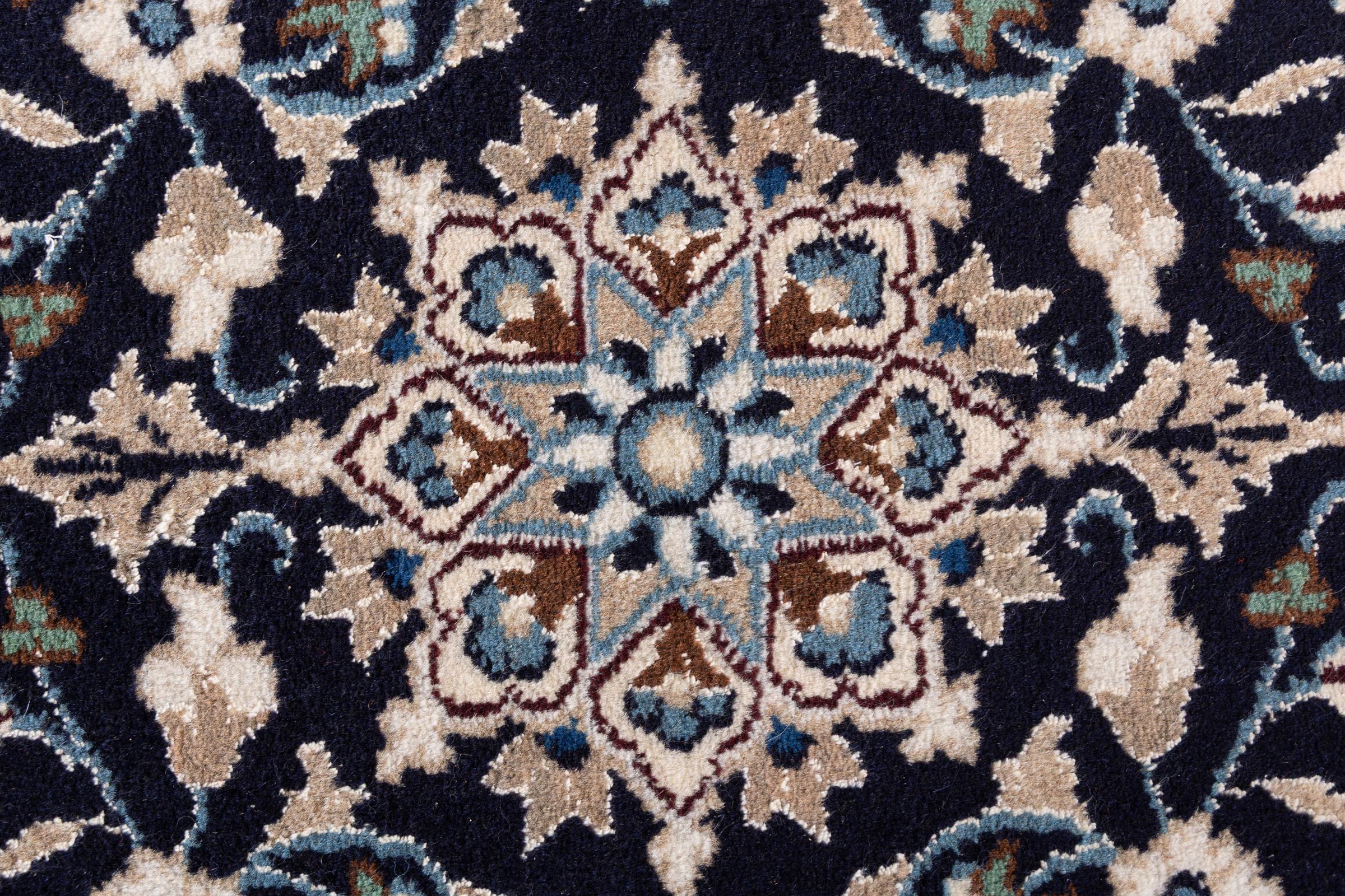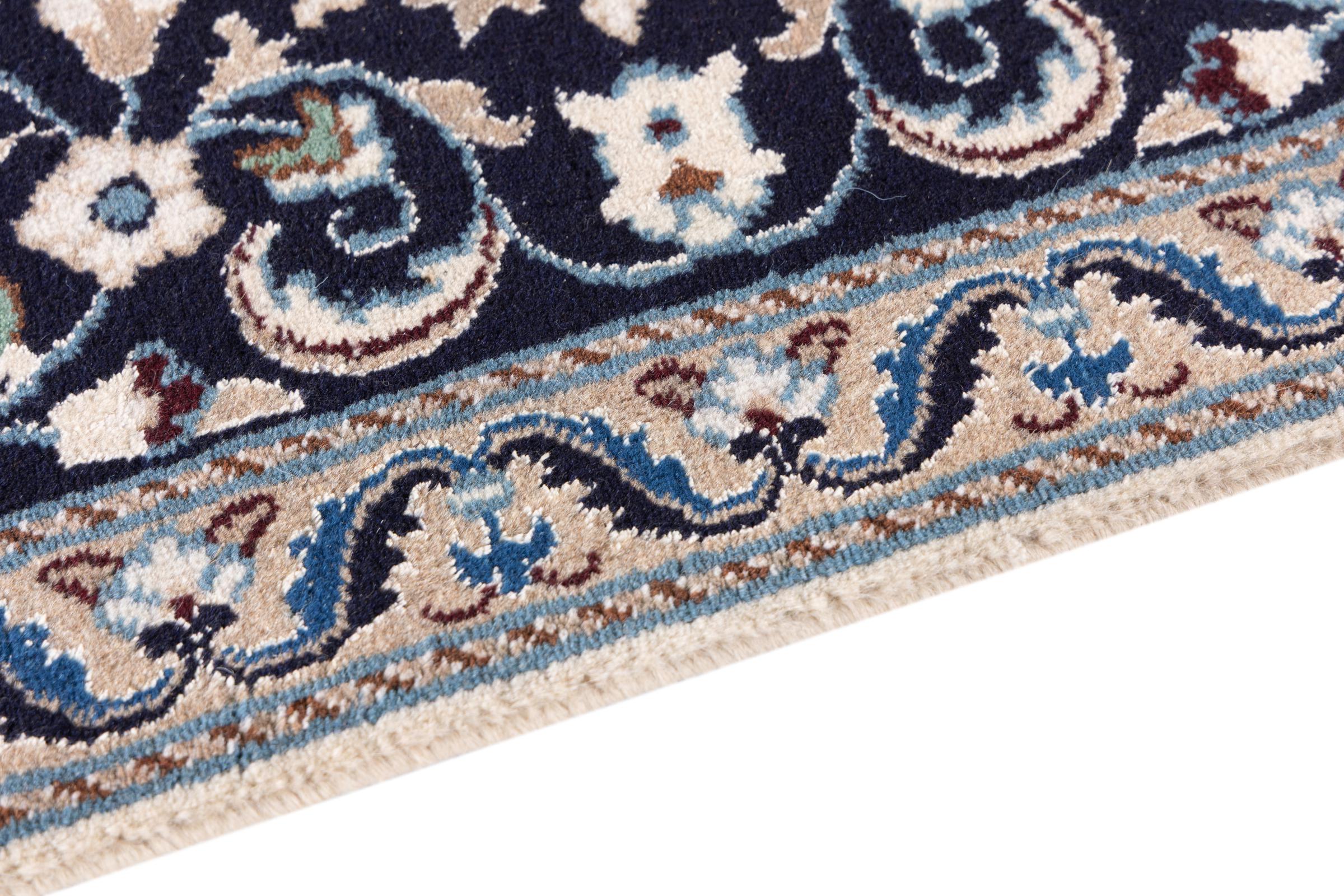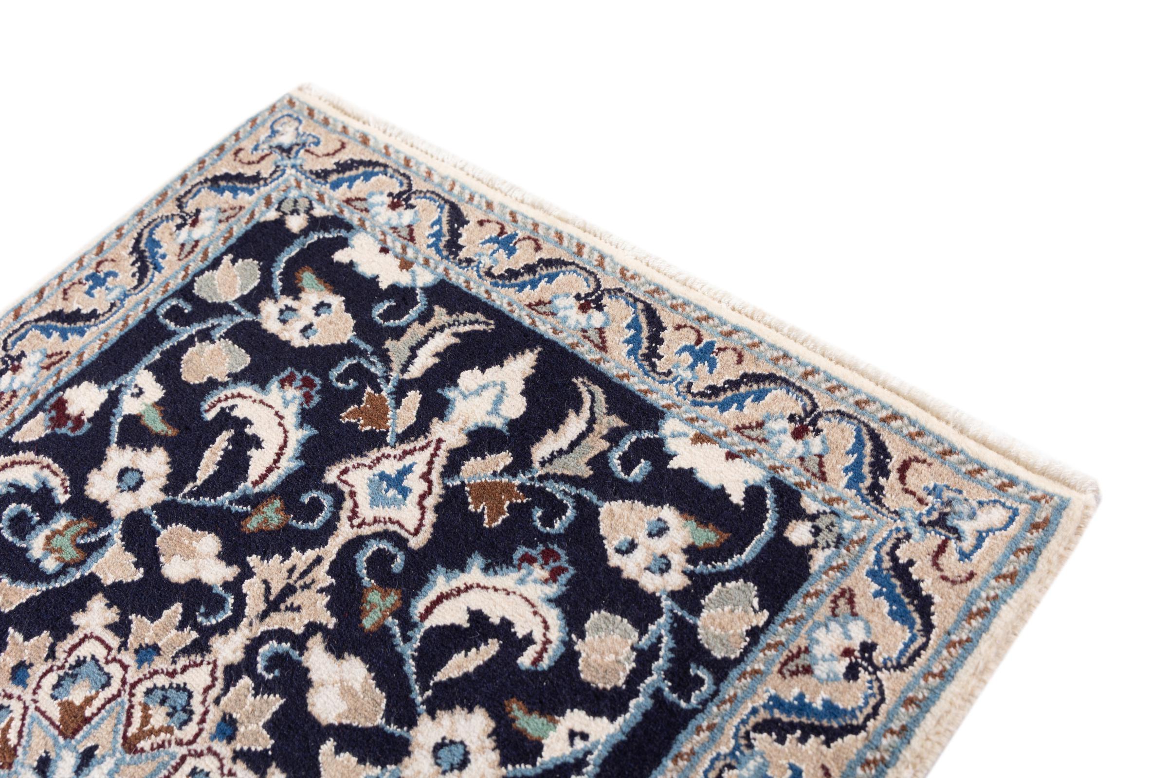 Dette Nain teppet er klassifisert med 9 La. Denne flotte kvaliteten med flott orientalsk design og de kurvlinjære mønstre begeistrer enhver kjøper. Dette persiske teppet ble håndknyttet av ull og silke i byen Nain, på den vestlige grensen av Dascht-e-Kavir ørkenen.