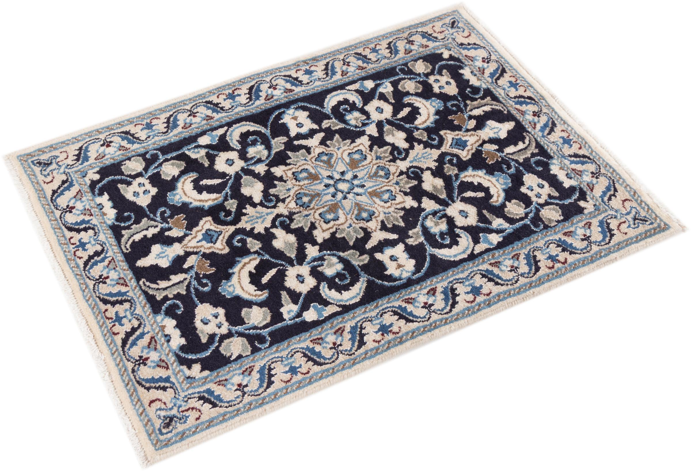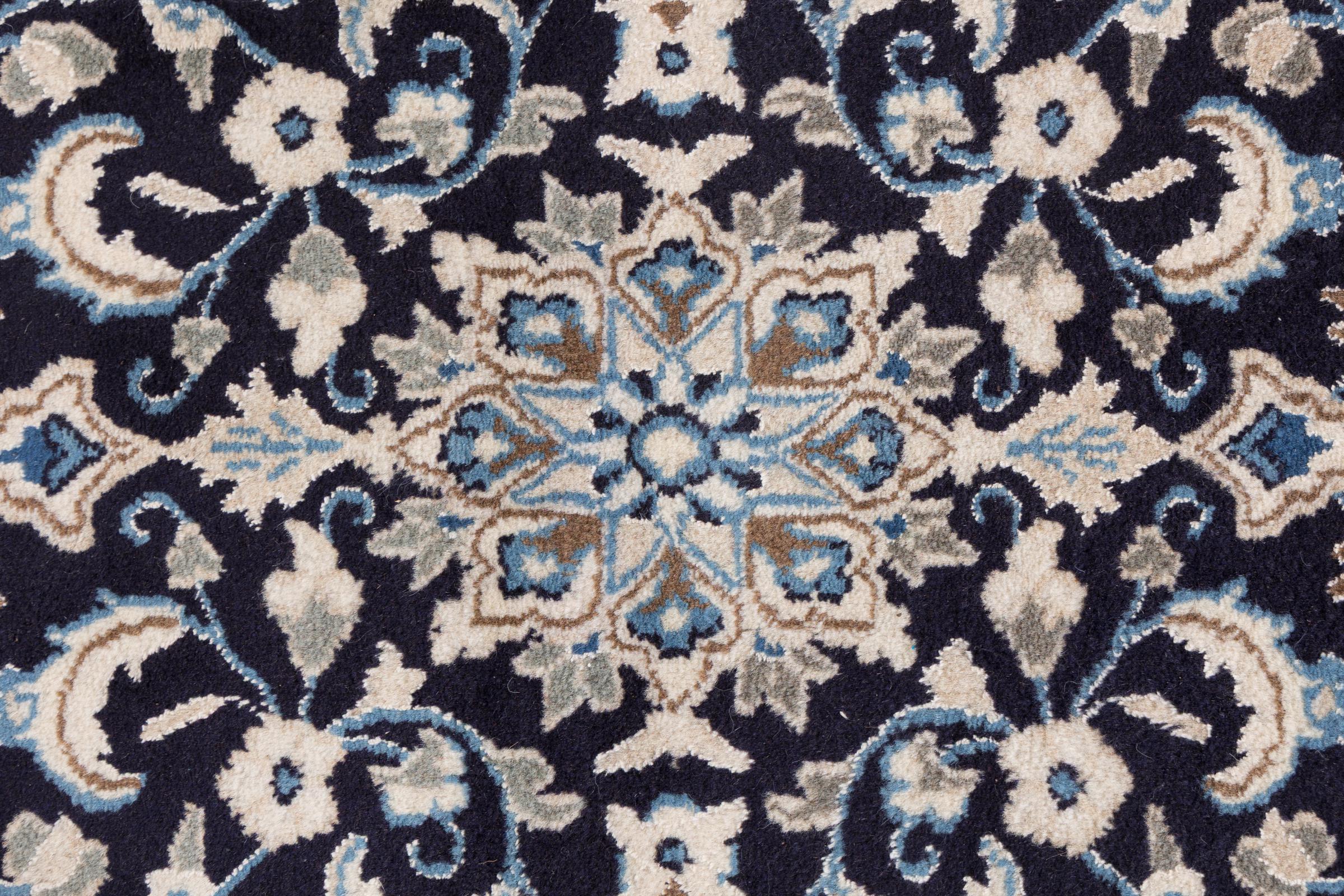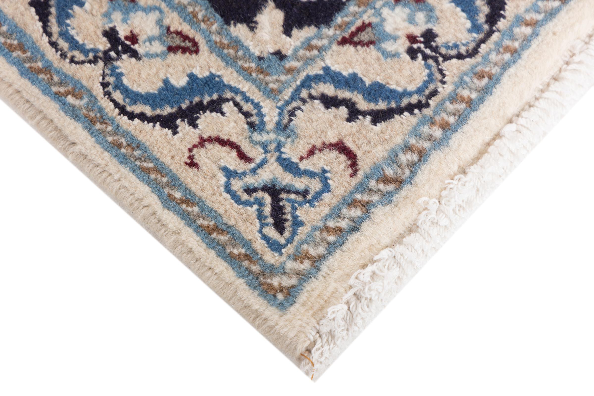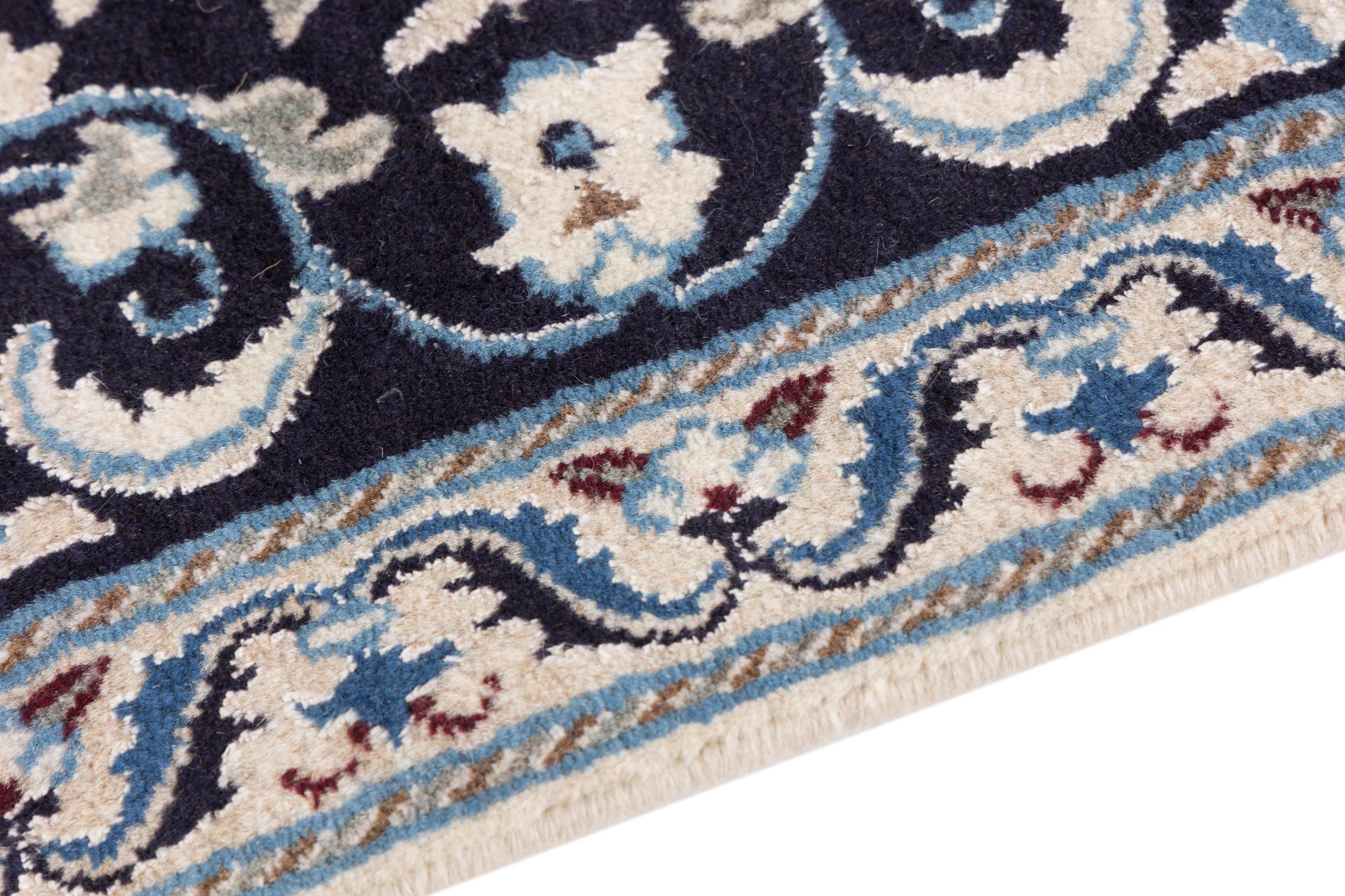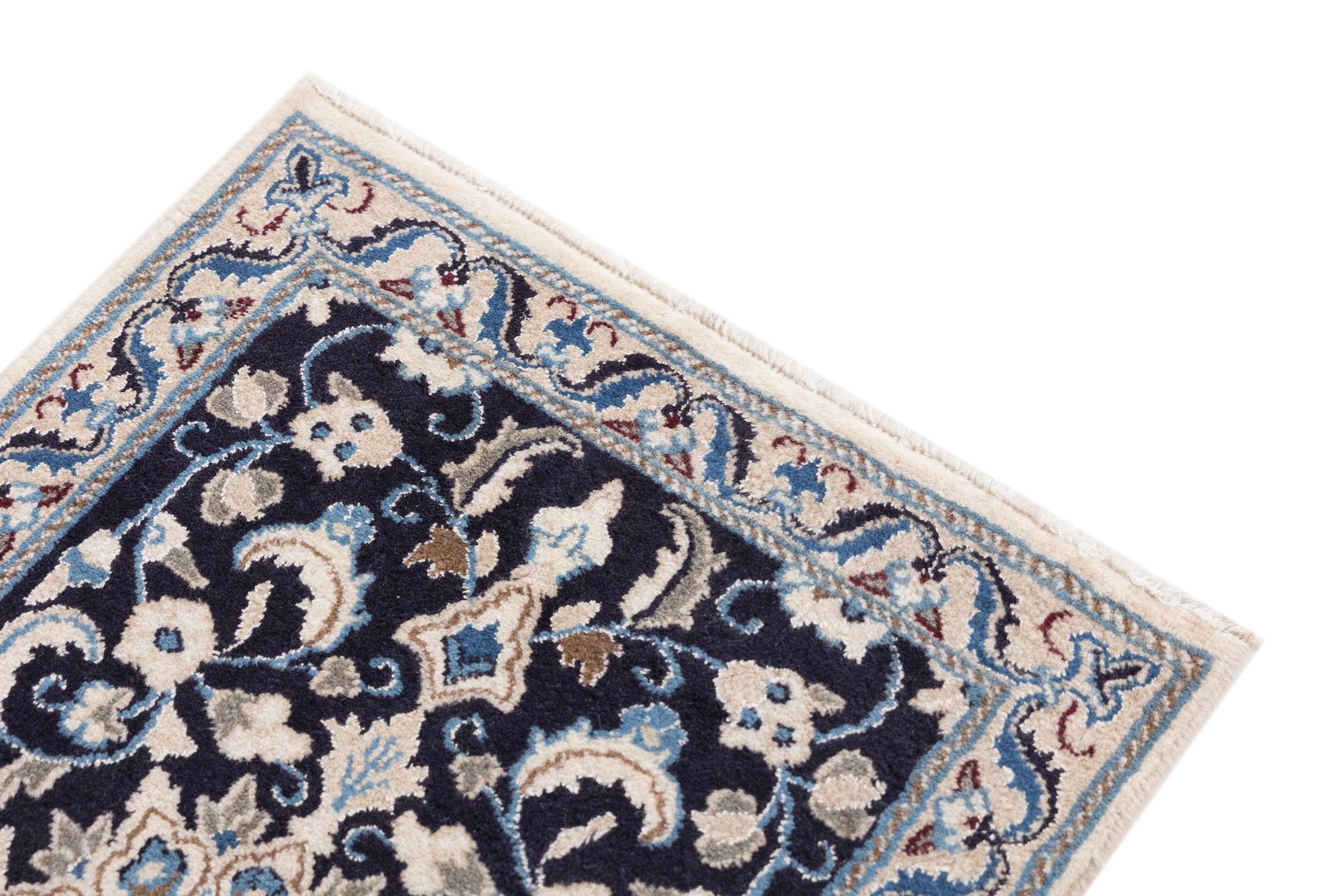Dette Nain teppet er klassifisert med 9 La. Denne flotte kvaliteten med flott orientalsk design og de kurvlinjære mønstre begeistrer enhver kjøper. Dette persiske teppet ble håndknyttet av ull og silke i byen Nain, på den vestlige grensen av Dascht-e-Kavir ørkenen.