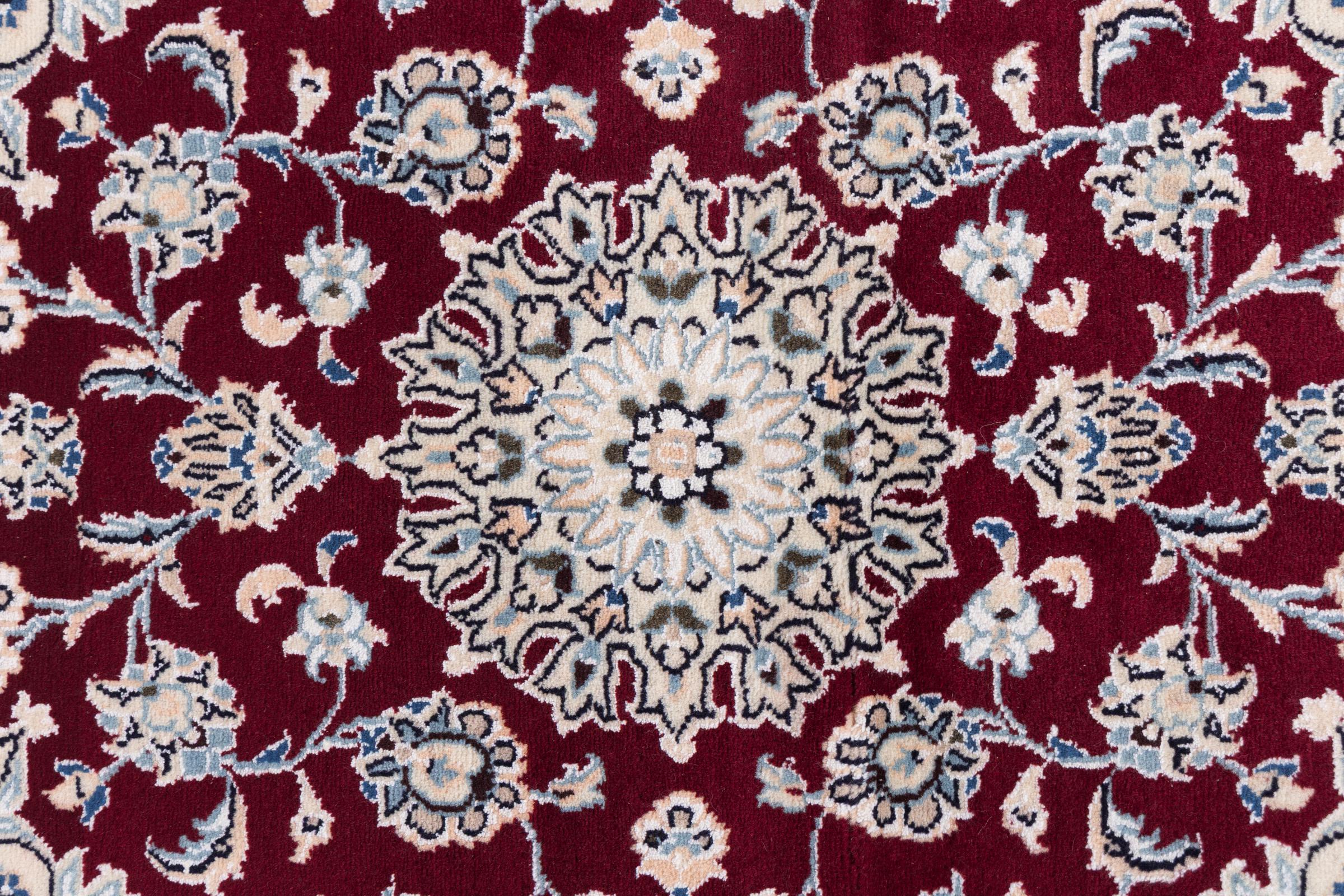 Dette Nain teppet er klassifisert med 9 La. Denne flotte kvaliteten med flott orientalsk design og de kurvlinjære mønstre begeistrer enhver kjøper. Dette persiske teppet ble håndknyttet av ull og silke i byen Nain, på den vestlige grensen av Dascht-e-Kavir ørkenen.