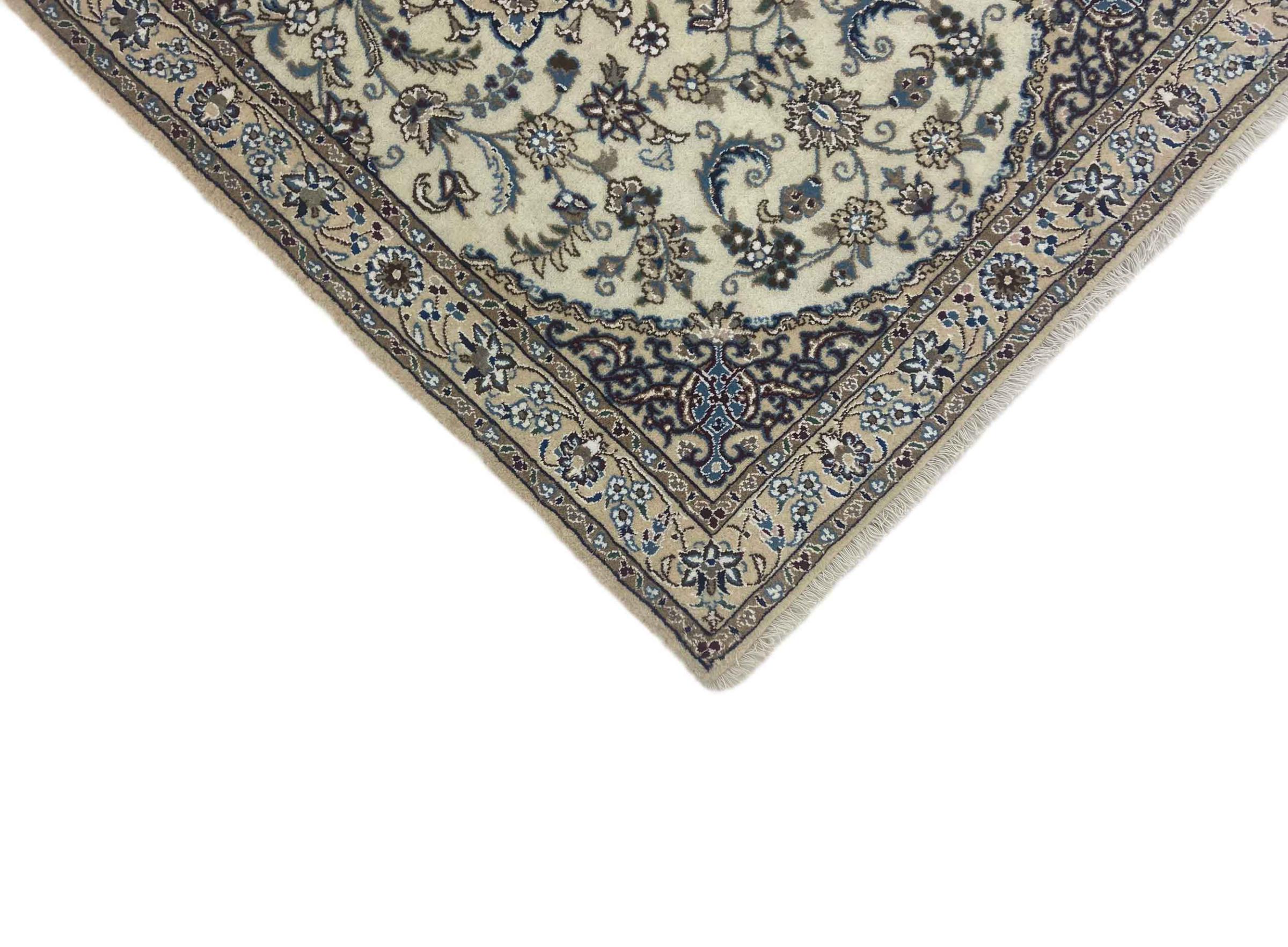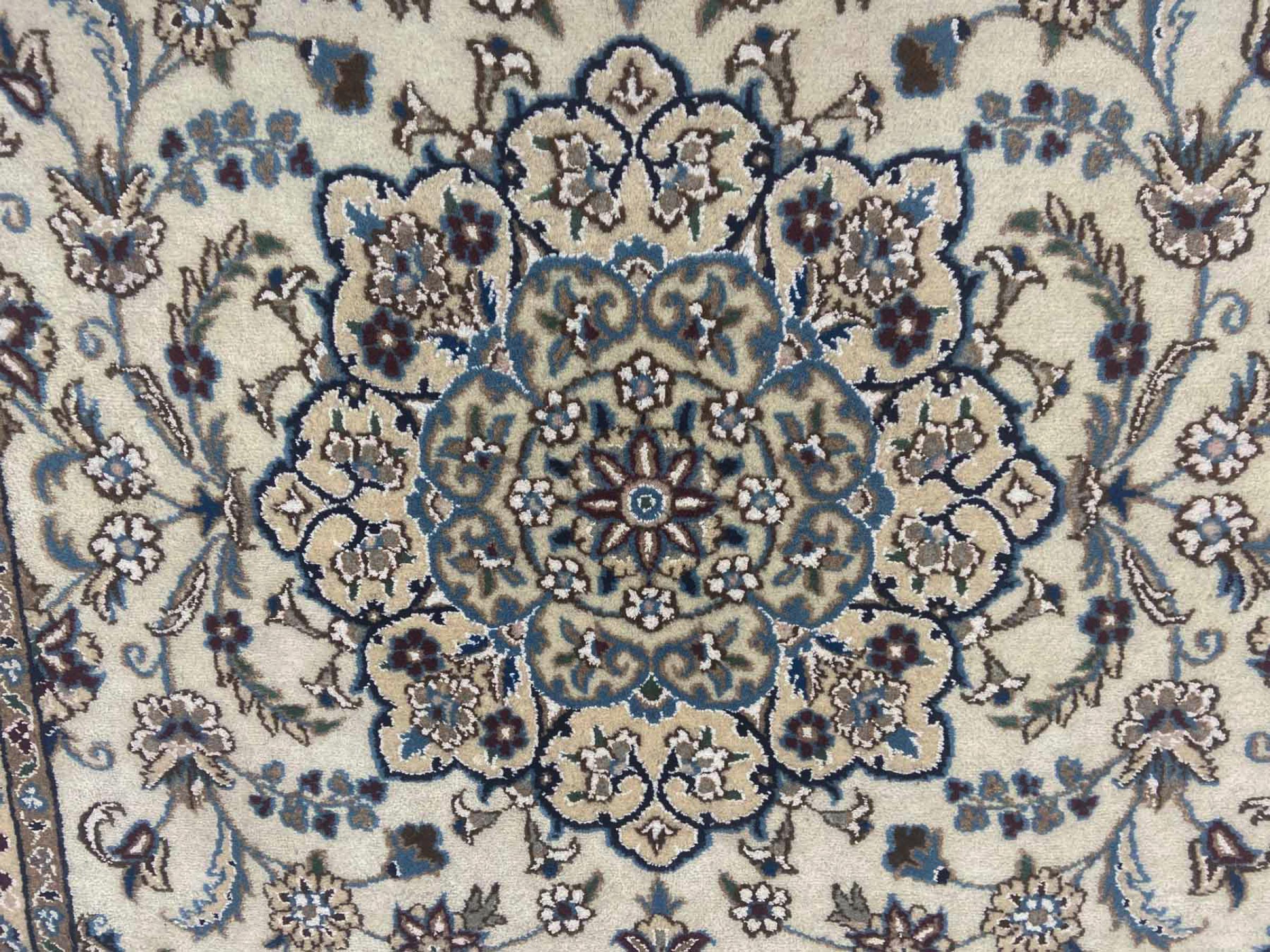 Dette Nain teppet er klassifisert med 9 La. Denne flotte kvaliteten med flott orientalsk design og de kurvlinjære mønstre begeistrer enhver kjøper. Dette persiske teppet ble håndknyttet av ull og silke i byen Nain, på den vestlige grensen av Dascht-e-Kavir ørkenen.