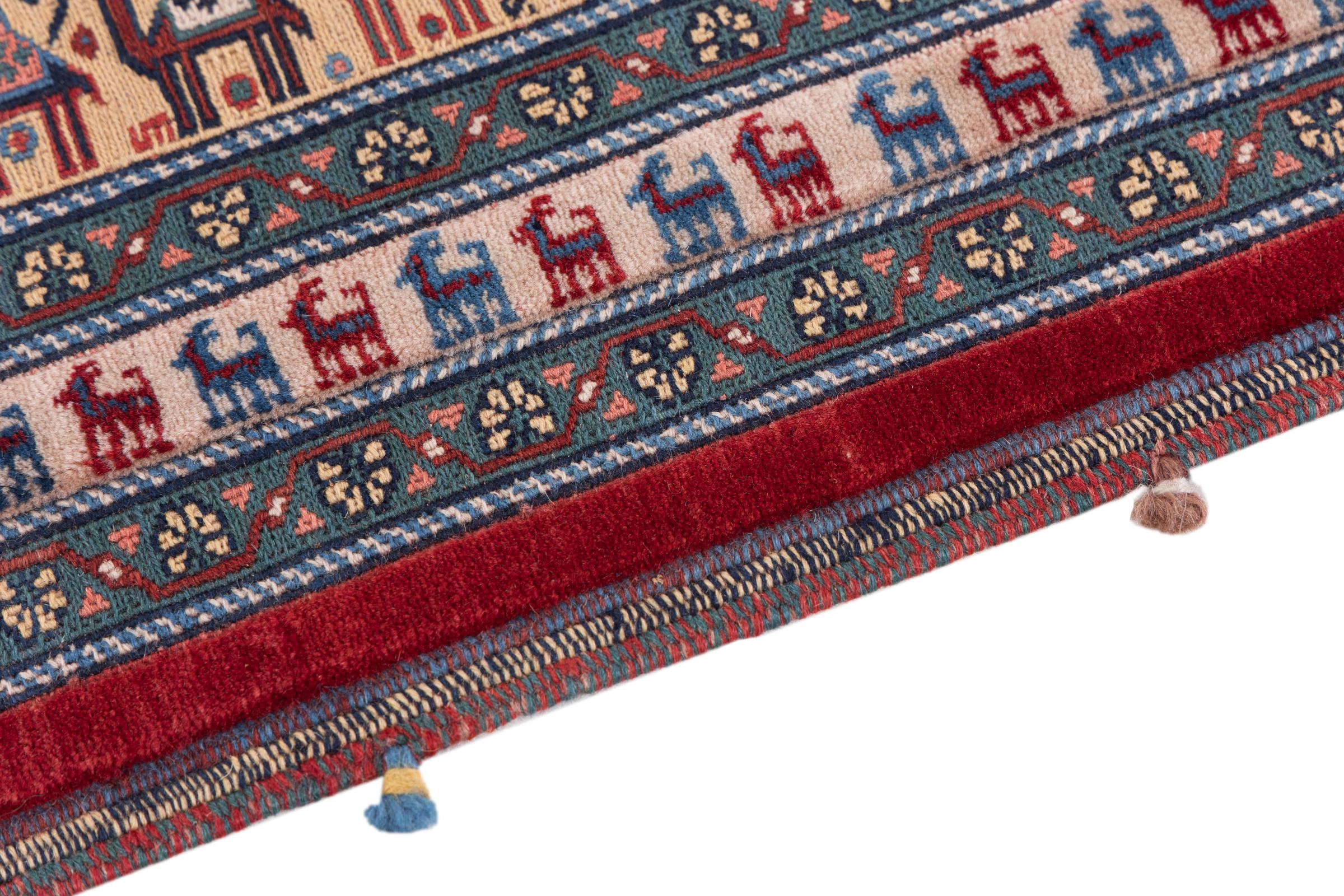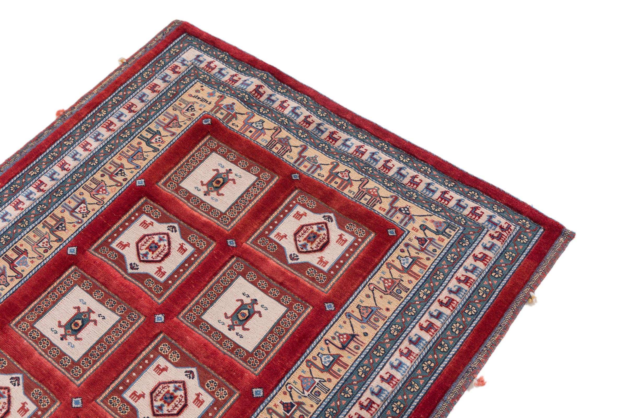 Dette håndknyttede Nimbaft er et praktfullt eksempel på kunnskap og kombinasjon av to helt ulike produksjons teknikker av orientalske tepper.