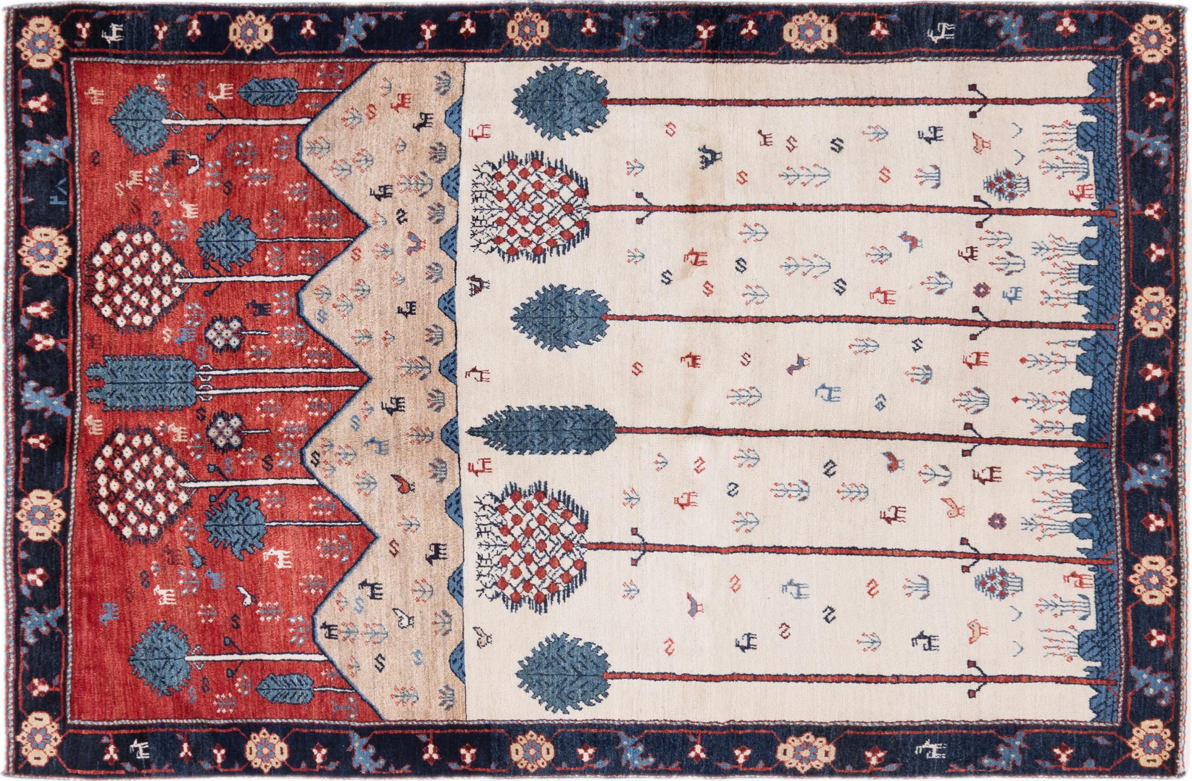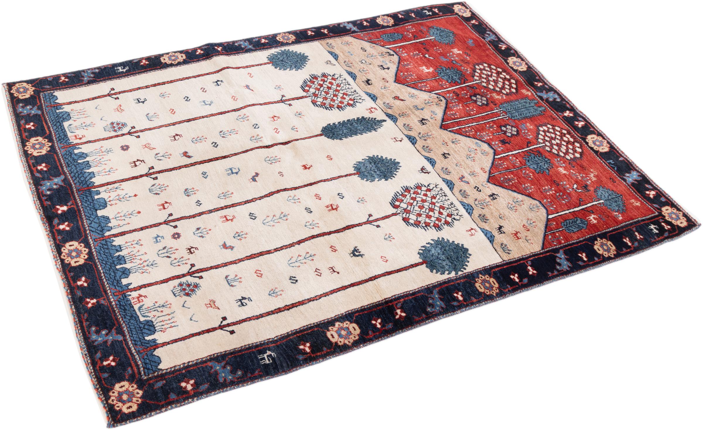 Dette vakre teppet er en persisk Gabbeh og er en av høyeste kvalitet Gabbeh-tepper. Teppene er knyttet av nomader eller seminomader i Iran ved bruk av tradisjonelt håndarbeid. De enkle motivene og mønstrene er stort sett inspirert av nomadenes umiddelbare omgivelser. For eksempel kan kameler, trær eller busker finnes på tradisjonelle tepper. Persiske Gabbeh-tepper er laget av ull fra lokale sauer. Ullen blir derfor stort sett spunnet for hånd. Hver av disse orientalske teppene har en unik karakter av århundrer gammel kultur.