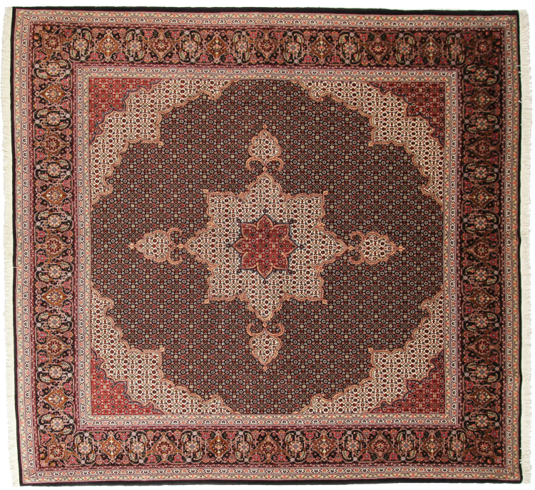 Teppenummer: 70590026515 Størrelse: 218x205 cm Tykkelse: ca. 7 mm Knuter: 450 000 - 500 000 / m² Bearbeiding: Knyttet for hånd Søm: Ull med silke Kjede: Bomull Opprinnelse: Persia / Iran Alder: Nytt Vekt: ca. 13 kg Også kjent som Tabriz, Tabris, Täbris, Tebriz, Tebris, 40Raj, 50Raj Antall på lager: Unikt - Kun 1 stk i lager