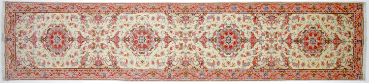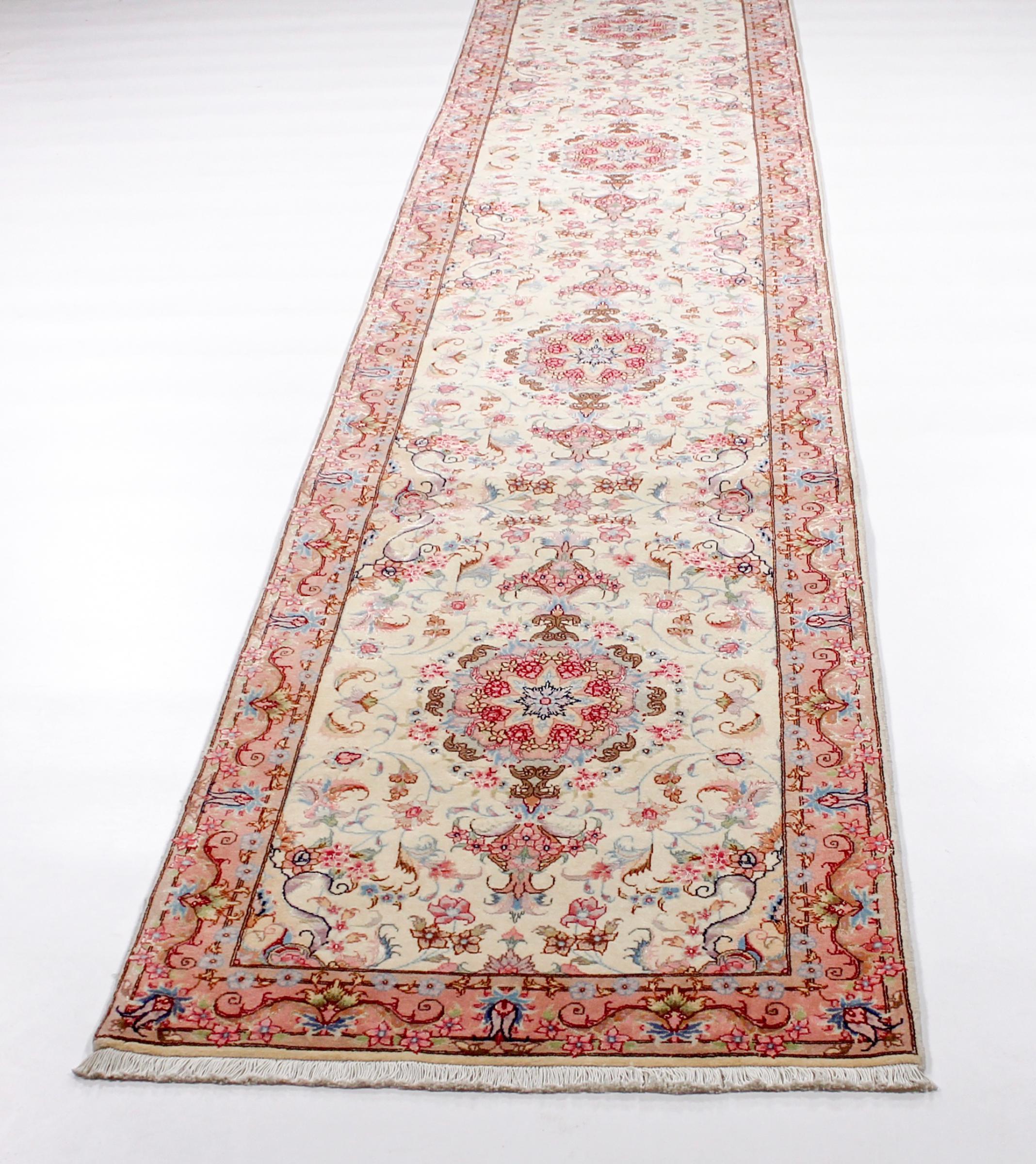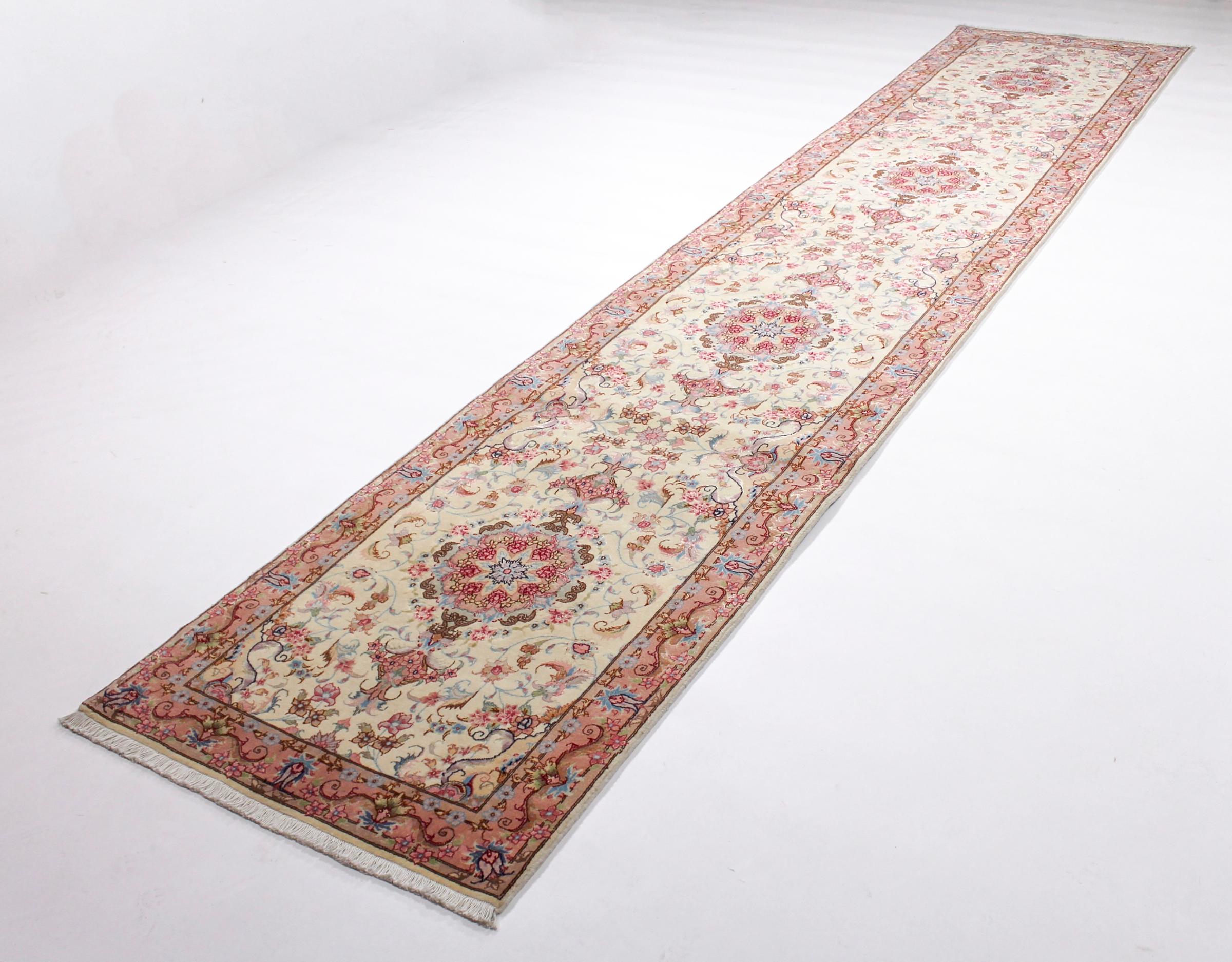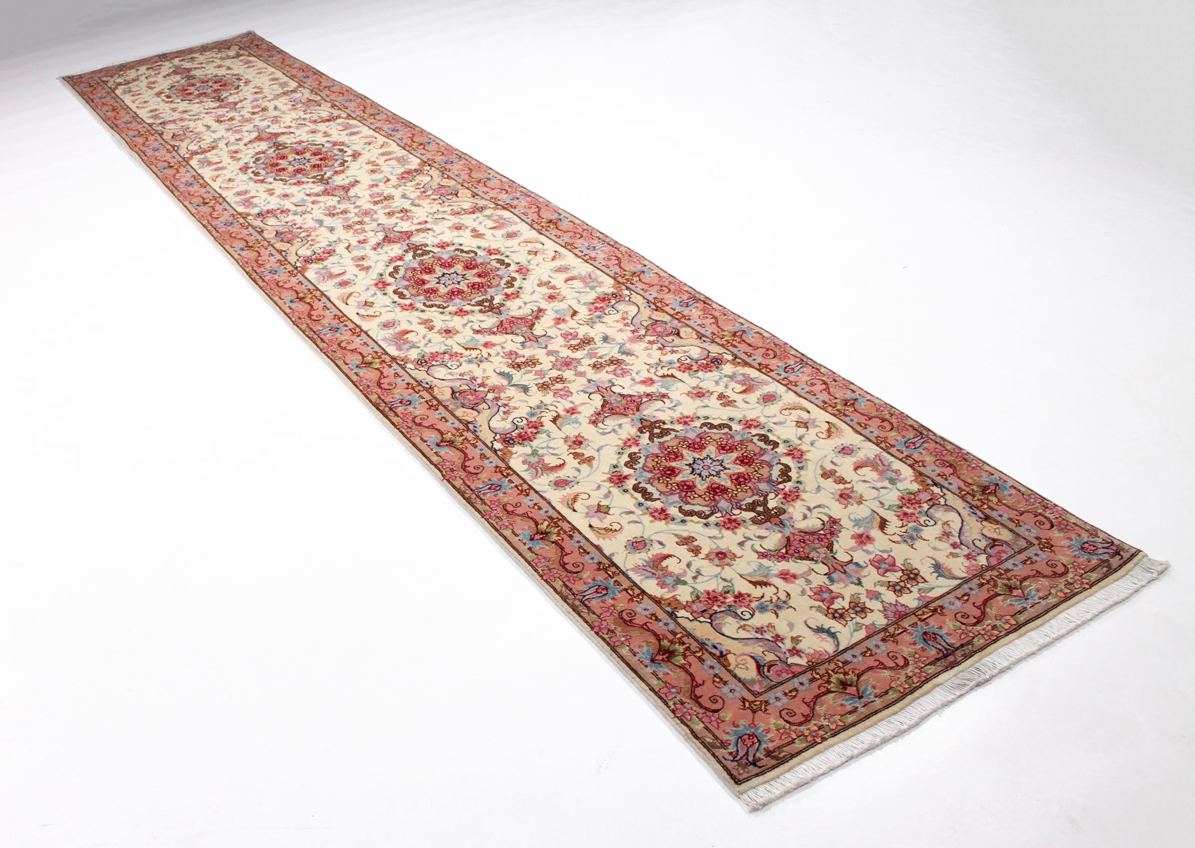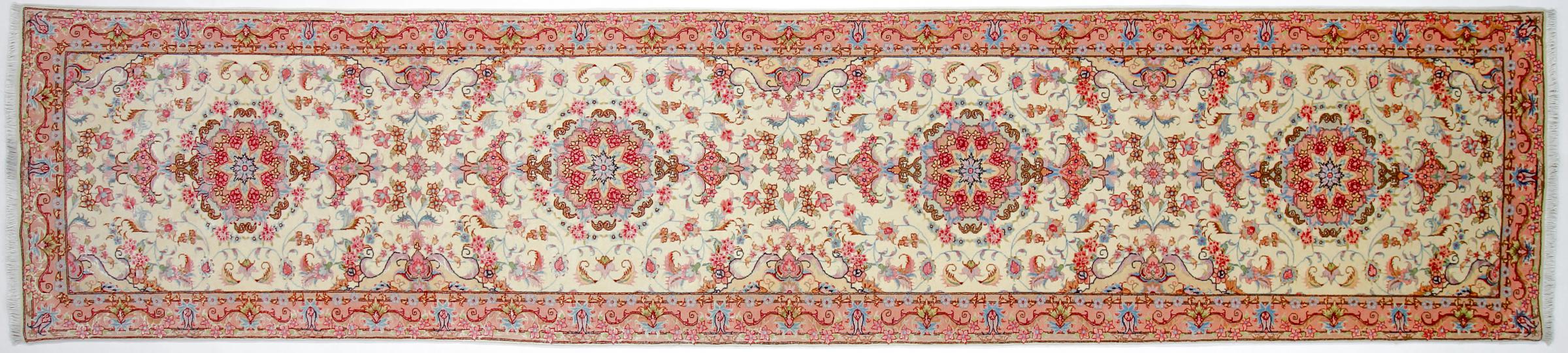 Teppenummer: 12108900162740 Størrelse: 423x85 cm Tykkelse: ca. 7 mm Knuter: 500 000 - 550 000 / m² Bearbeiding: Knyttet for hånd Søm: Ull med silke Kjede: Bomull Opprinnelse: Persia / Iran Alder: Nytt Vekt: ca. 11 kg Også kjent som Tabriz, Tabris, Täbris, Tebriz, Tebris, 40Raj, 50Raj Antall på lager: Unikt - Kun 1 stk i lager