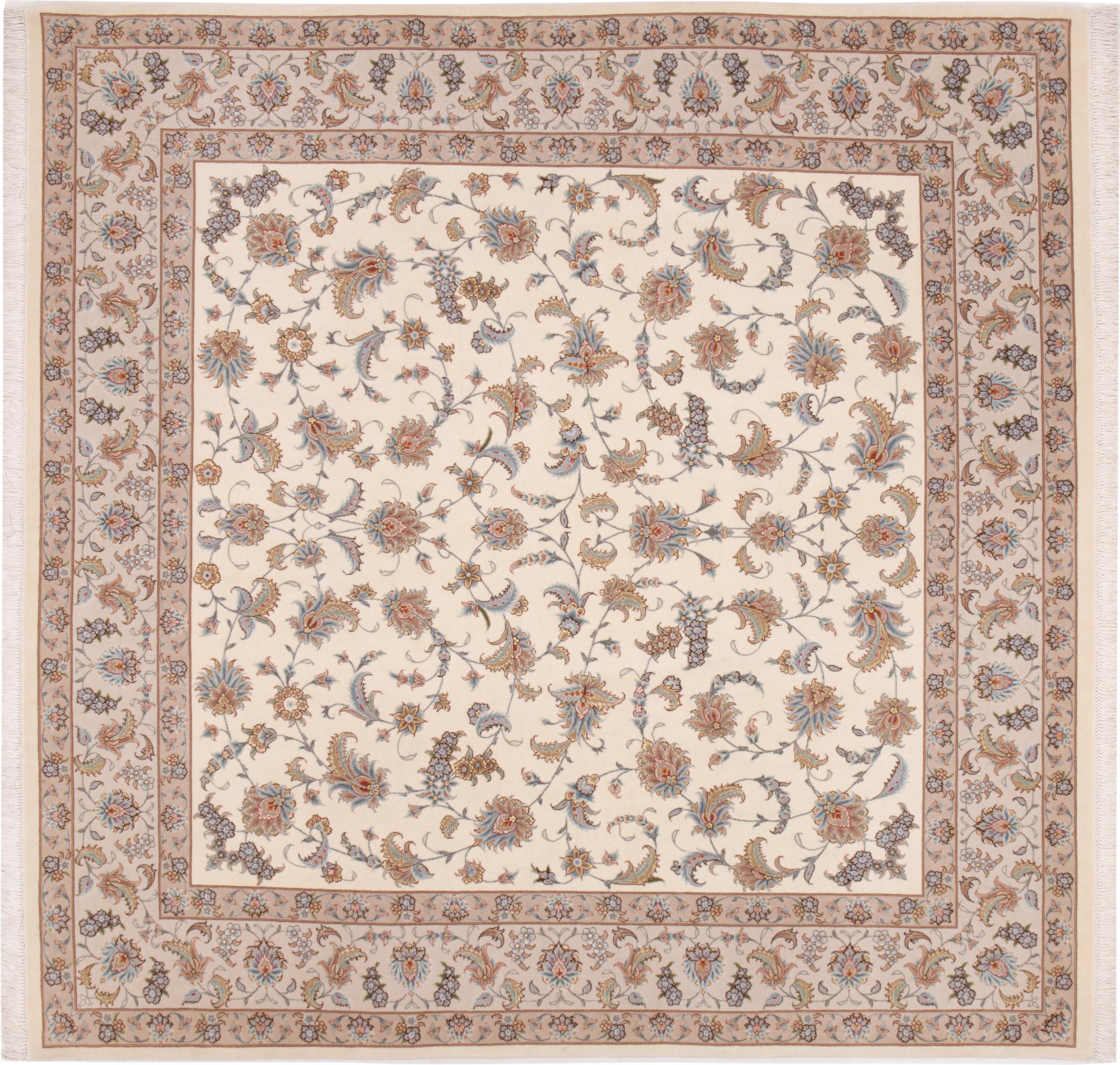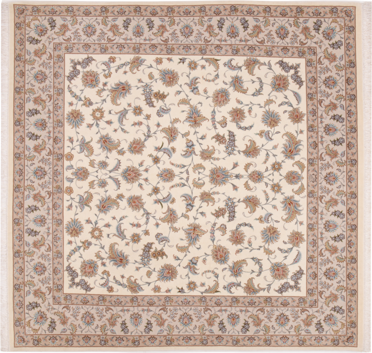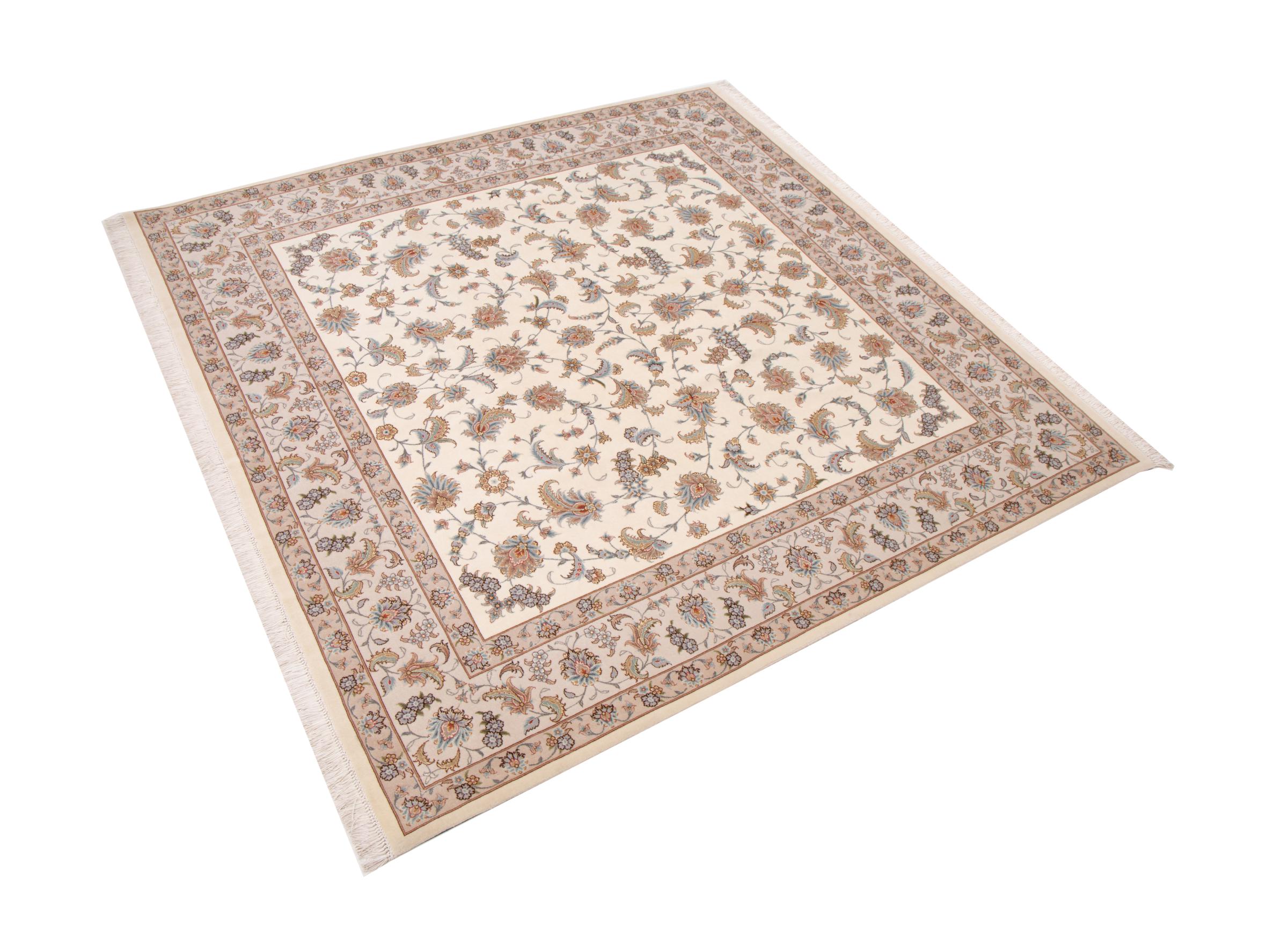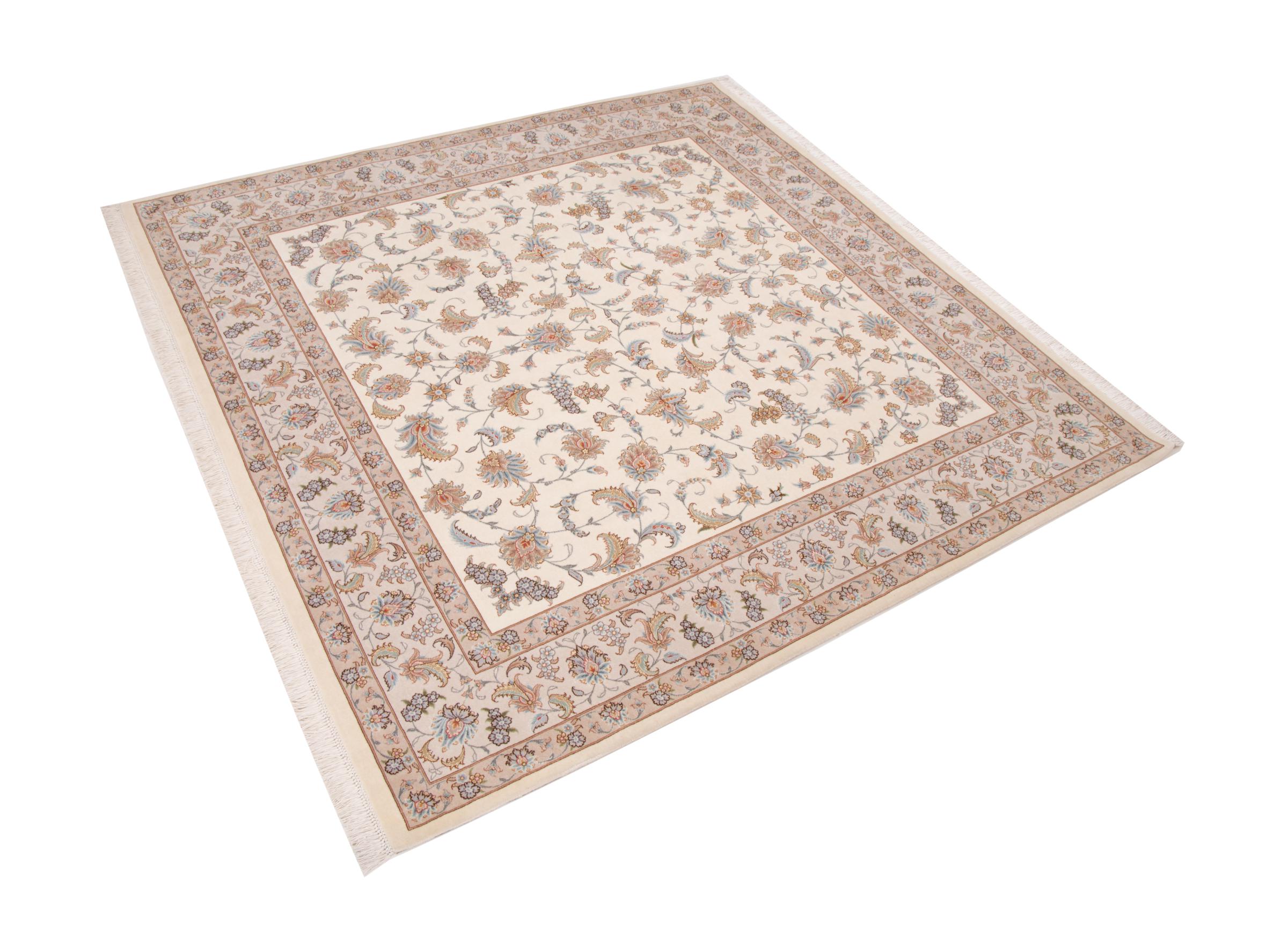 Teppenummer: 29302000574975 Størrelse: 209x202 cm Tykkelse: ca. 7 mm Knuter: 440 000 - 490 000 / m² Bearbeiding: Knyttet for hånd Søm: Ull med silke Kjede: Silke Opprinnelse: Persia / Iran Alder: Nytt Vekt: ca. 13 kg Også kjent som Tabriz, Tabris, Täbris, Tebriz, Tebris, 40Raj, 50Raj Antall på lager: Unikt - Kun 1 stk i lager